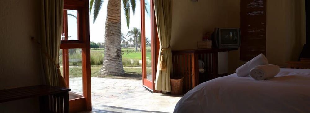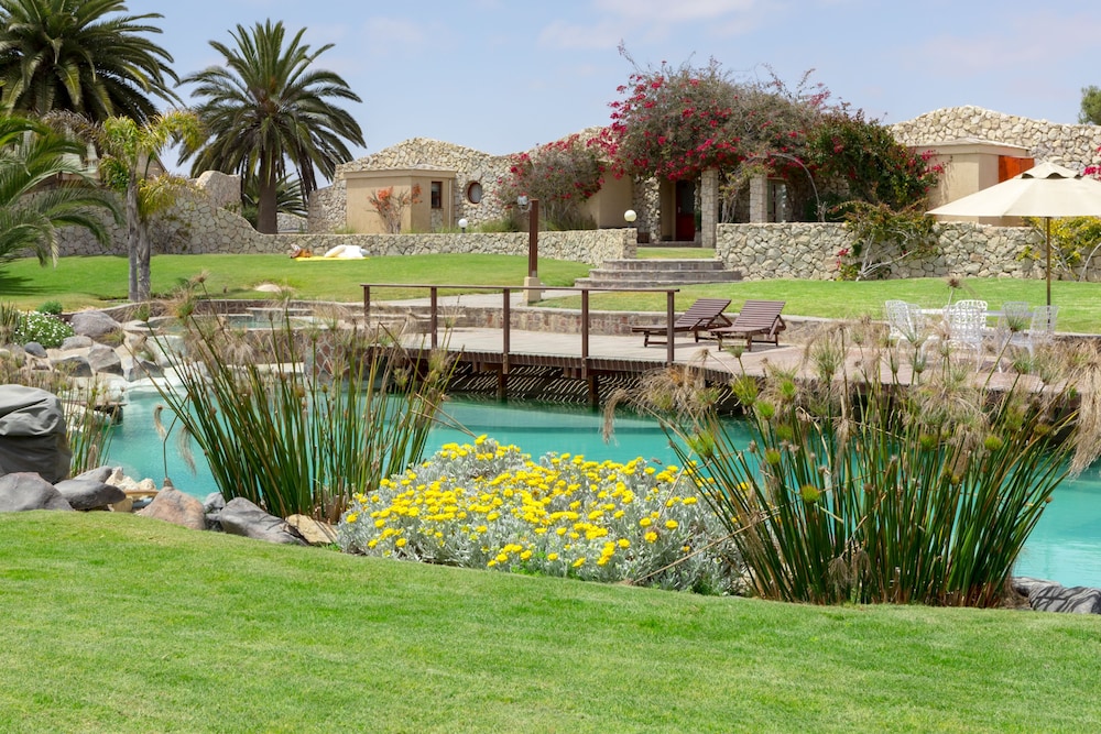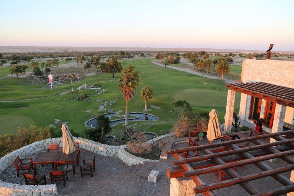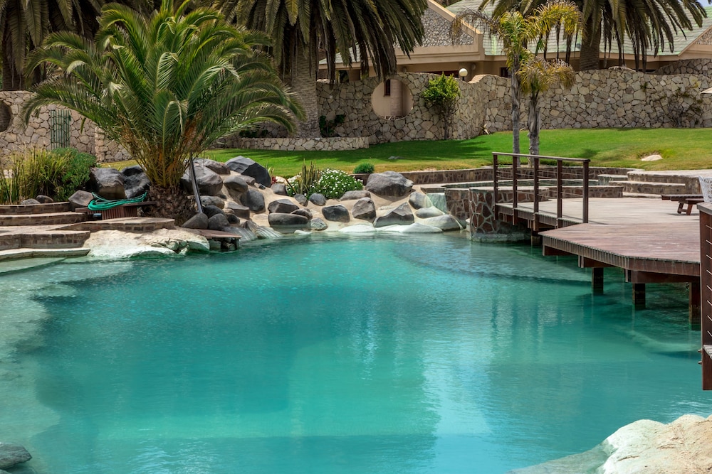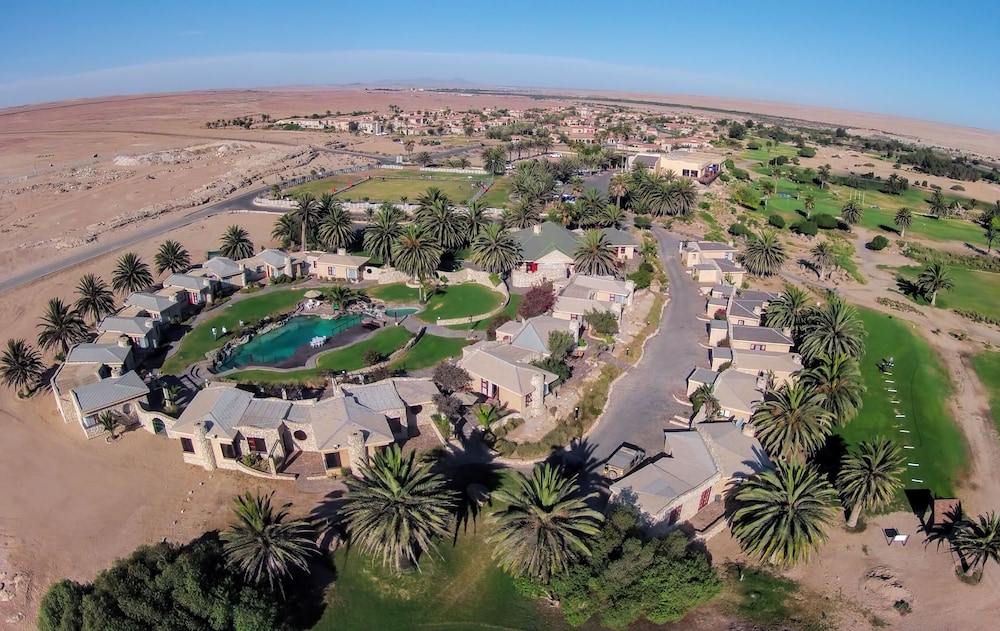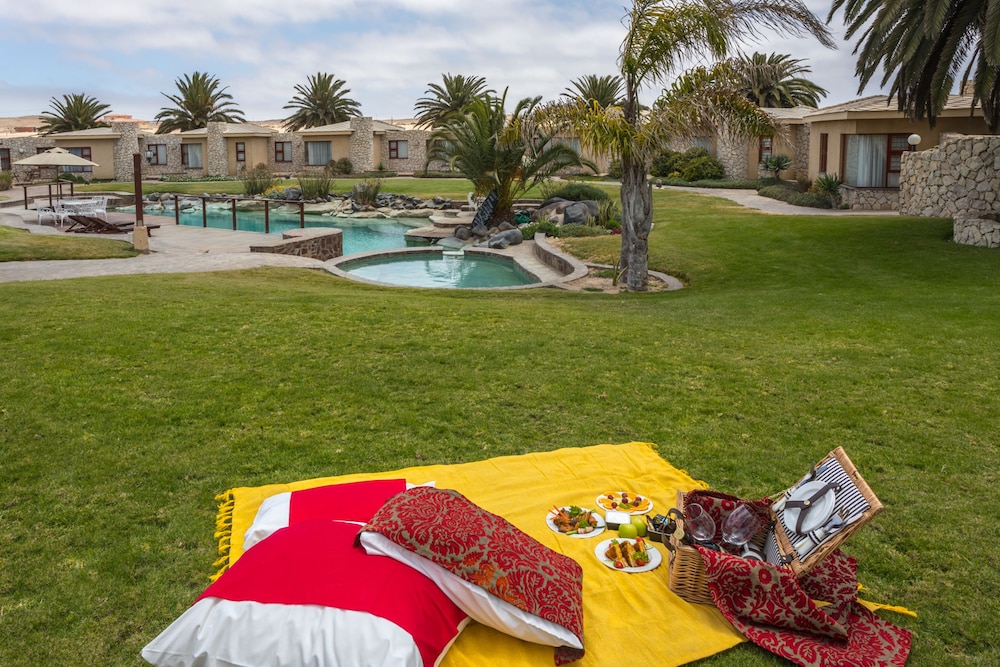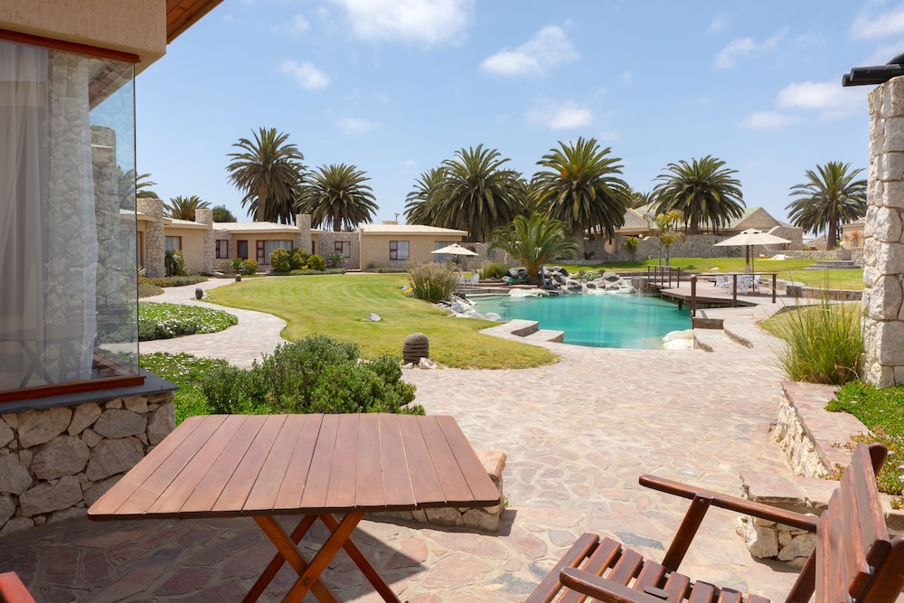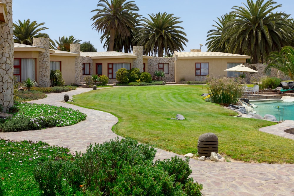 Surprisingly nice stay in Rossmund Lodge near Swakopmund, easily reached from the new Highway between Walvis Bay and Swakopmund. Our cabin was spacious, clean, had a big bath with bathtub and shower, a little dressing area with a refrigerator, cups and glasses for tea or coffee, and a hot water cooker. The beds were comfortable, a fan was supplied for added comfort during hot weather. In addition a little patio with a small table and chairs complimented the arrangement. We did not use the pool, but it looked clean. Breakfast was included in the price, it was usually bread , jam, some cold cuts, cheese, any form of eggs with bacon and sausage, if desired. All in all a pleasant experience. The personnel was always friendly and helpful.The Golf resort also had a restaurant where we often had lunch, also highly recommended.