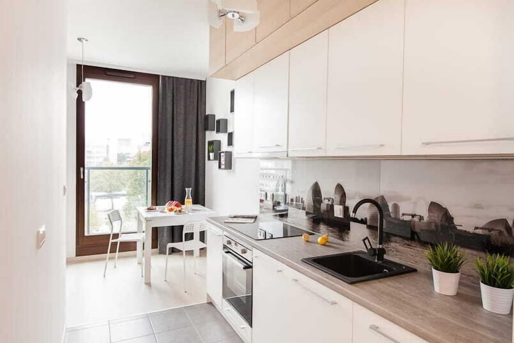 This is really an apartment, not what I would call an aparthotel. The apartment is new and nice, but the lack of AC is a significant drawback during hot days. There plenty of restaurants and shopping in walking distance. The part that we didn’t like was the less than perfect communication for non-Polish speakers. I recommend the owners to provide clear instructions on how to enter the building and the apartment (the menu at the interfon is only in Polish). The instructions should also make it cleat that garbage won’t be taken out, etc. All in all, the experience can be good, if the communication is improved.