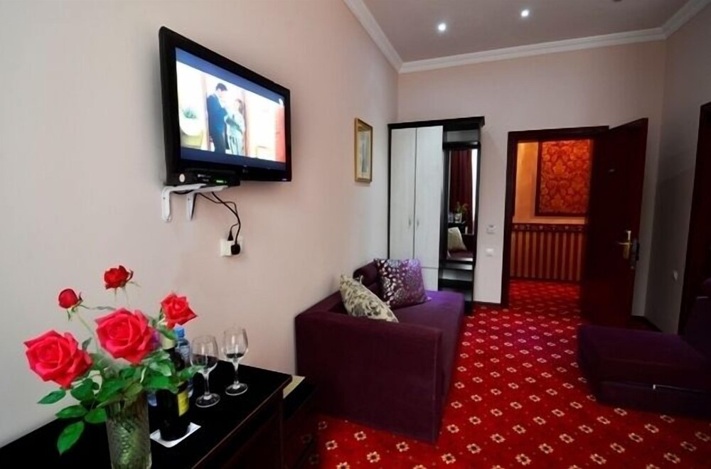 Our room was a two room suite at the end of building 3. I don't recall asking for a suite, nor were we upgraded, so I guess this is what was available at booking time. The room was spacious, quiet and clean, with a little balcony that was well shaded. Great space for reading after a massage. No special in room amenities except for the aforementioned robes, which were roomy and thick. We loved them. Breakfast was not the best one we had on our trip, but it was OK. It suffered from a lack of the fresh fruit that was abundant in the other places we stayed and the coffee was weak. There was however a large selection of meat and cheeses on the buffet. Dinner at the top floor restaurant afforded a great view, a good wine list, and Georgian food that was about average. To be honest, all in all I found the place to be very kitschy and endearing. For the price we would stay here again.