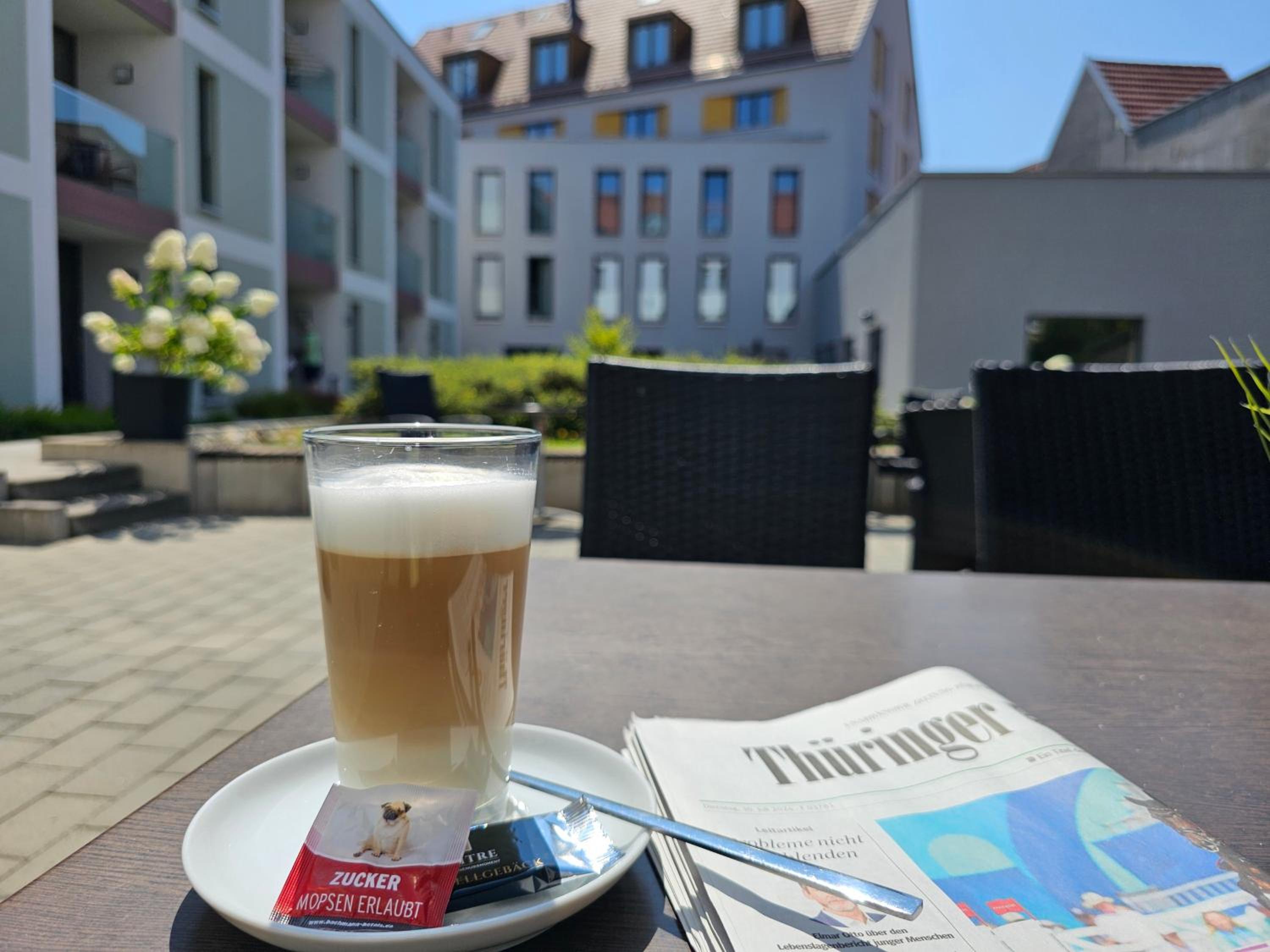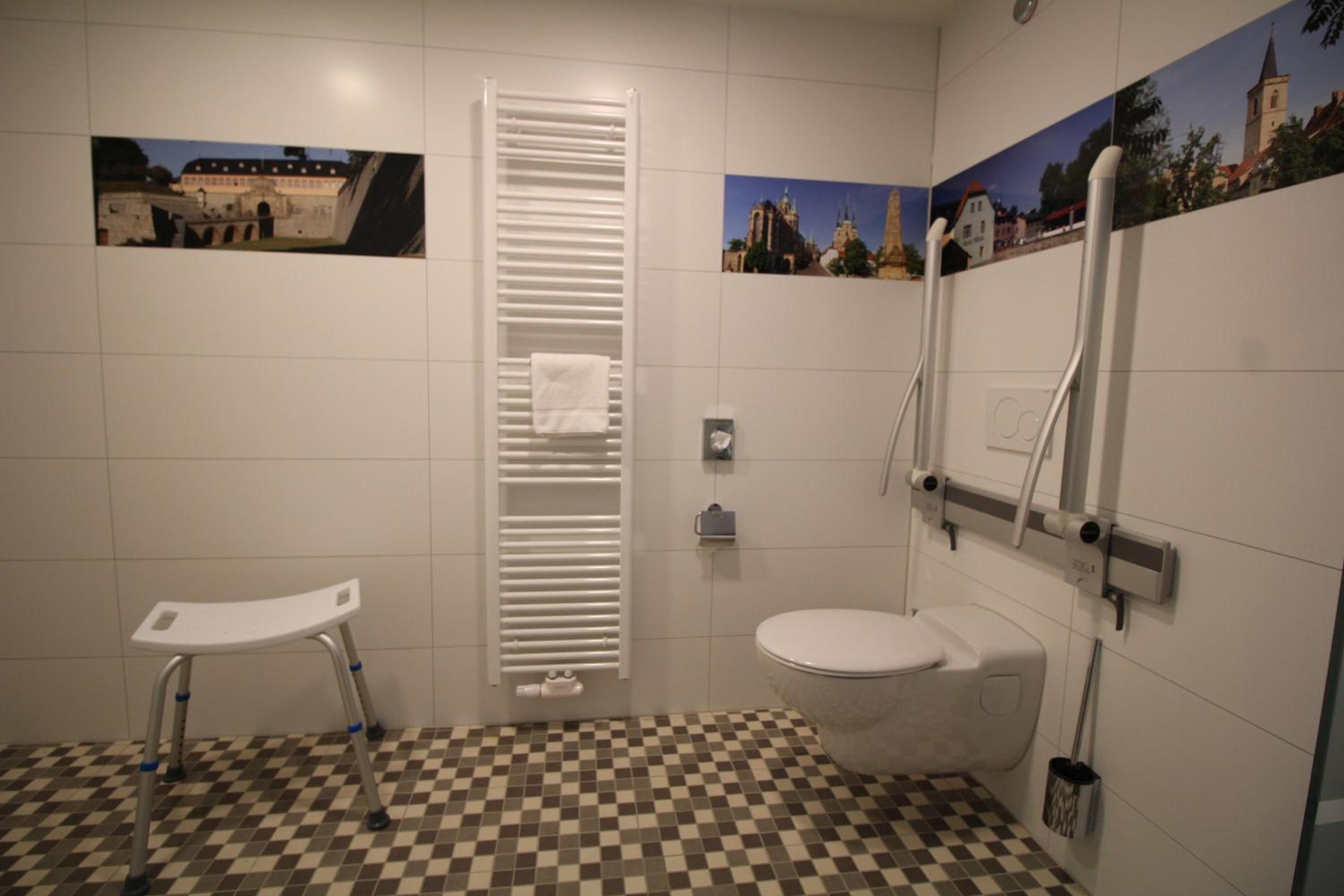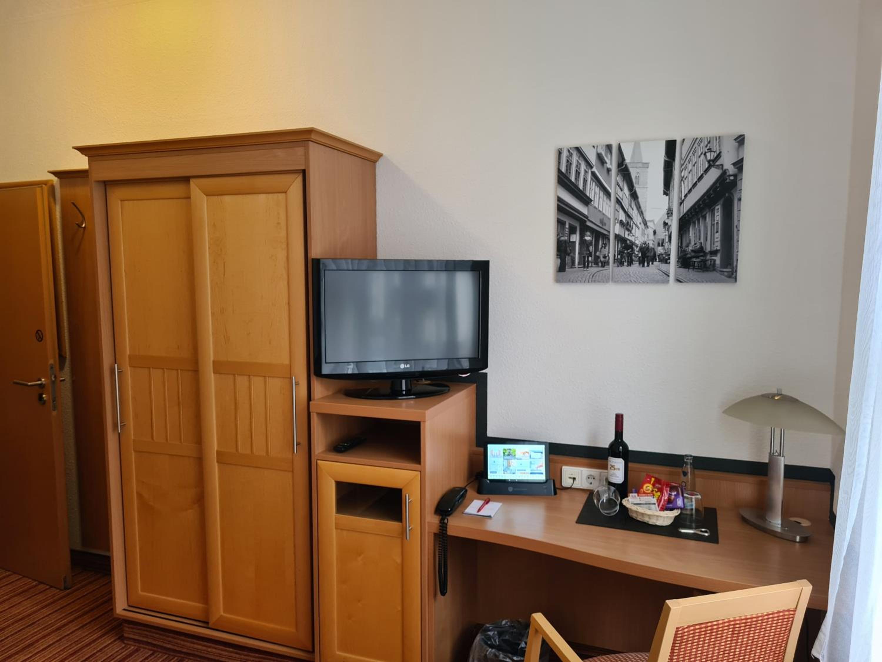 Die Lage des Hotels ist toll, gleich hinter der Krämerbrücke! Interessante Sehenswürdigkeiten sind gut zu Fuß zu erreichen. Zur Straßenbahnstation ist es auch nicht weit. Rundum sind empfehlenswerte Lokale zur Einkehr. Unser Zimmer war sehr sauber, zweckmäßig ausgestattet, alles wirkte sehr neu. Im Frühstücksraum herrschte ein angenehmes Klima. Es gab ein reichliches Buffet. Das Personal war rund um die Uhr überaus freundlich.