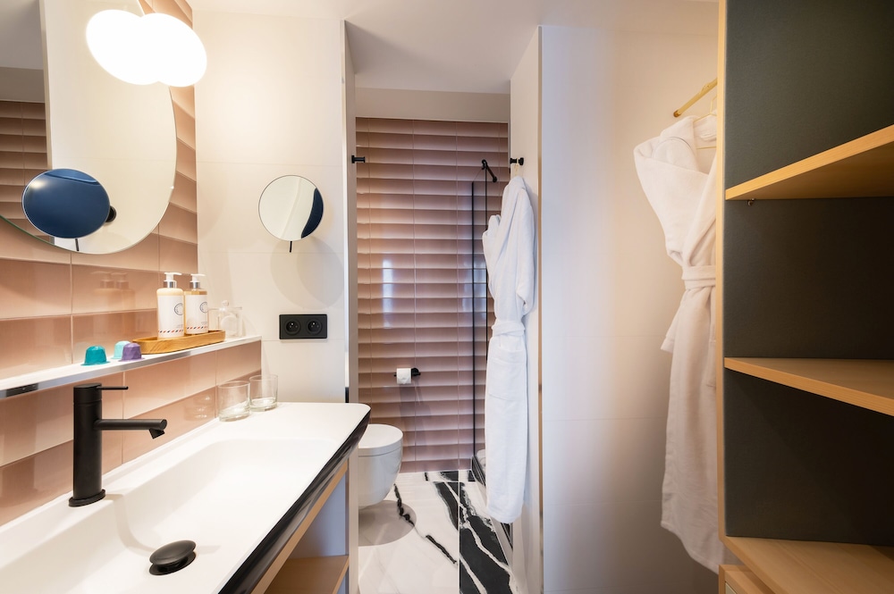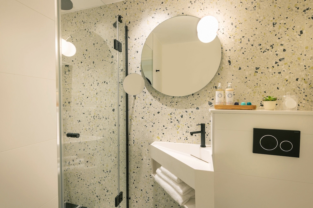 Lovely wee hotel - compact! Lovely design and made feel welcome. Close to fab neighbourhood bakery Mamiche, and walking distance to centre of town and mooching around the Canal area. Rooms are small, two people would be very cosy, and also it wouldn't be that comfy for working from the small desk/stool area. Nespresso machine in every room and fizzy/ still water. Cups weren't cleaned each day etc, so lower score for cleanliness. But overall, definitely recommended.