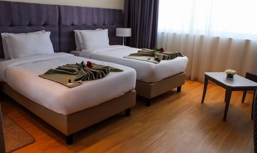 Our room was spacious and we liked it at first. Unfortunately, the service was non- existent. First day, our room had no hot water, which we discovered after we got into the shower. On the second day, it was “cleaned” but the floors stayed filthy, the washroom counter was still pink and sticky from the accidental spill of my cough syrup the day before . The third day we found the room without any towels at all. It took us 4 calls and/or visits to the reception and over two hours to get the towels. Even the number to call the reception was obscure (2036, lol !!!) and not written anywhere so we had to physically go down to ask.