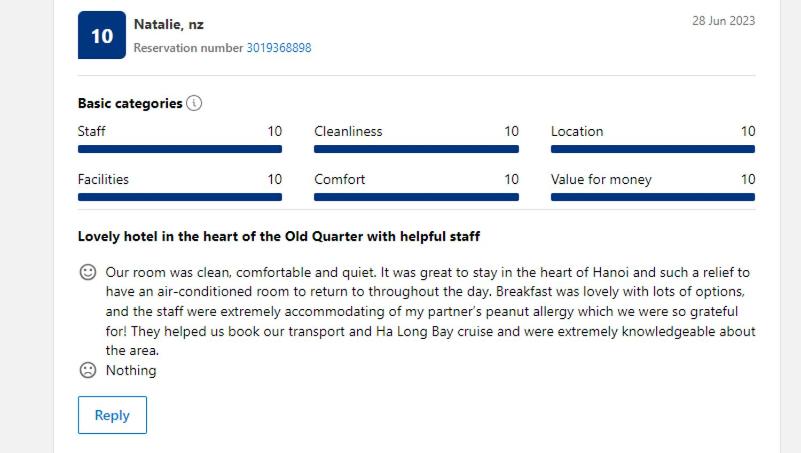 Struttura in ottima posizione per visitare le principali attrazioni della città. Abbiamo apprezzato molto la colazione. Personale gentile e disponibile. Ringraziamo soprattuto Chloe per la sua gentilezza e professionalità. Tramite l’hotel abbiamo inoltre prenotato l’esperienza di due giorni e una notte a Sapa che consigliamo tantissimo!