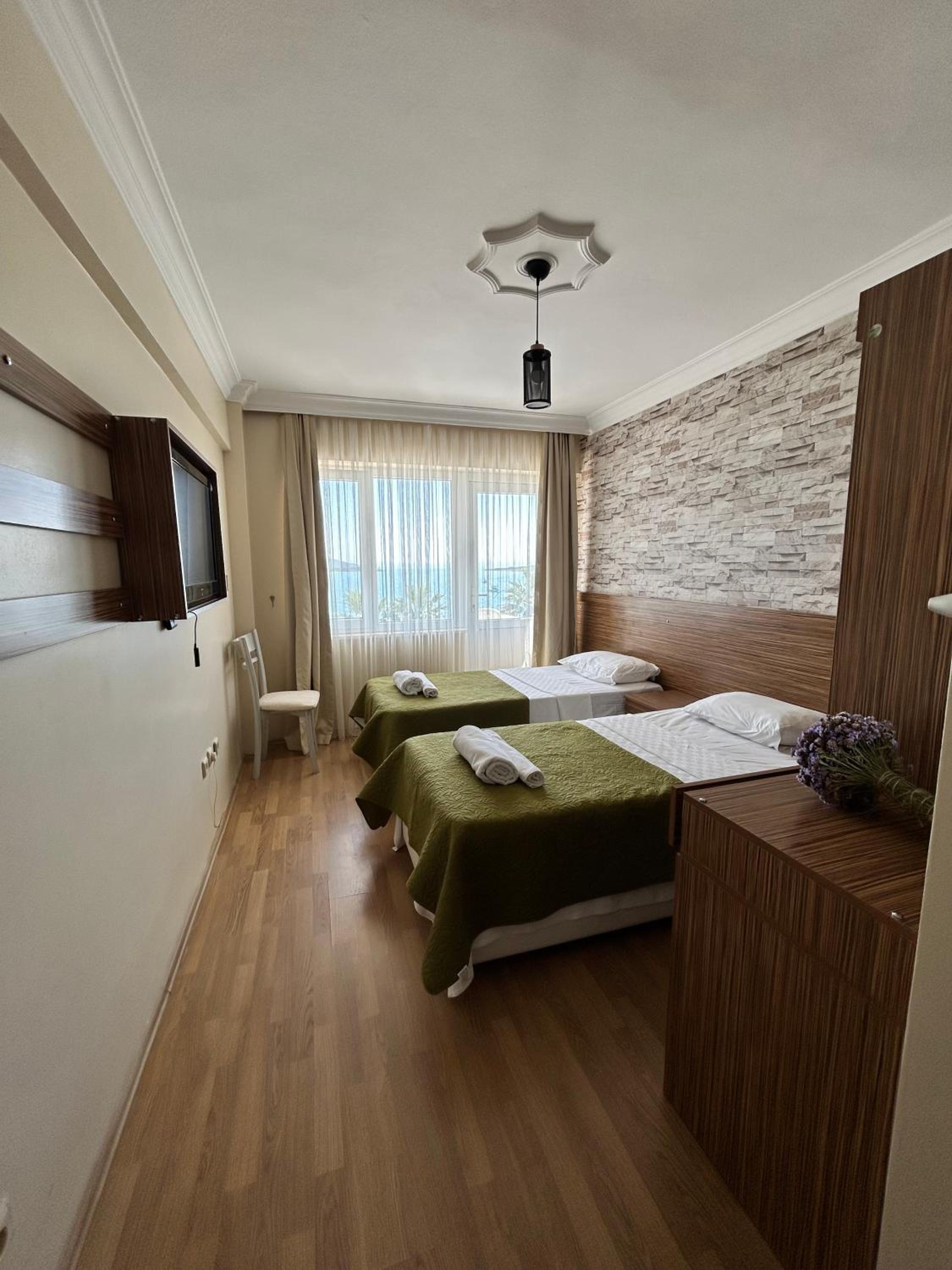 odalar çok temizdi, beachte hizmet çok güzel ve şezlonglar, şemsiyeler gayet yeterliydi. çalışanlar çok yardımcı oluyorlar her konuda. otel sahipleri çok yardımcı ve güleryüzlü insanlar. denizi tamamen kumdan oluşuyor ve iskelesi olması da artısıydı. havuzu da gittikçe derinleşen gayet yeterli ve temiz bir havuzdu. yalnızca kahvaltı çeşitliliği bir miktar artırılabilir.