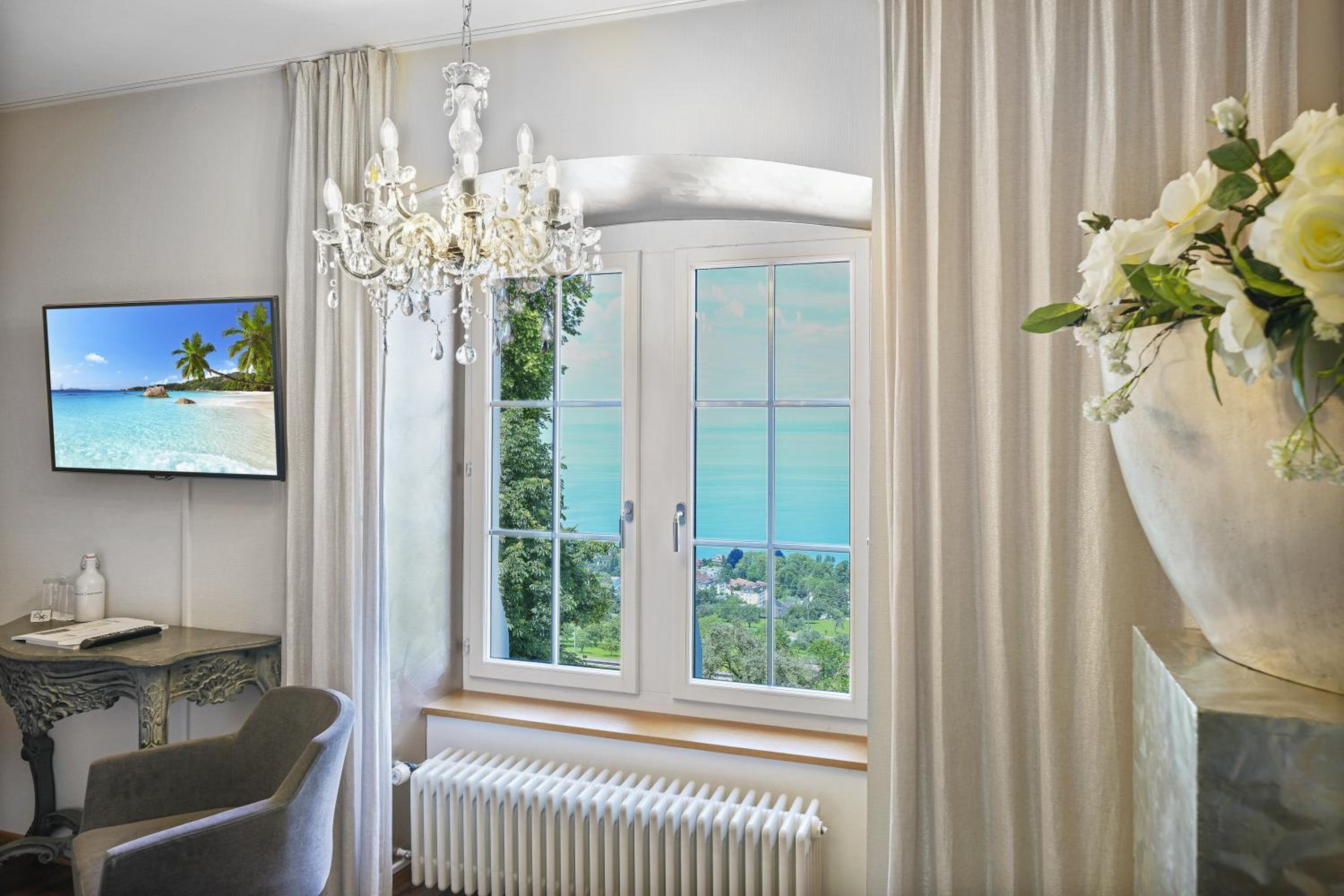 Discover the enchanting Schloss Wartensee, a picturesque hotel surrounded by lush gardens and a charming chapel, offering breathtaking views of Lake Constance.