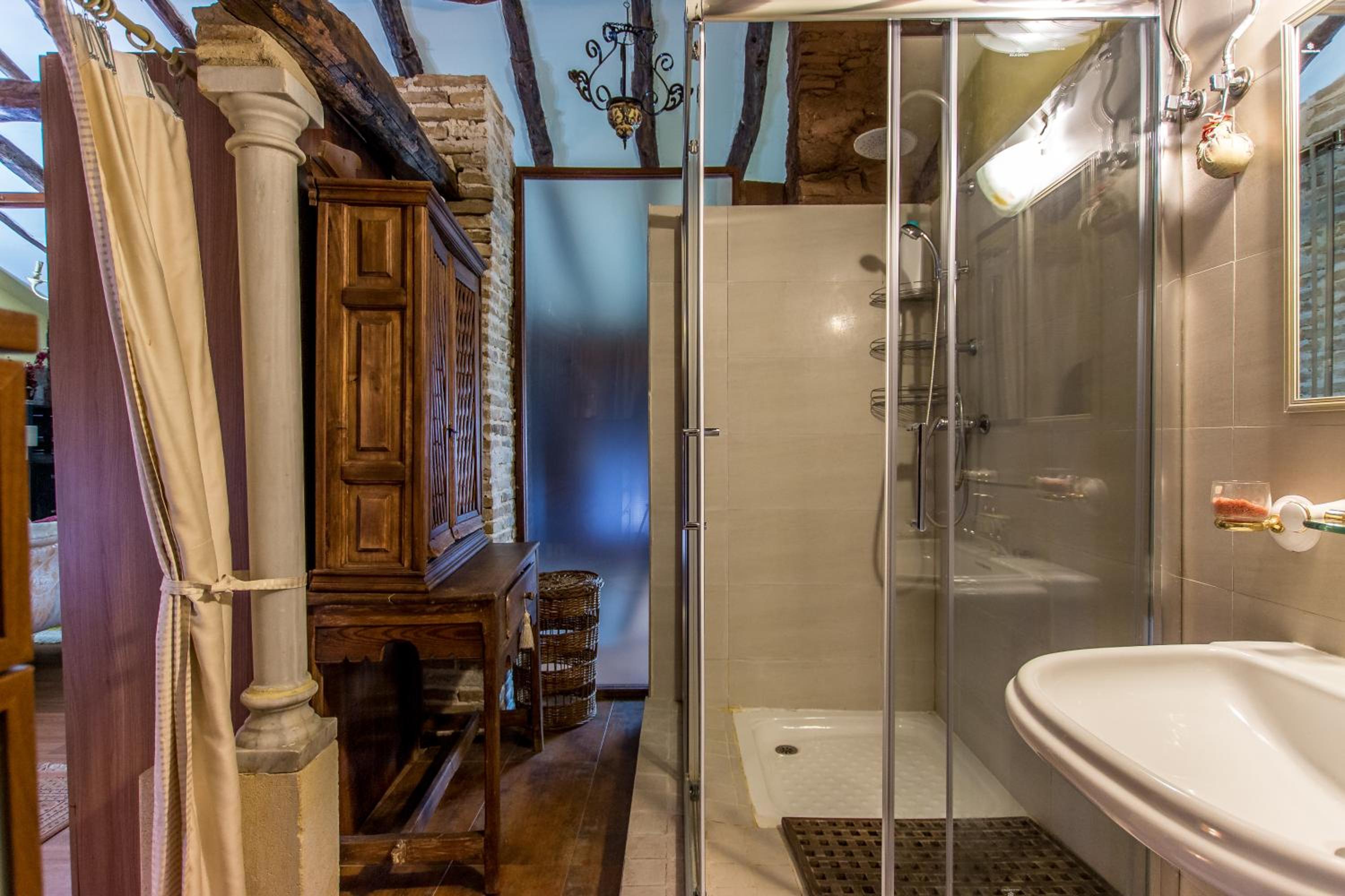 El baño esta abierto a la habitación, hemos quitado la alcachofa para que salga agua,tiene un patio interior bonito con barbacoa, lastima el olor a tabaco que habia es todas las zonas comunes, uno que no es fumadores es lo primero que percibe