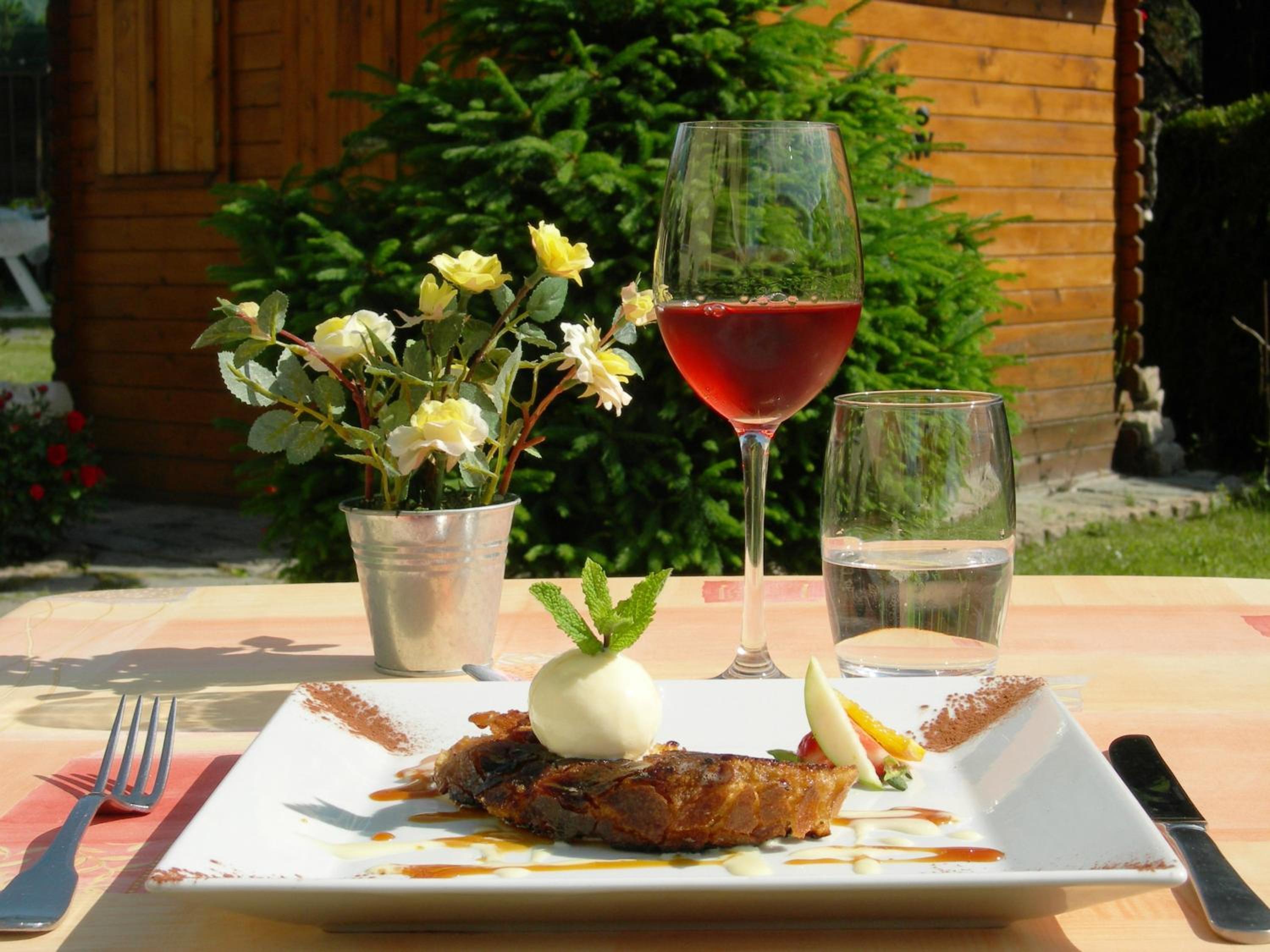 Indulge in delicious traditional cuisine at the on-site restaurant, whether in the charming dining room or al fresco in the shaded park or terrace during the summer months.