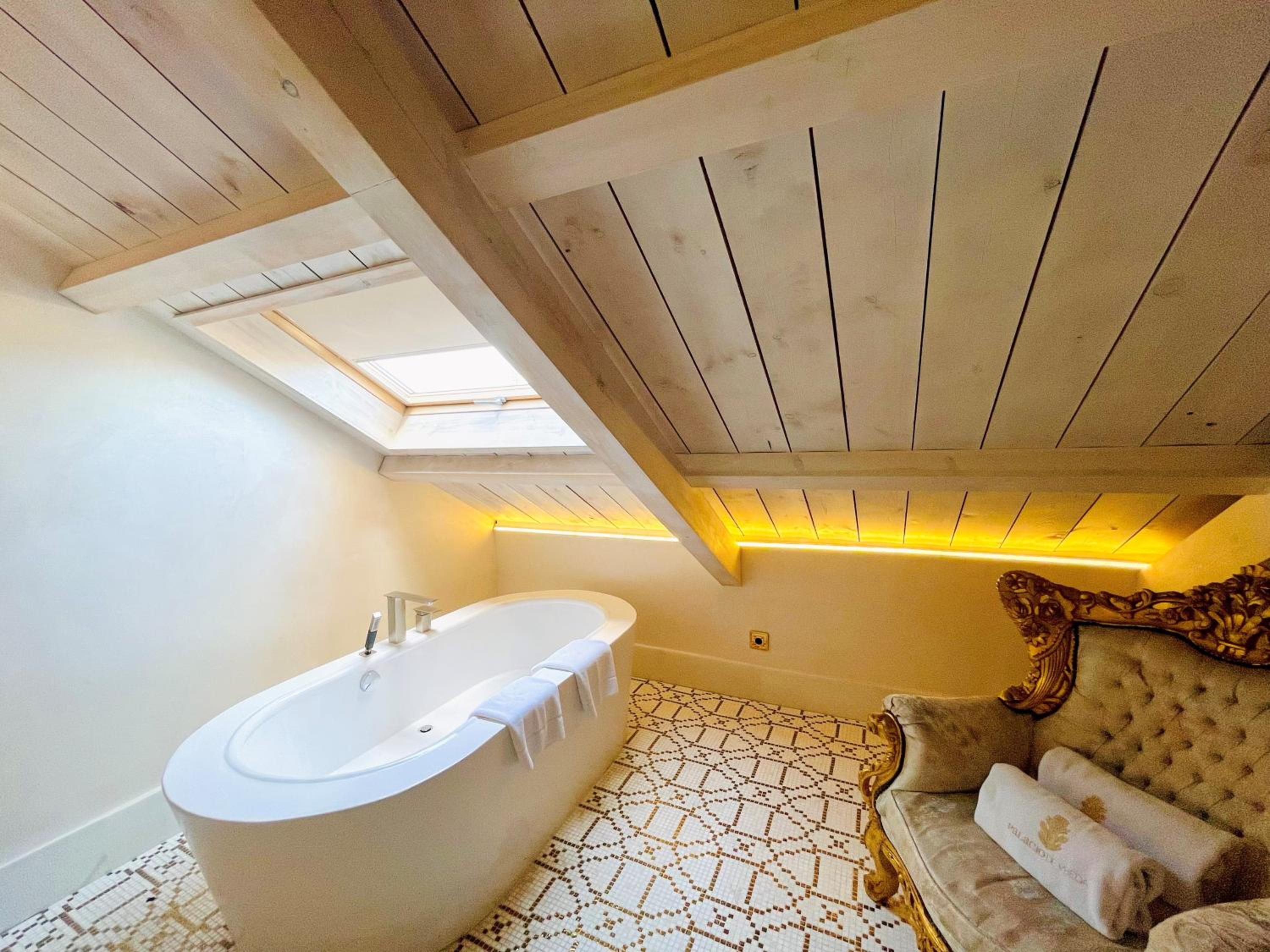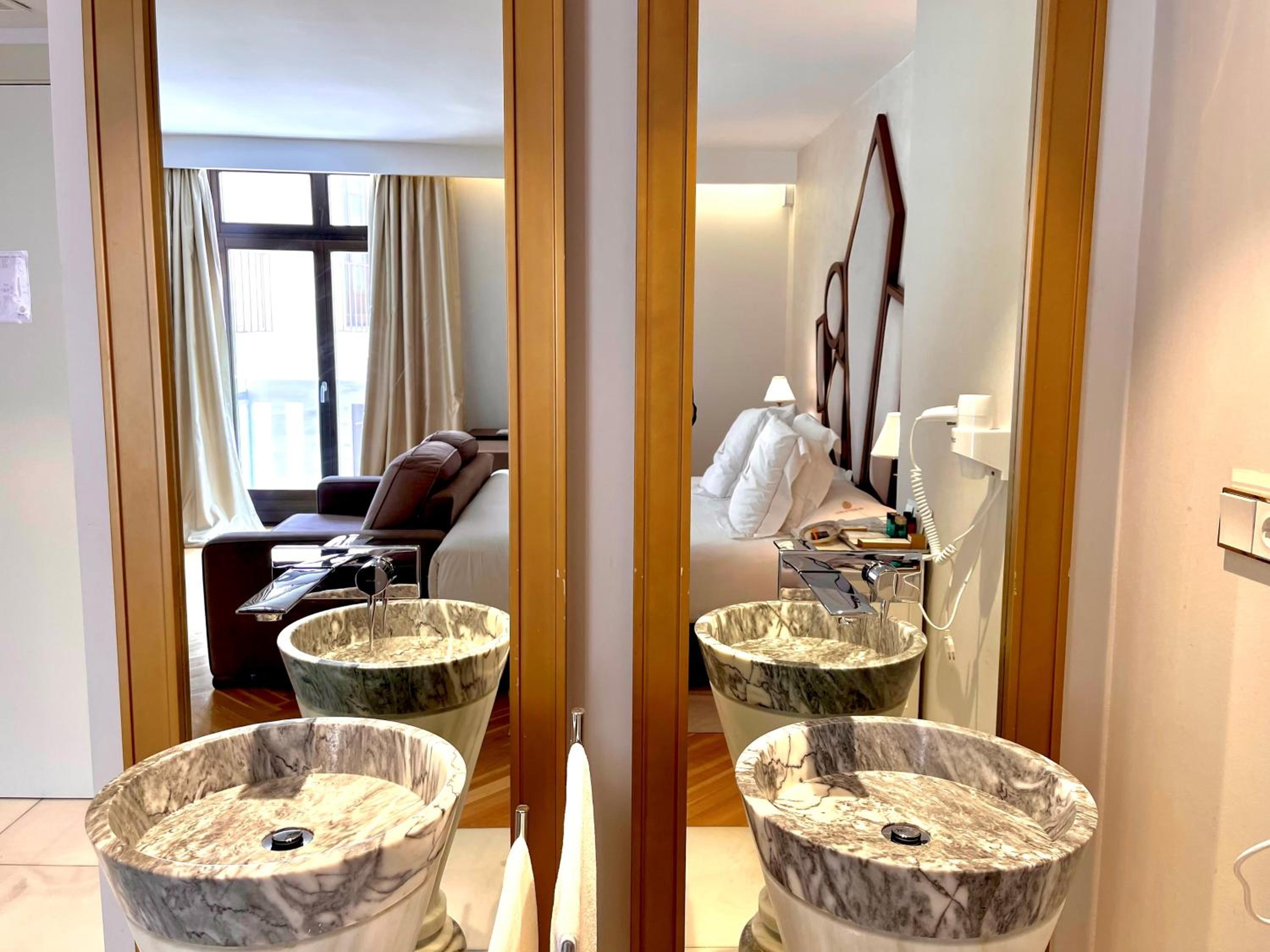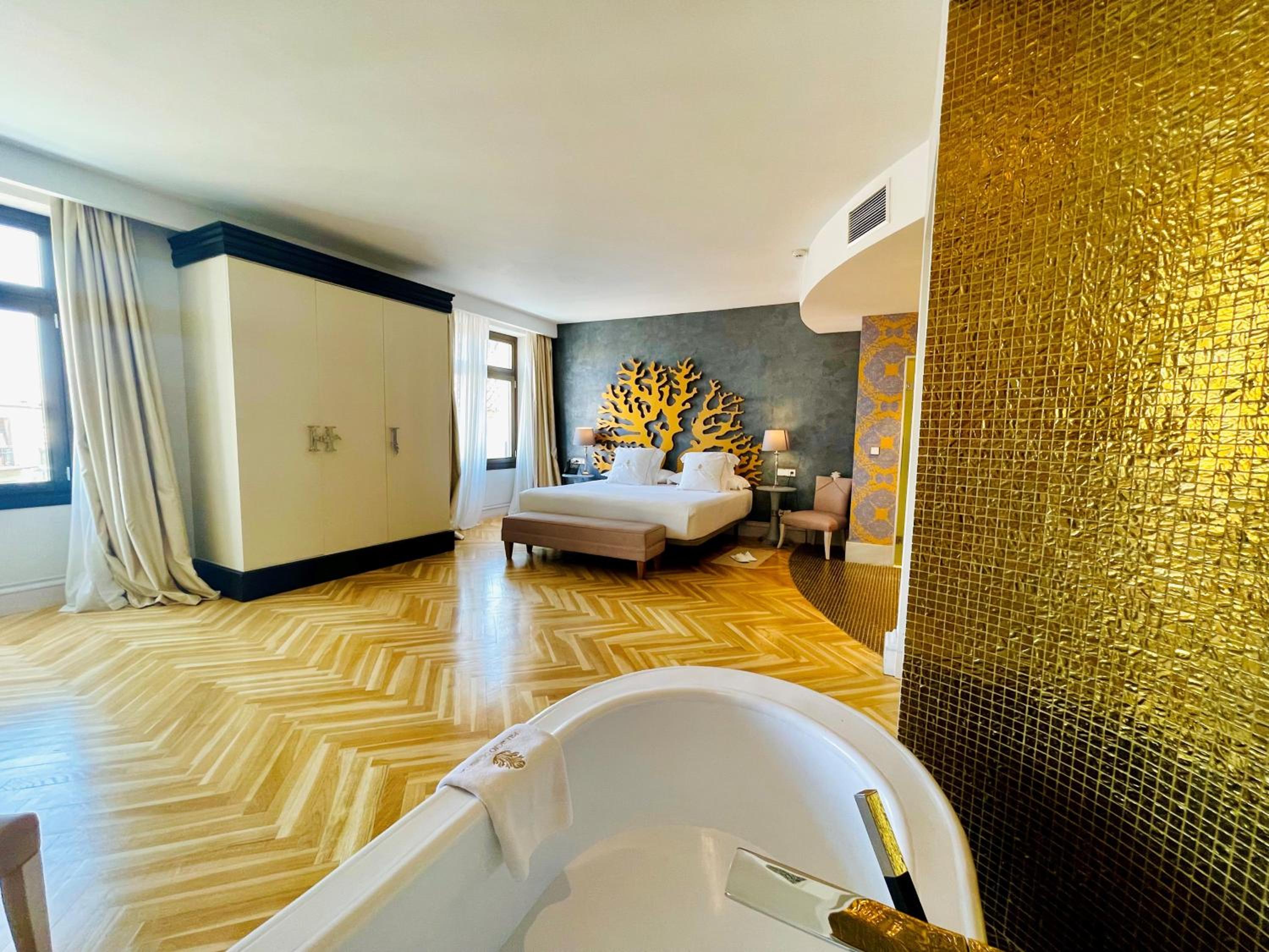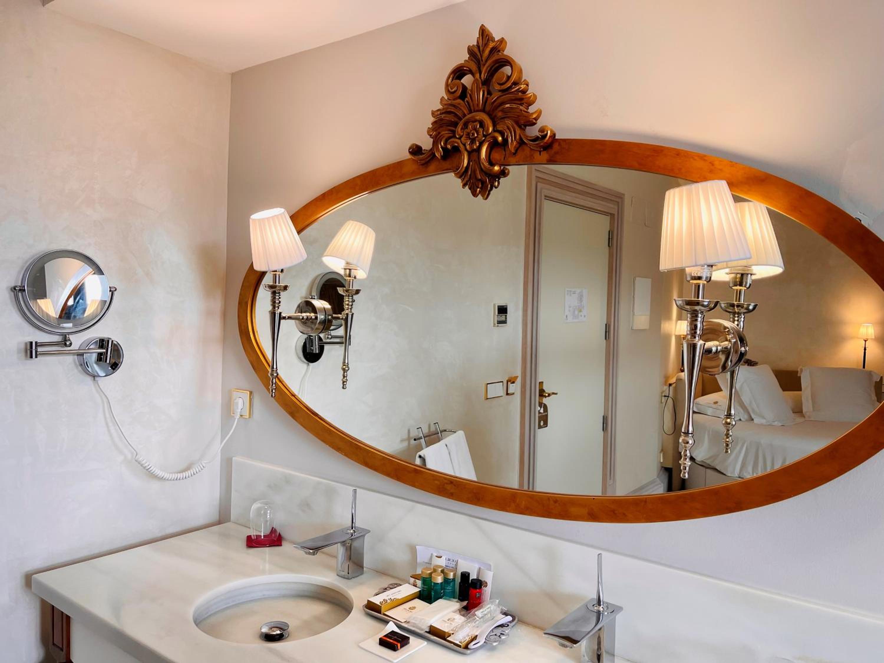 El baño dentro habitacion,uno calficado con tanta distincion tiene que tener excelencia y detalles,no agua de bienvenida con letrero rellenable,resbala el gresite si se moja con lo que te puedes caer, bañera de tanta altura ,unas escalerillas,habitacion con vistas no a un patio interior con chimenea,poca luz habitacion decesa dimensiones, la apertura puerta tienes q abrir con la manivela poco practica,el pomo decorativa, se sale de la misma,esconchadas la pared del baño y condensacion,eso un gl,no lo tendria,agua templada de la ducha,