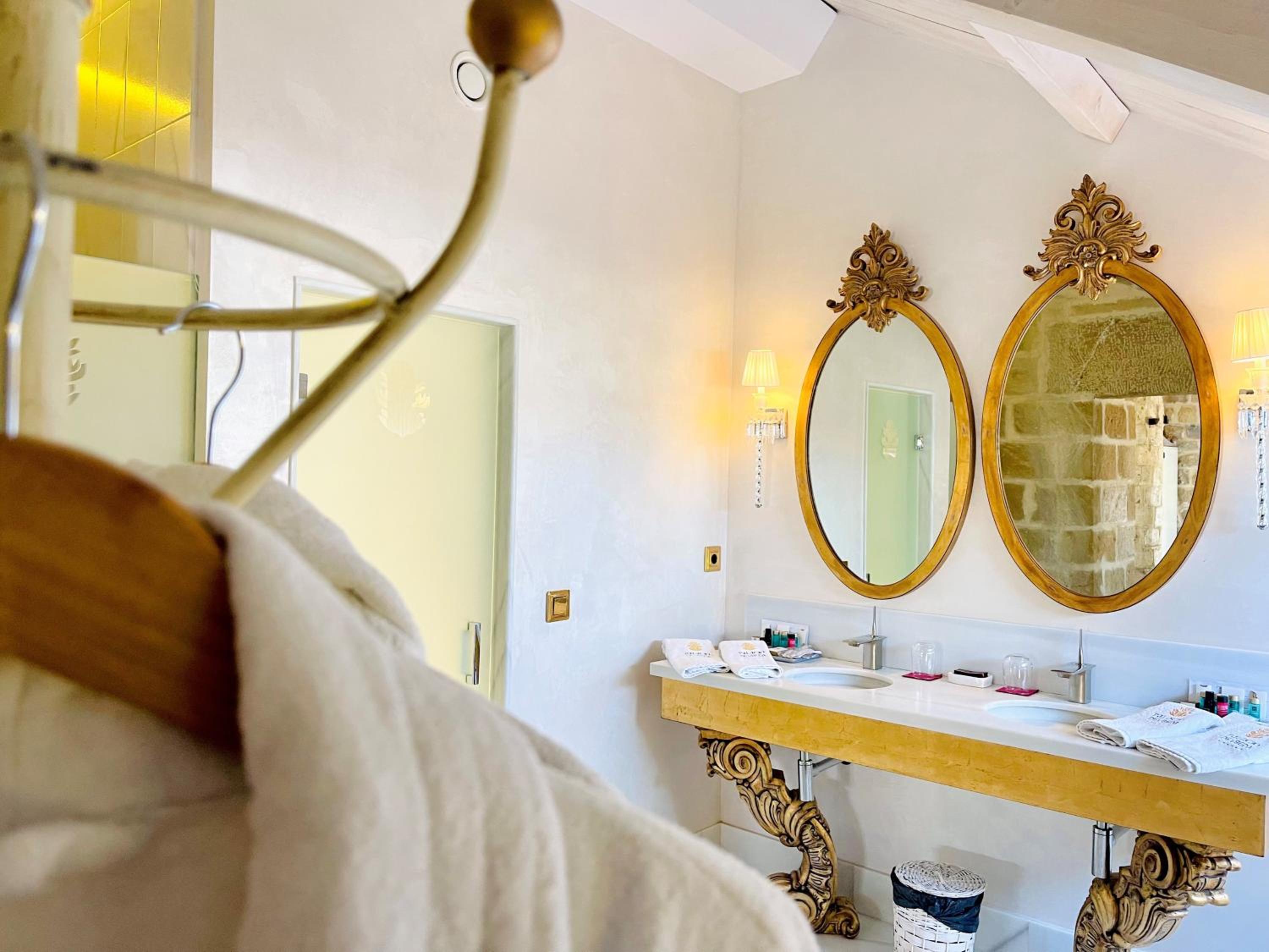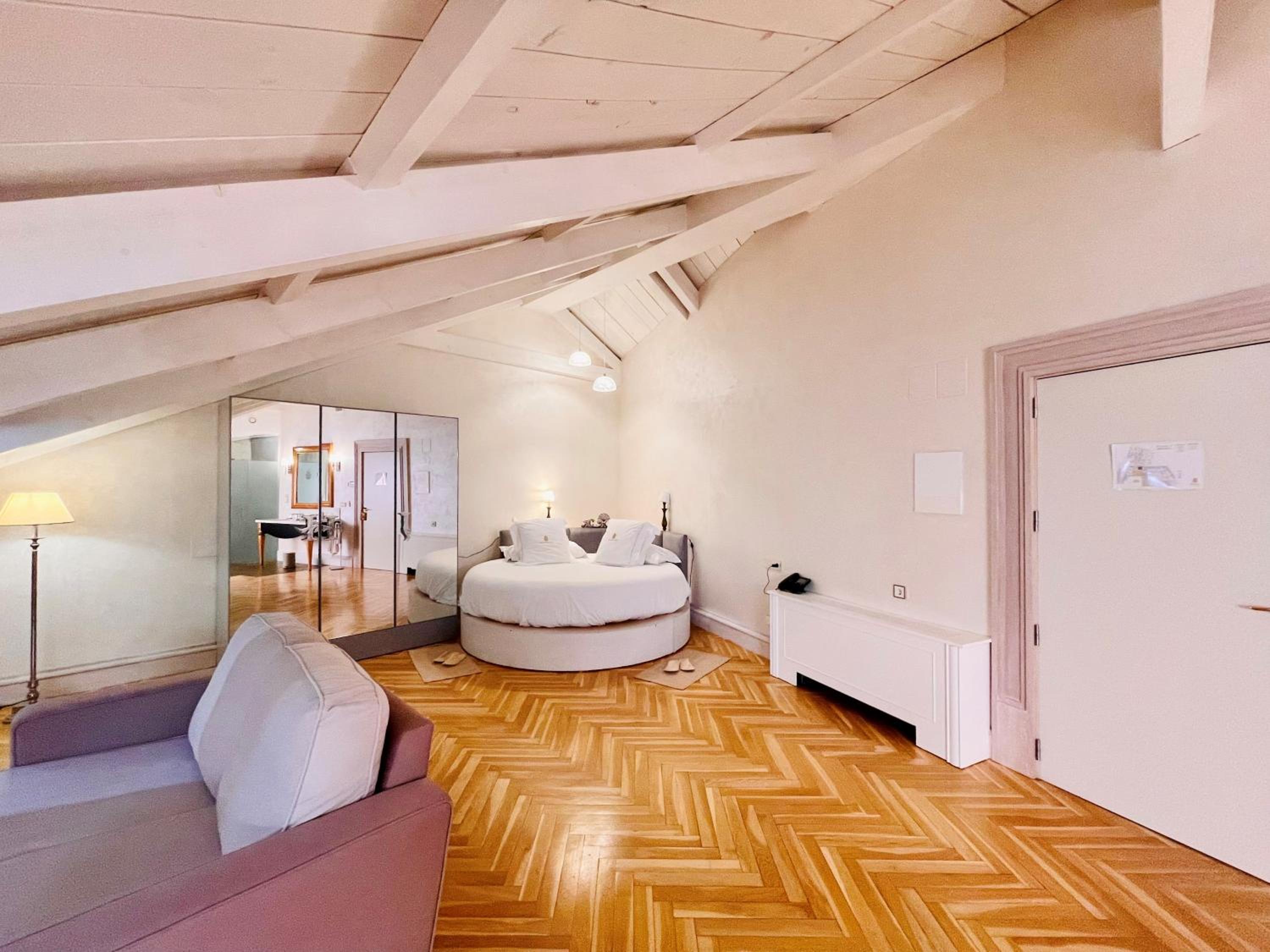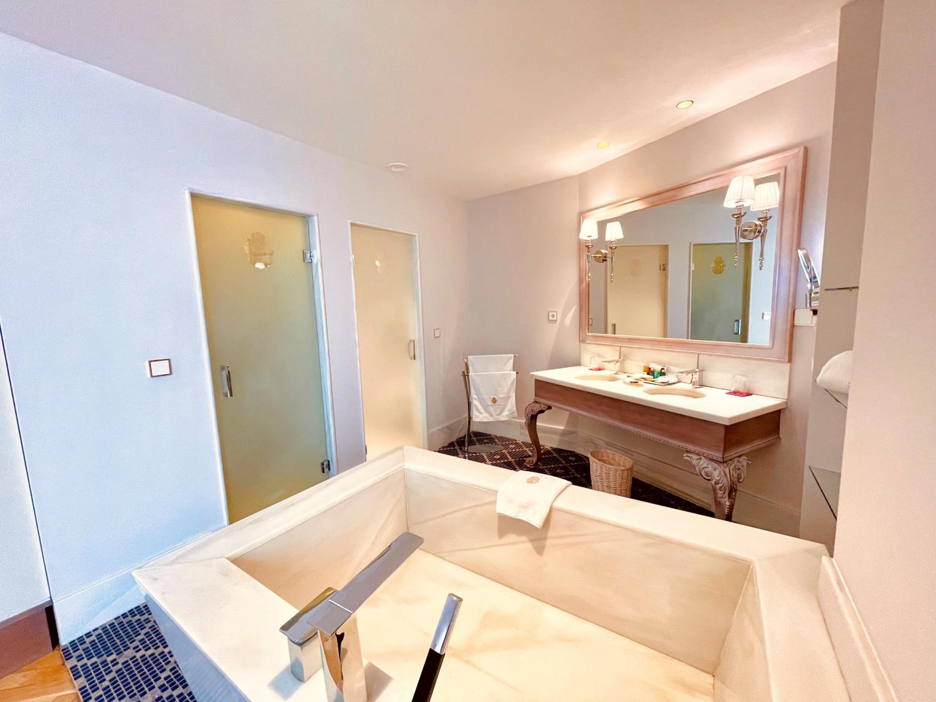 El baño dentro habitacion,uno calficado con tanta distincion tiene que tener excelencia y detalles,no agua de bienvenida con letrero rellenable,resbala el gresite si se moja con lo que te puedes caer, bañera de tanta altura ,unas escalerillas,habitacion con vistas no a un patio interior con chimenea,poca luz habitacion decesa dimensiones, la apertura puerta tienes q abrir con la manivela poco practica,el pomo decorativa, se sale de la misma,esconchadas la pared del baño y condensacion,eso un gl,no lo tendria,agua templada de la ducha,