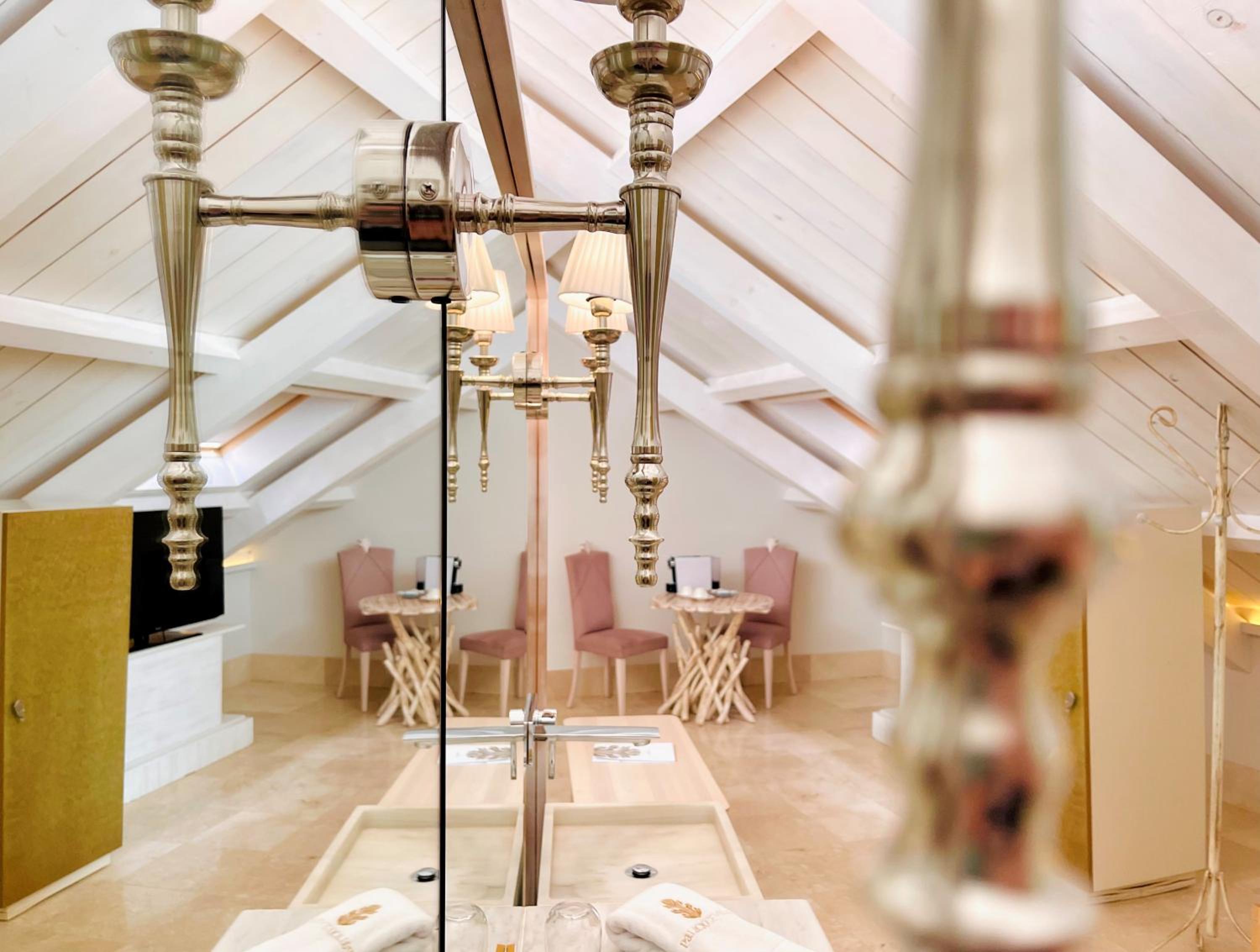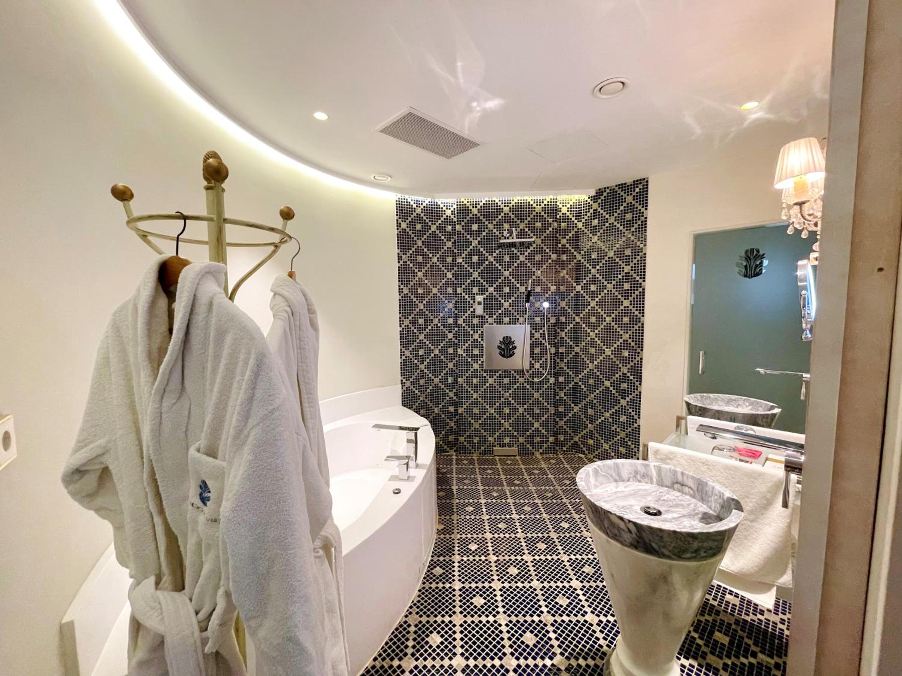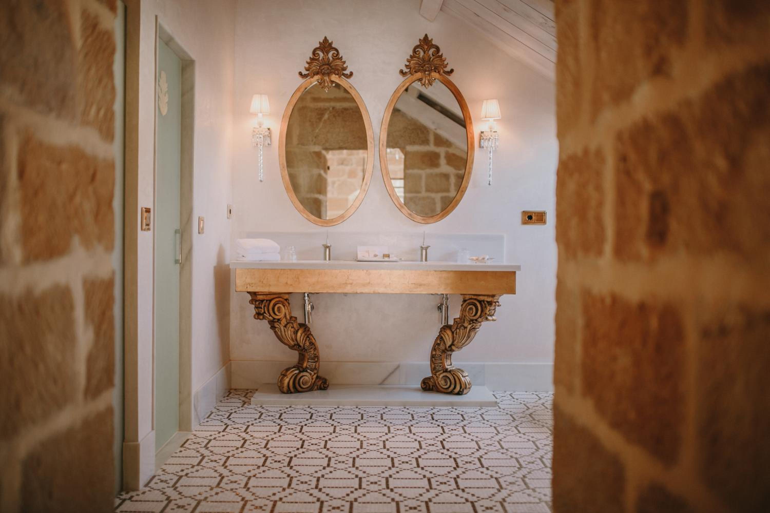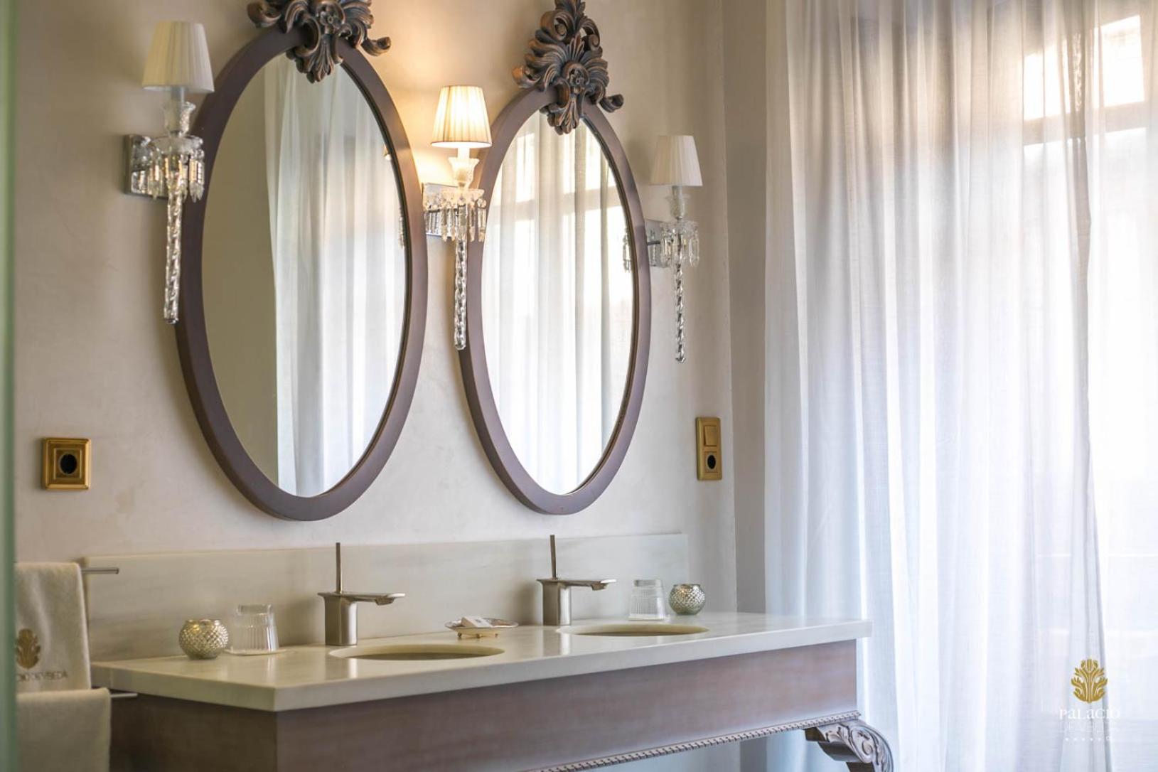 El baño dentro habitacion,uno calficado con tanta distincion tiene que tener excelencia y detalles,no agua de bienvenida con letrero rellenable,resbala el gresite si se moja con lo que te puedes caer, bañera de tanta altura ,unas escalerillas,habitacion con vistas no a un patio interior con chimenea,poca luz habitacion decesa dimensiones, la apertura puerta tienes q abrir con la manivela poco practica,el pomo decorativa, se sale de la misma,esconchadas la pared del baño y condensacion,eso un gl,no lo tendria,agua templada de la ducha,