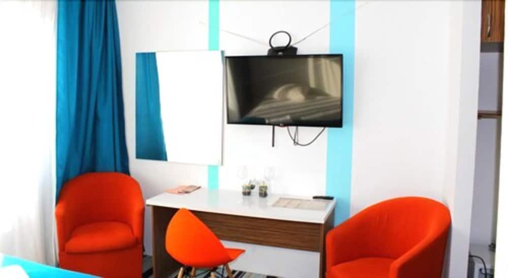 Телевизор в номере на 2 большой,но в доступе только 8-10 каналов,при этом если вы захотите подключить флешку и посмотреть свои фильмы-у вас это не выйдет,так как у телевизора нет необходимых разъёмов.