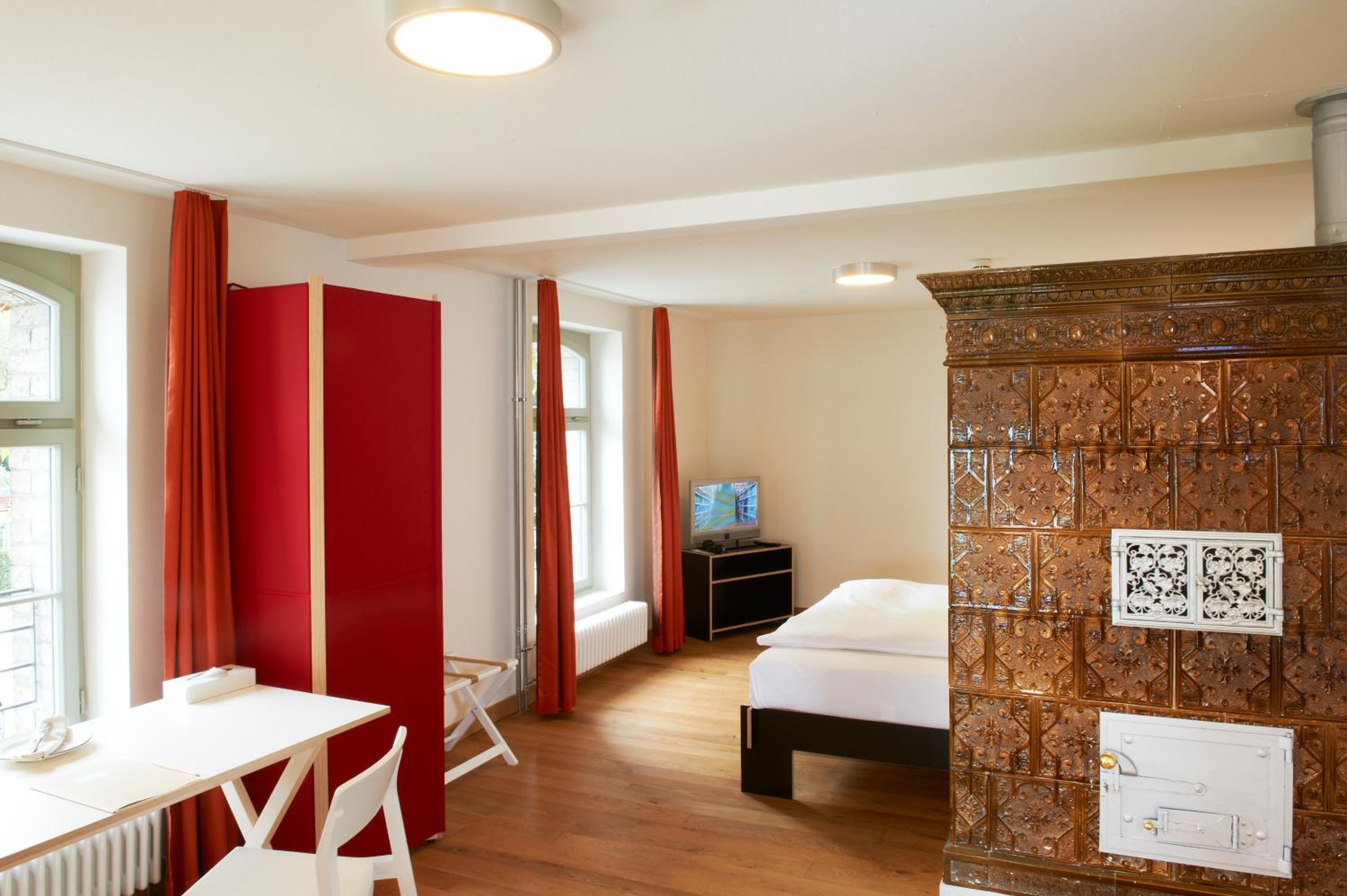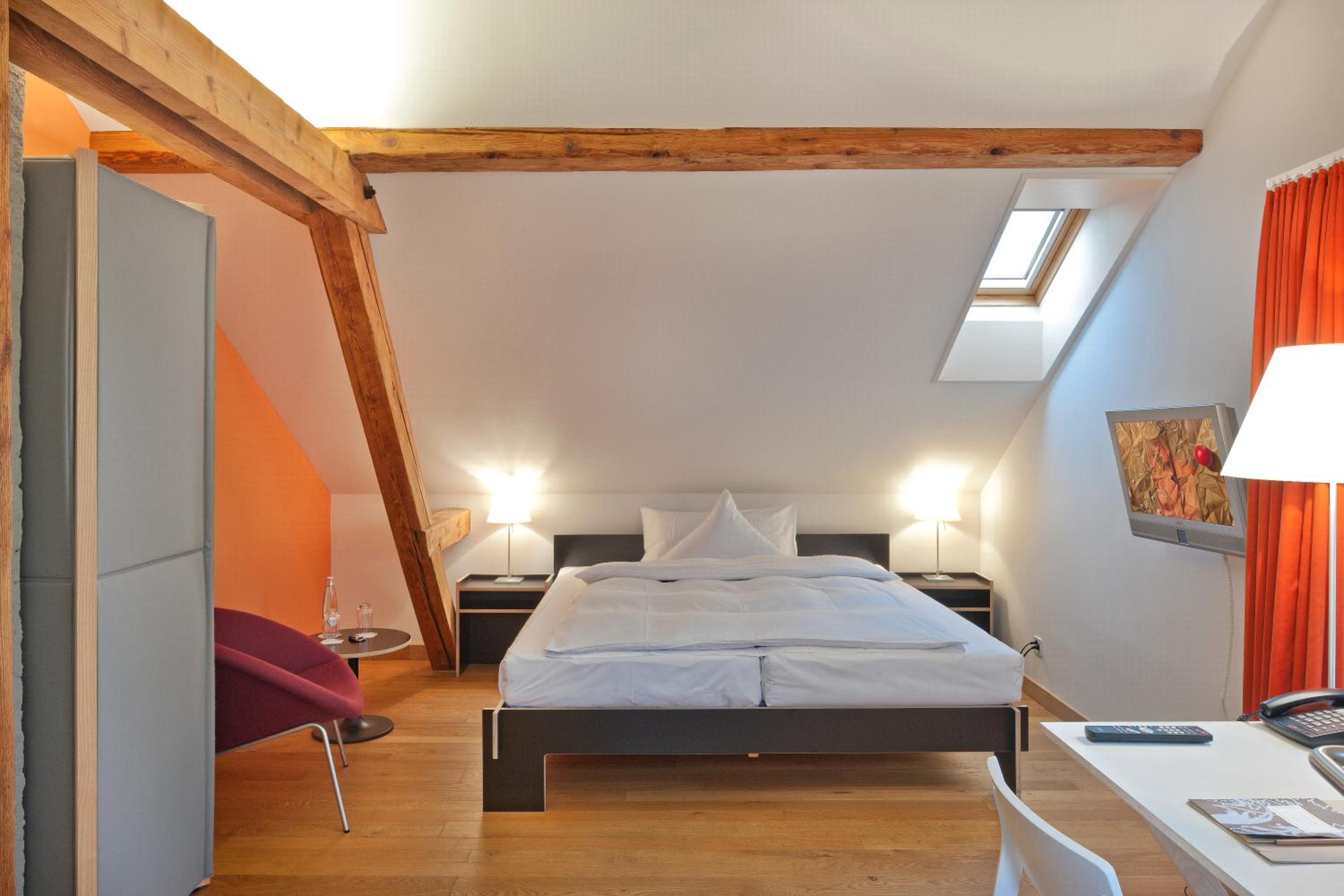Each room at Hotel Auberge Langenthal is a unique haven, boasting individual designs, wooden floors, and lofty ceilings. Relax in your personal living space equipped with cable TV, and luxuriate in the provided bathrobes, slippers, and hairdryer in the well-appointed bathroom.