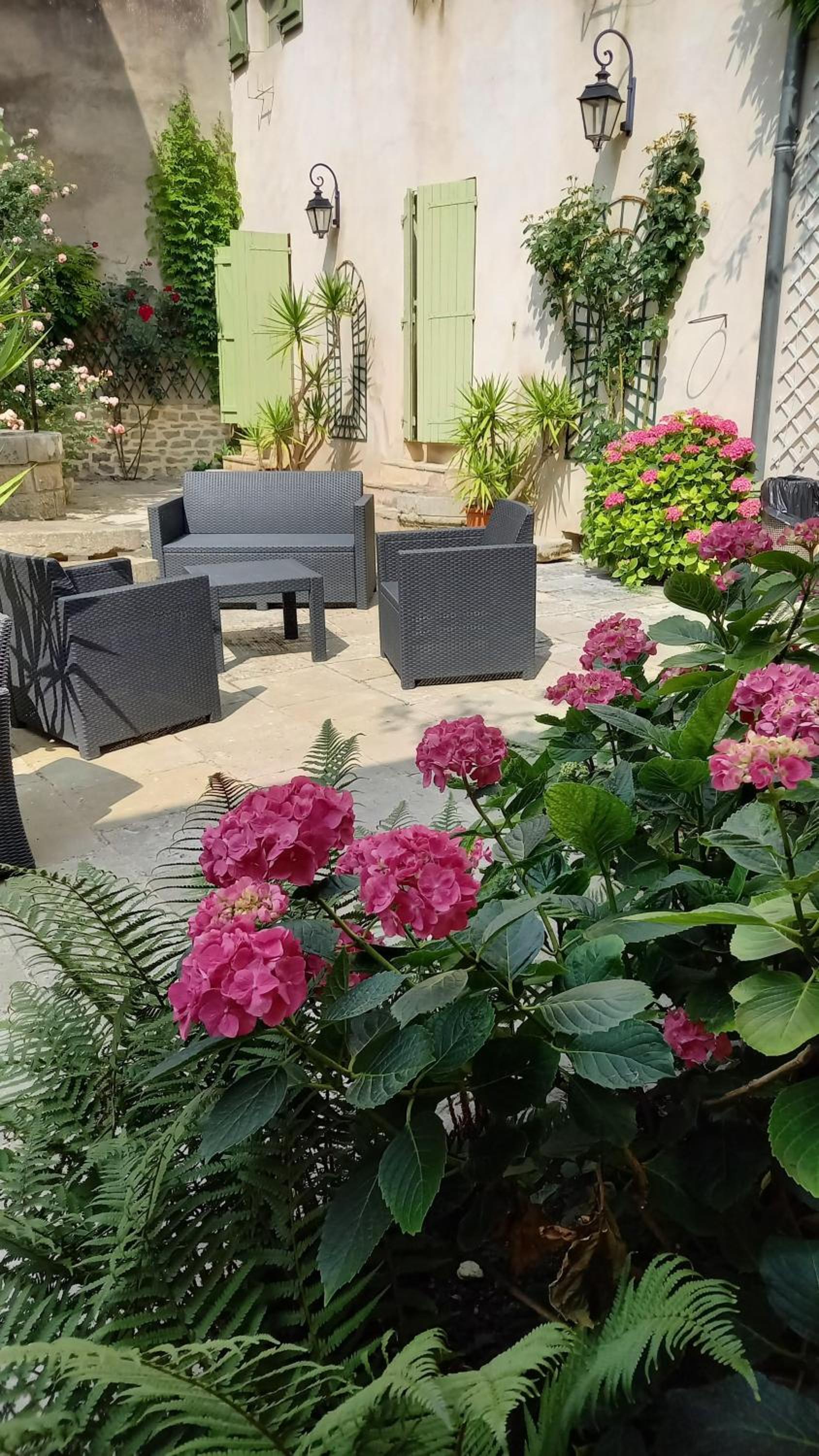 At Hotel de la Halle, immerse yourself in the quaint charm of a traditional house with a beautiful floral terrace, ideally situated opposite the medieval market place in Nolay.