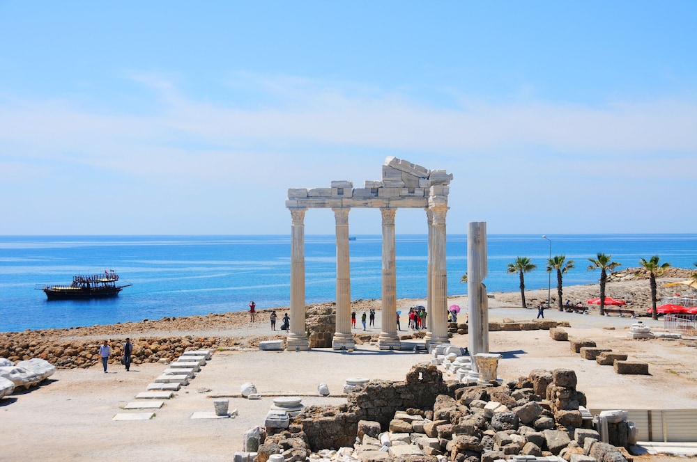 English: We spent 3 nights in this hotel during our honeymoon. Great location. Very tasty breakfast. Lovely sea view. And spotlessly clean rooms are what we recommend about this hotel. // Turkish: Bu otelde balayında ziyaret ettik.Otelden yürüme mesafesi uzaklıkta olan Antik side kentini yarım günde rahatlıkla gezdik. Sonrasında Side çevresindeki Aspendos, Perge ve Manavgat ı araab kiralayarak rahatça gezdik. Kahvaltısındaki her yiyecek çok lezzetliydi kaliteli yeteyağ, bal, zeytin peynir vardı. deniz manzaramız çok şahane ve odamız da tertemizdi. Otelin restoranı tarihi mozaik dokuyu bozmadan cam döşemeler kullanılarak yapılmış. Antik kentin dokusuna ve ruhuna saygı ile yaklaşan bu otele tekrar gelmek isterim. Tatilletinde tarihi kentleri ziyaret etmekten hoşlanan ve güzel kumsallardan hoşlanan çiftler buradan çok hoşnut kalacaklardır.