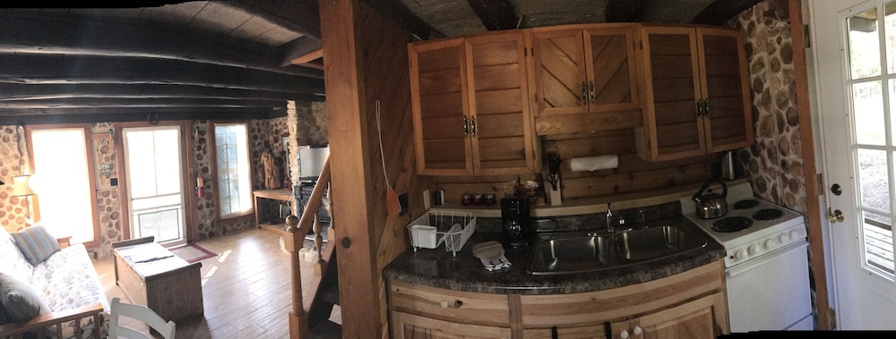 The kitchen, fire pit, and our room.