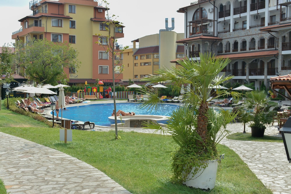 This hotel is in Sveti Vlas (no in Sunny Beach) but this place is wonderful for the families and the beach is near (5 minutes). Beautiful pool (no heat) and the wifi is not very hard. Wonderful place with good service and cheap.