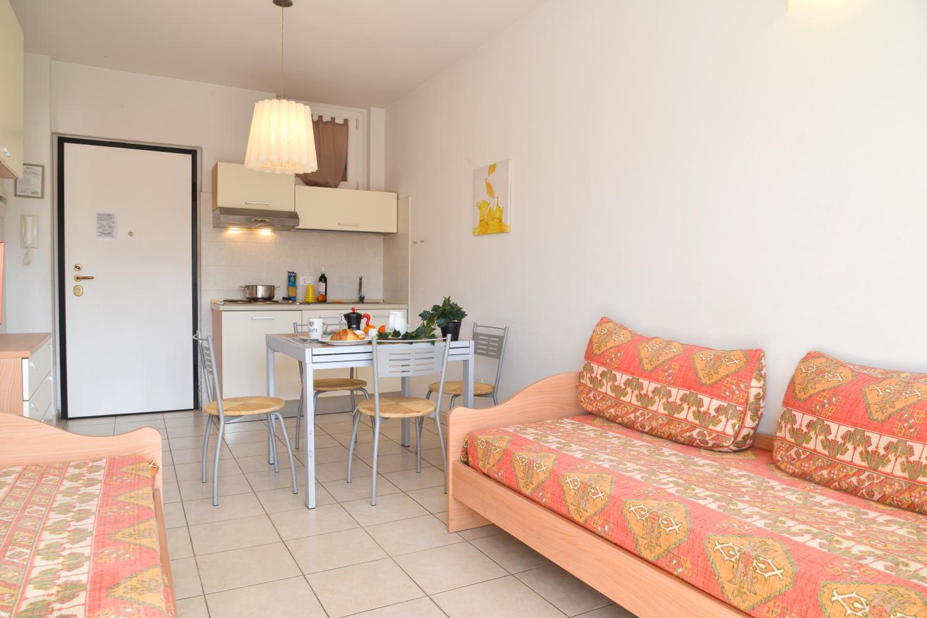 The residence is located in quiet street. The rooms are spacious. The kitchen very well equipped for a small cooking - even a small oven is provided. The biggest advantage is the spacious balcony with a sea view. There is also a private parking inside. The reception lady was very kind and supportive when we asked her anything. The beach is in the vicinity - just 5 minutes down the street by walk. The city centre is also reacheable by foot. In the city there is a train station with direct IC trains to Genova.