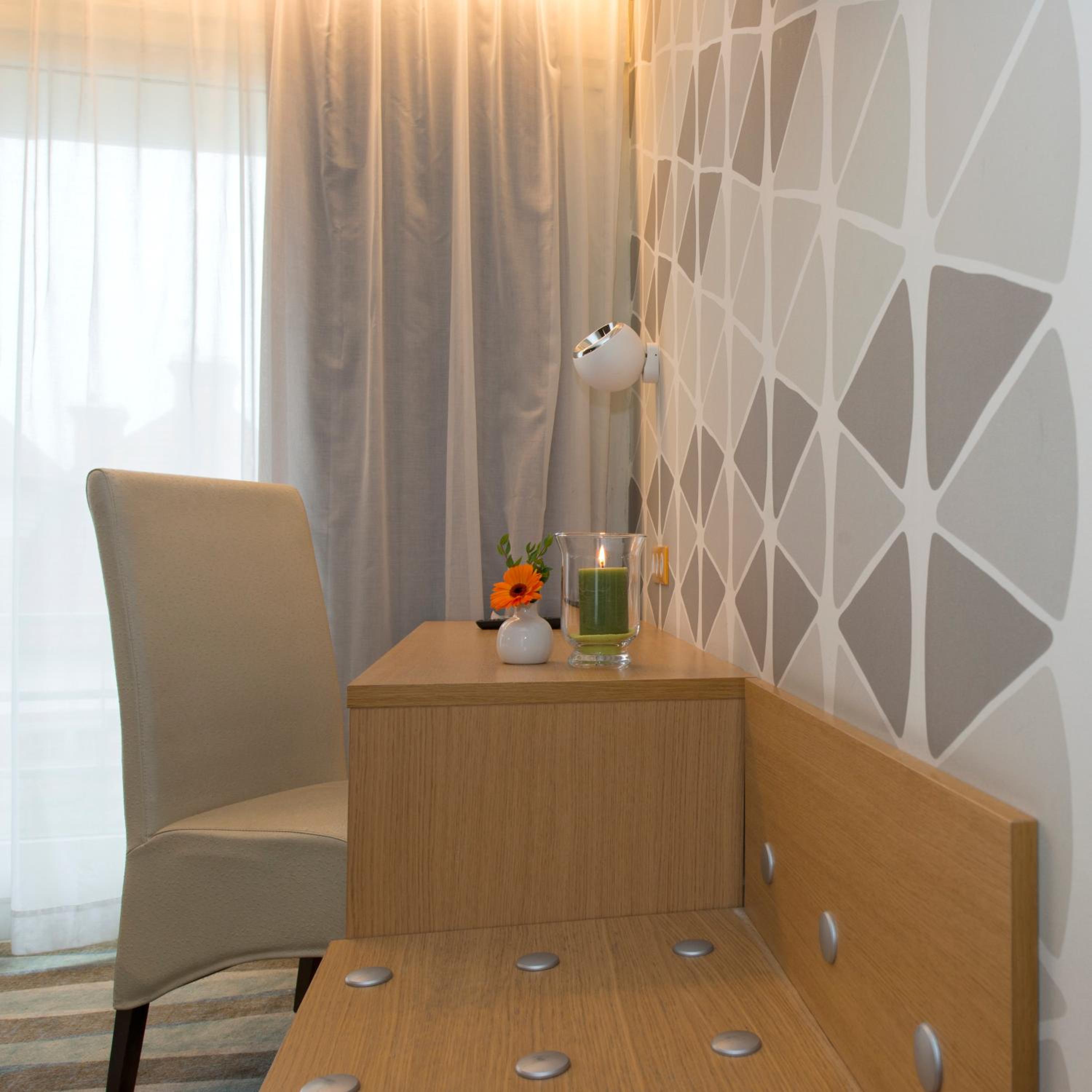 CHAMBRE UN PEU PETITE. NOUS N'AVIONS PEU DE PLACE A CAUSE DES DEUX FAUTEUILS ENCOMBRANTS. IL AURAIT ETE PREFERABLE D'INSTALLER DEUX CHAISES CONFORTABLES PLUTOT QUE CES FAUTEUILS (gain de place et accès facile à la fenetre pour fermer les tentures le soir).