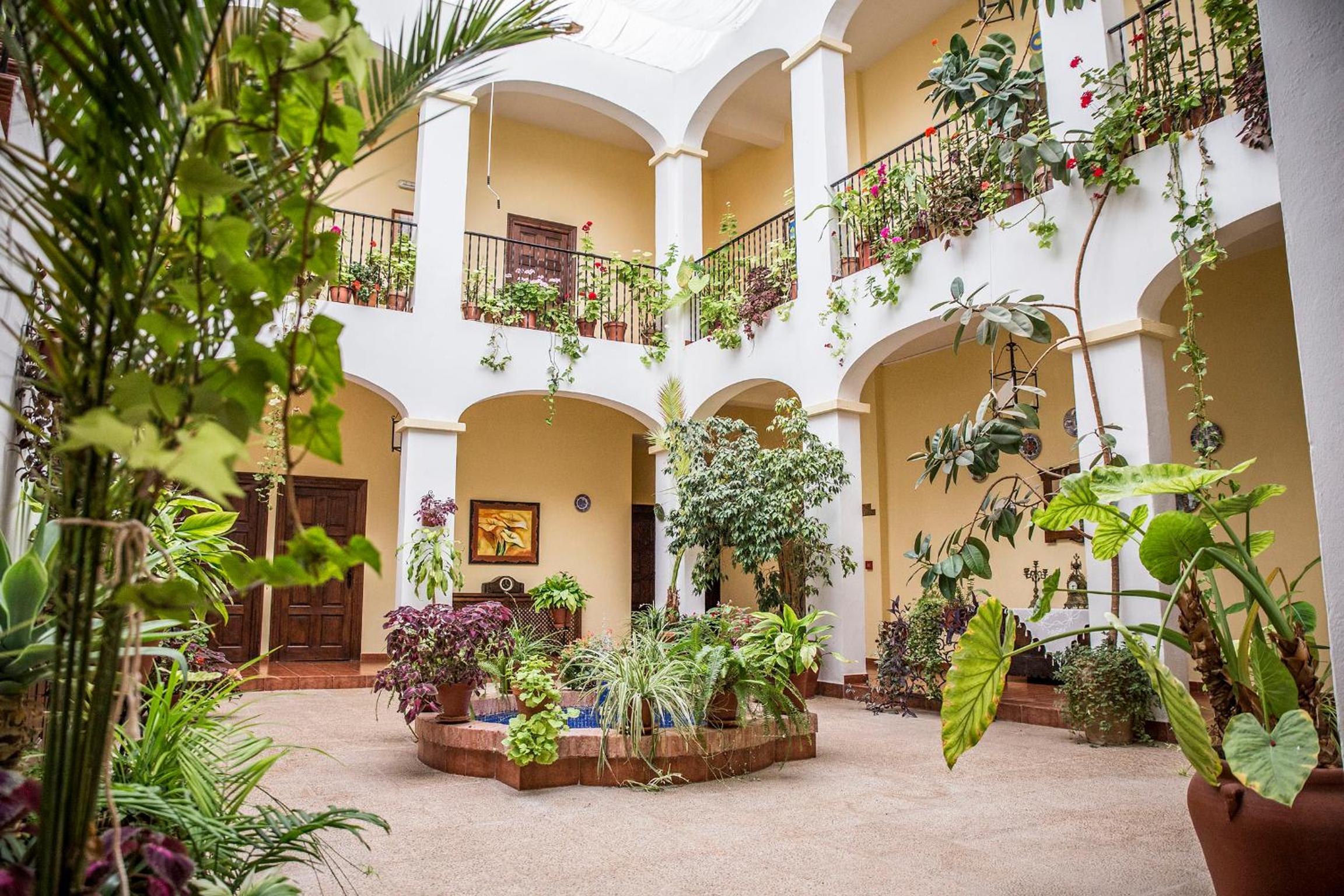 Step into the stunning Andalusian-style interior courtyard, complete with lush plants and a central water feature, providing a tranquil oasis for relaxation and socializing.