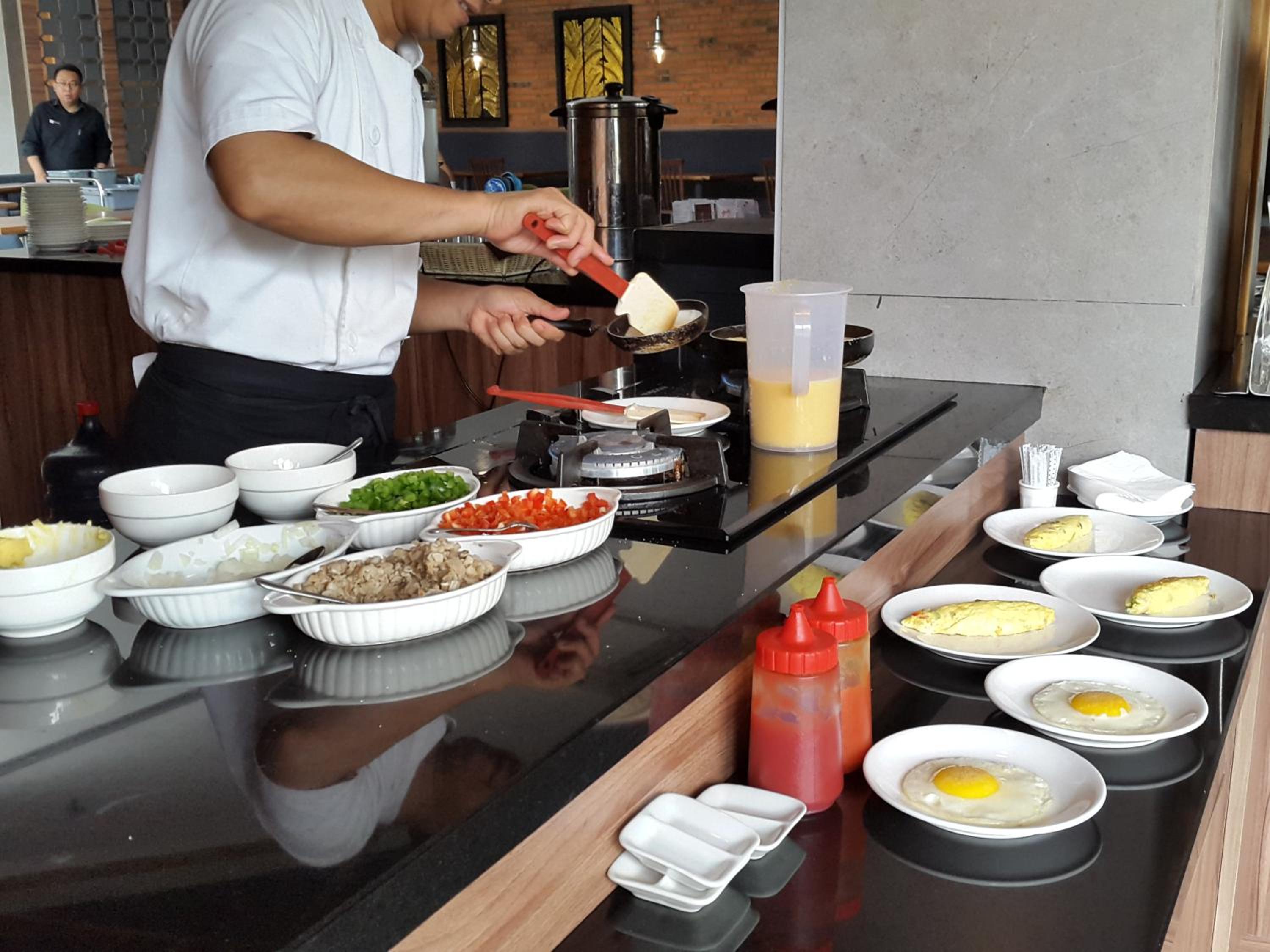 Piscine petite par rapport à l’hotel . Le petit déjeuner a du choix mais malheureusement pas au goût européen . Il n’y a pas de chaise ou autre pour s’asseoir dans le balcon .
