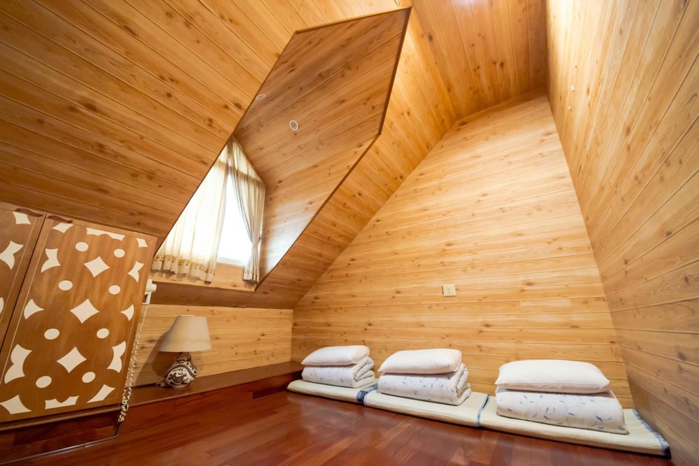 是一間閣樓房,因為有頃斜的天花板,容易撞到頭