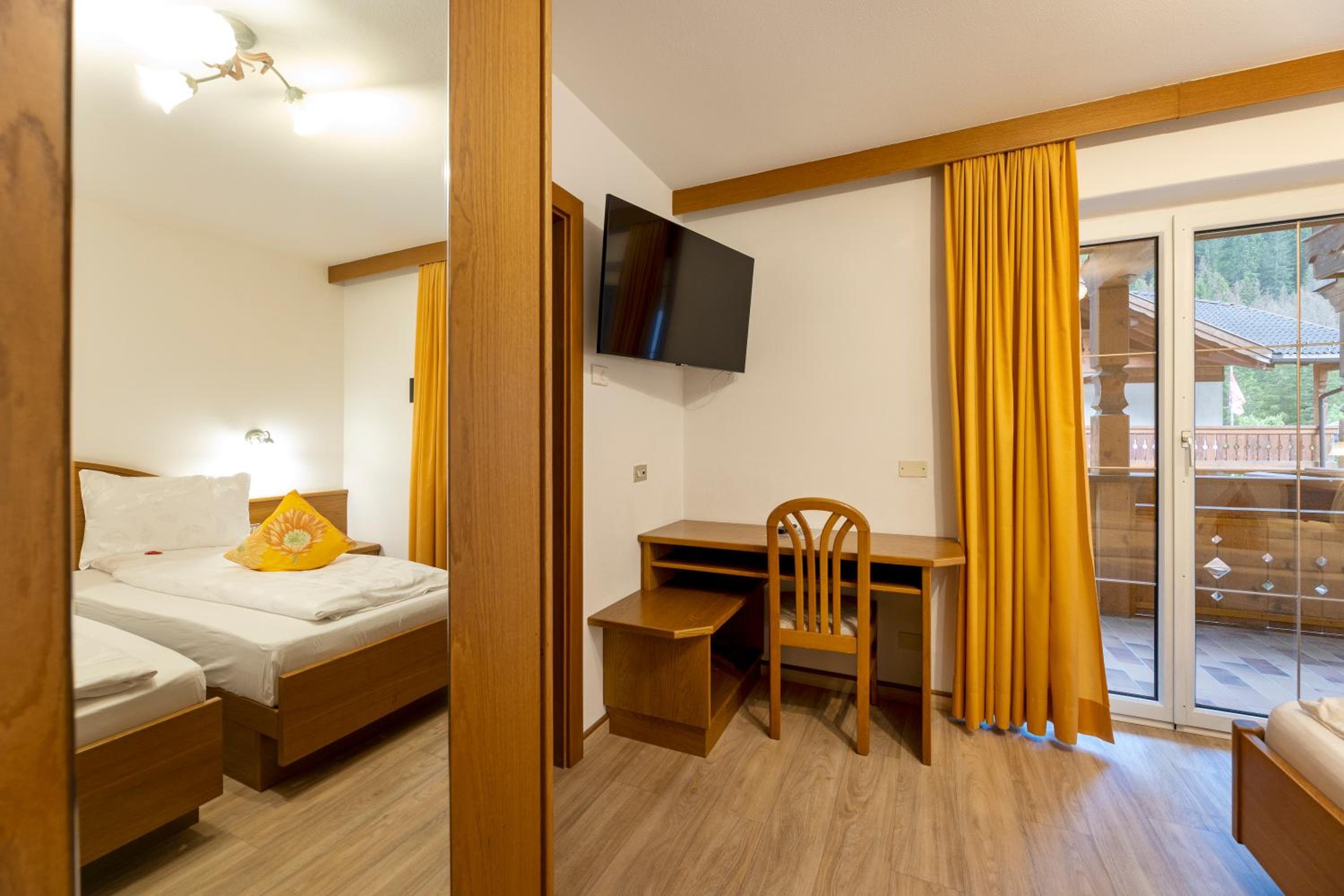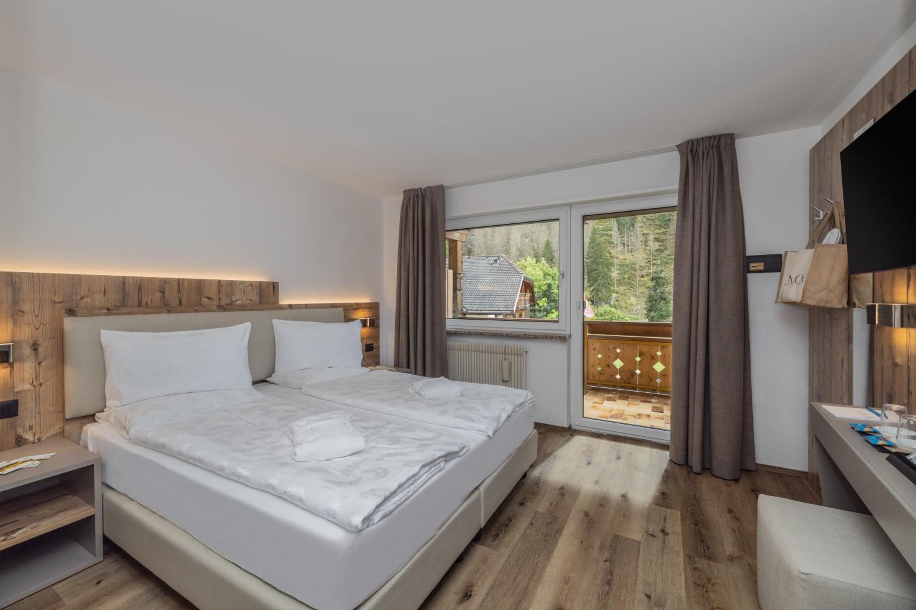 Wake up to stunning mountain or garden views from your private balcony. Our Alpine-style rooms offer modern amenities like TV, free WiFi, and a cozy atmosphere.