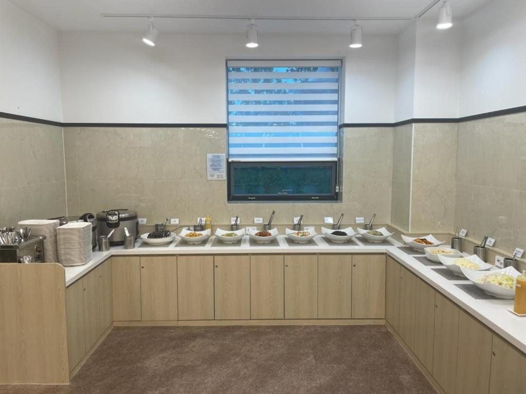 Camera nel complesso piccola e bagno anche. Solo un cuscino e poca alternativa alla colazione tipica coreana.