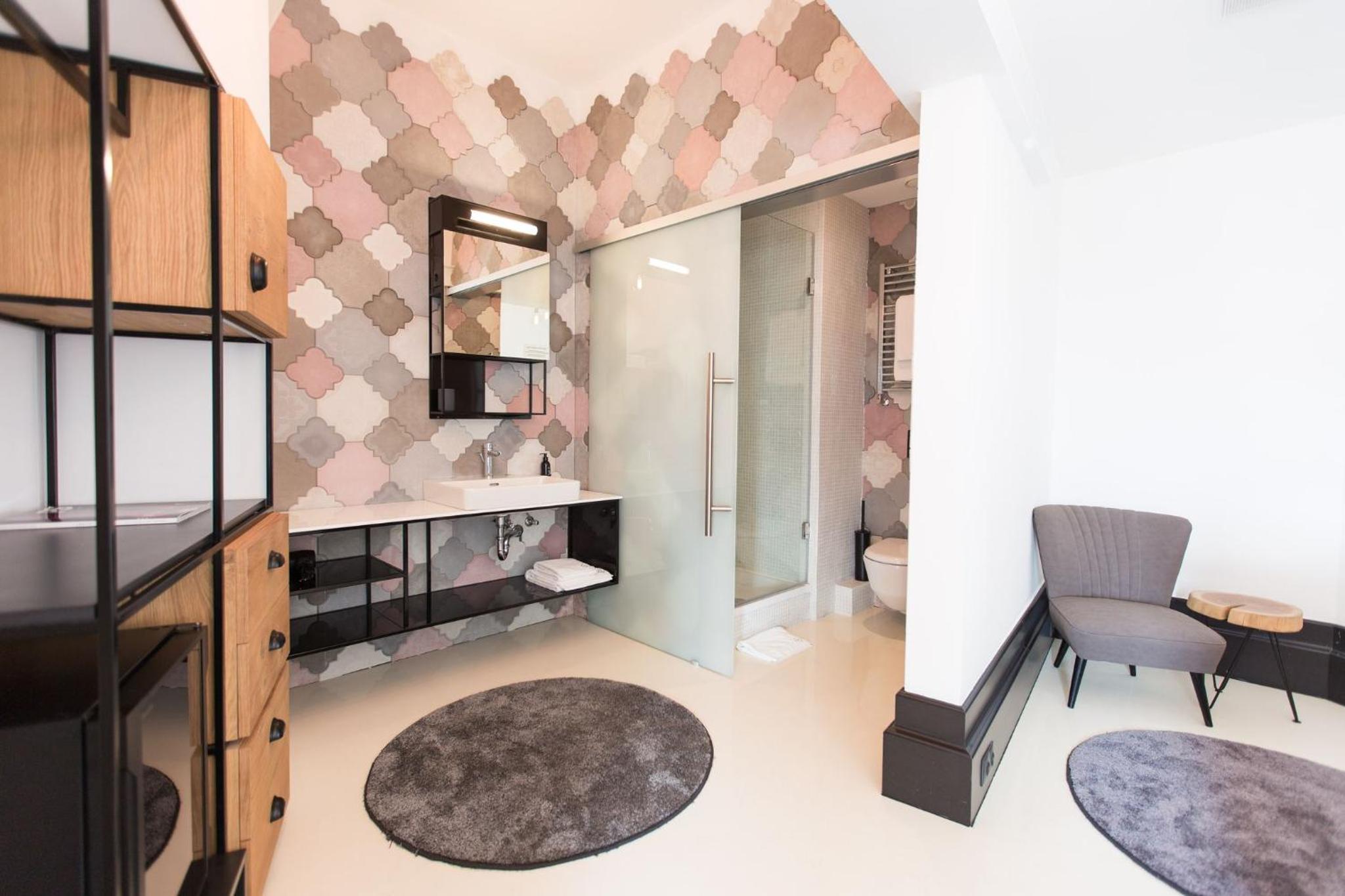 Leicht muffiger Geruch in der Dusche. Stufe zwischen Schlafzimmer und Badezimmer und nochmal kleine Stufe zur Dusche.