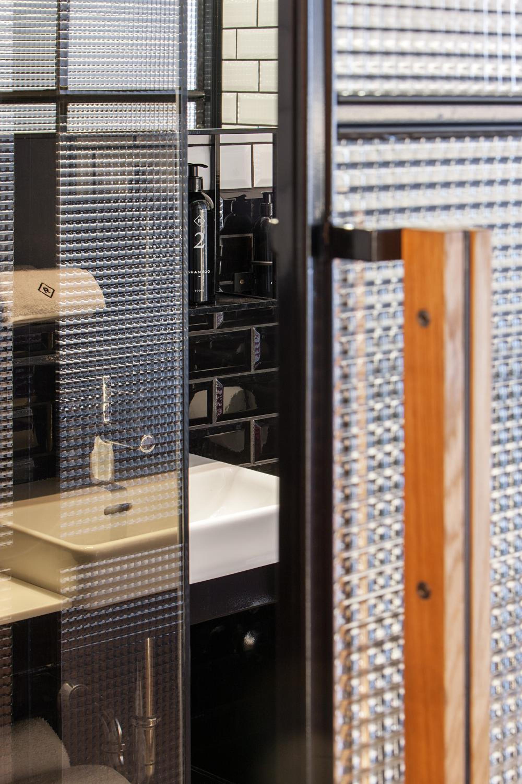 Bathroom was not a fully separate room, rather just divided by glass panels and big glass sliding door which had gaps you could see through.