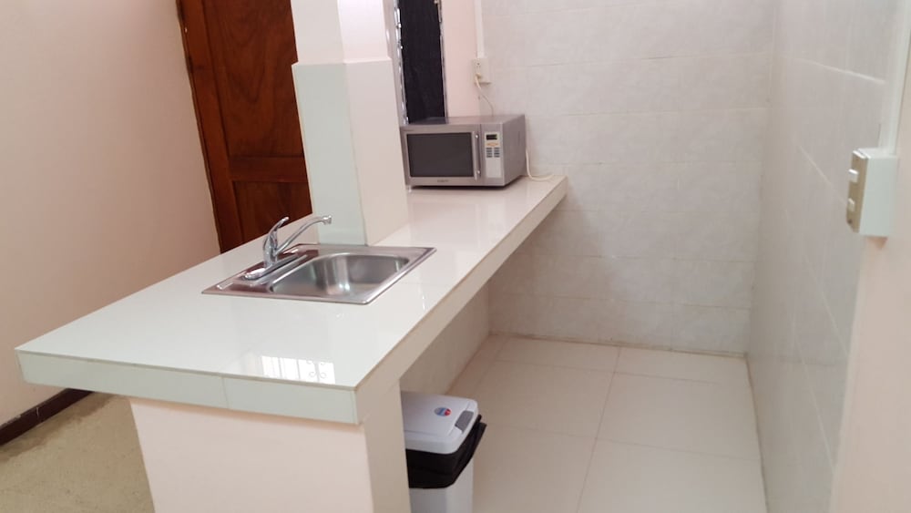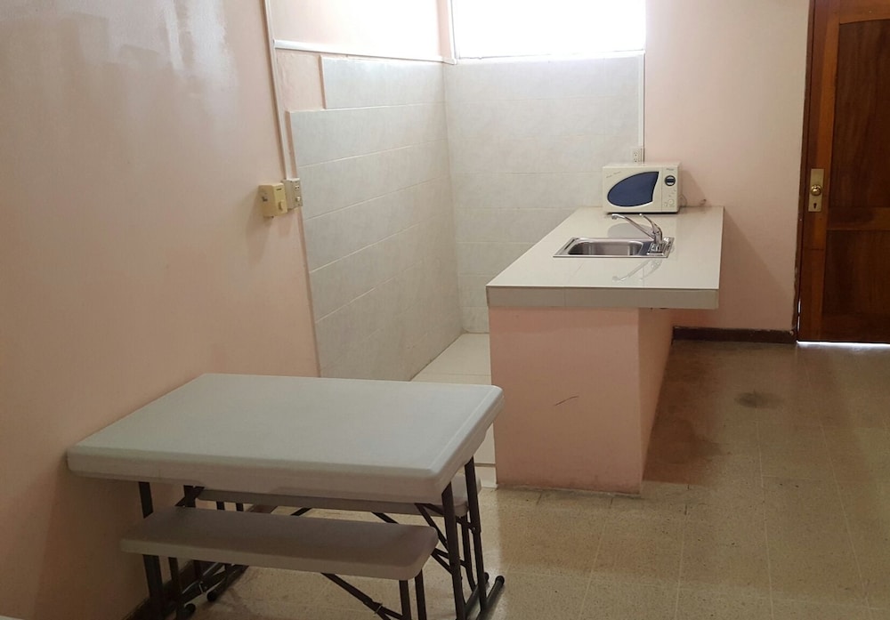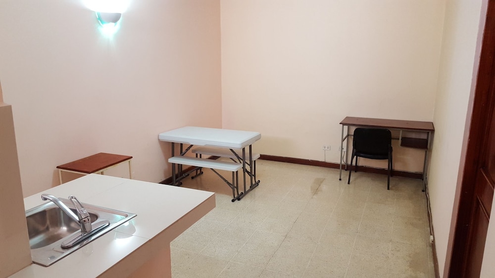 We chose this hotel as a cheap place to sleep before flying out the next morning. It was certainly that! The room was very basic, but had space for 4 people to sleep. The shower was cold, but that was expected. Little bit sketchy but the light switch and plug were inside the shower stall. Fortunately the shower head was more like a hose so the water just sprayed straight down. Does not have AC, which i was certain the ad said that it does, but when i got my confirmation email it said no AC, so a bit confused by that. Had an excellent ceiling fan that did a great job of keeping us comfortable while we slept. The area around the hotel was great, felt very safe walking around and sitting in the square with all the locals and their kids after dark, and there was a security guard roaming in case someone got out of line. Lots of shopping and food options nearby. Maxi Pali was a 10 min walk away. Would definitely recommend it if you just want a basic place to stay on the cheap!