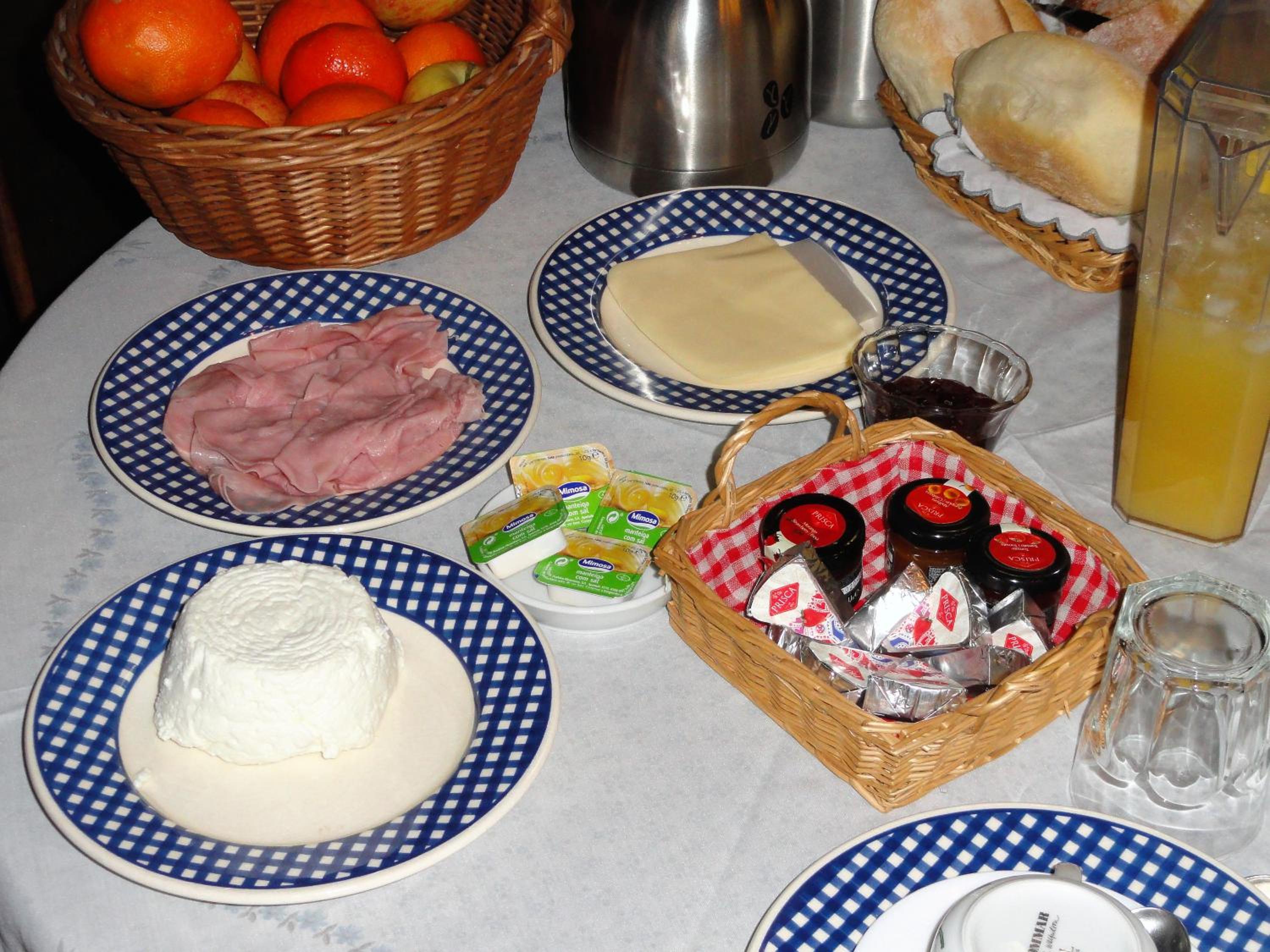 Breakfast was delightful! Every morning, there was fresh, crispy bread that paired perfectly with hot coffee. We also had delicious ham and cheese, and to top it off, there was fresh orange juice. It was such a great spread.