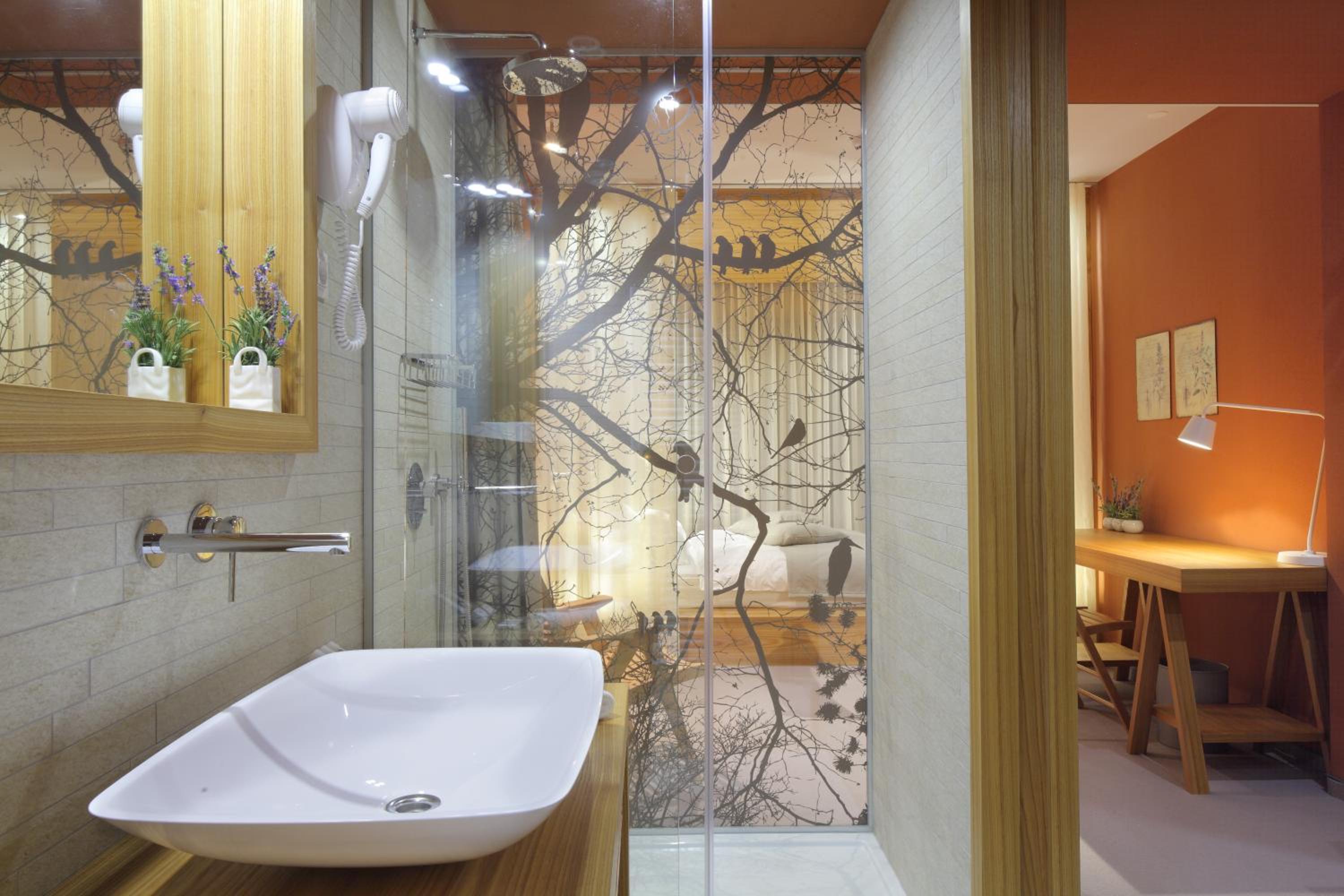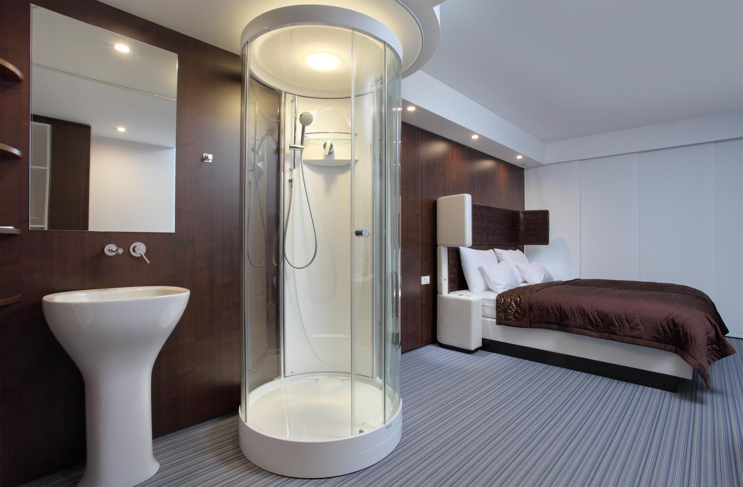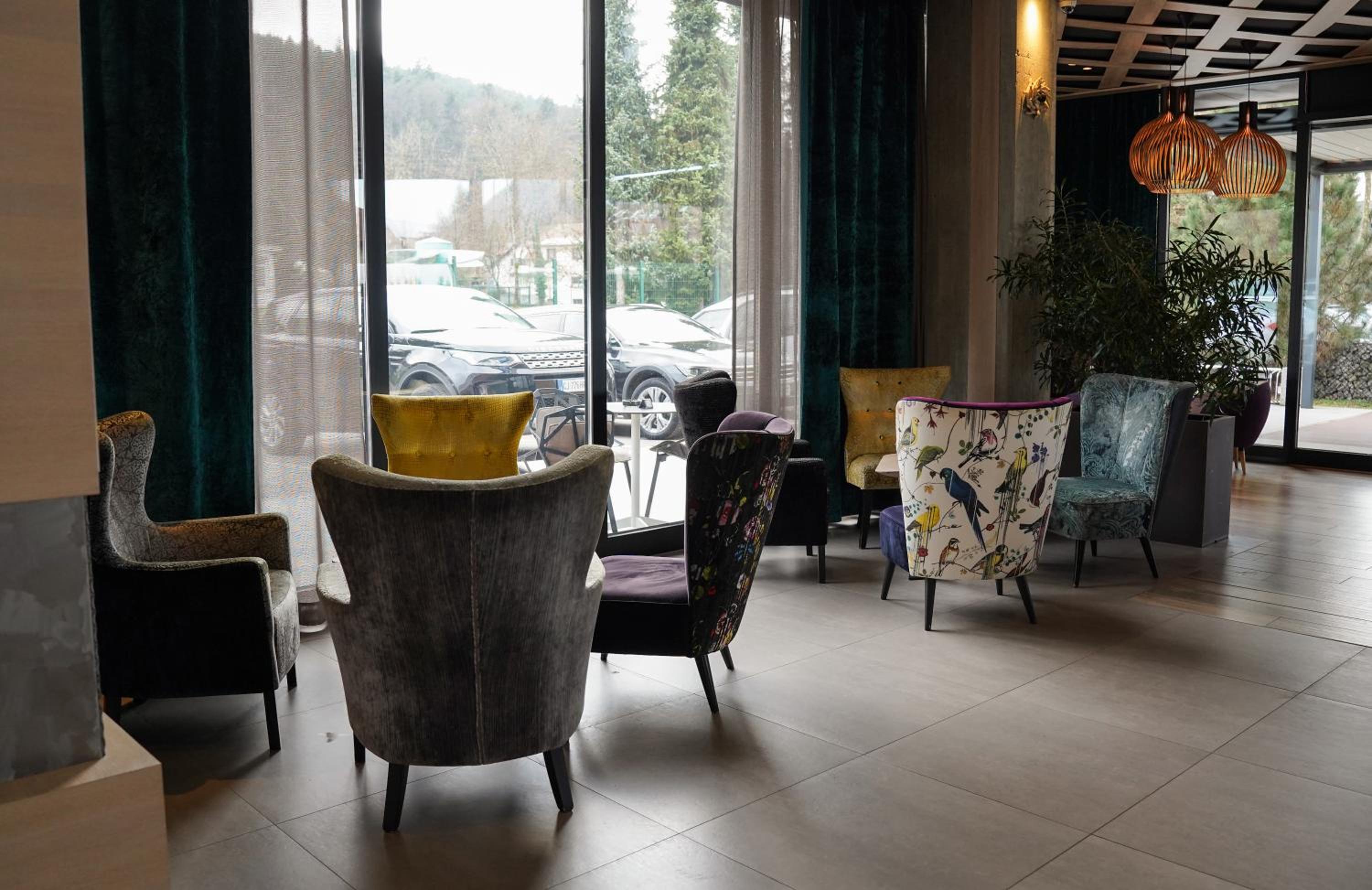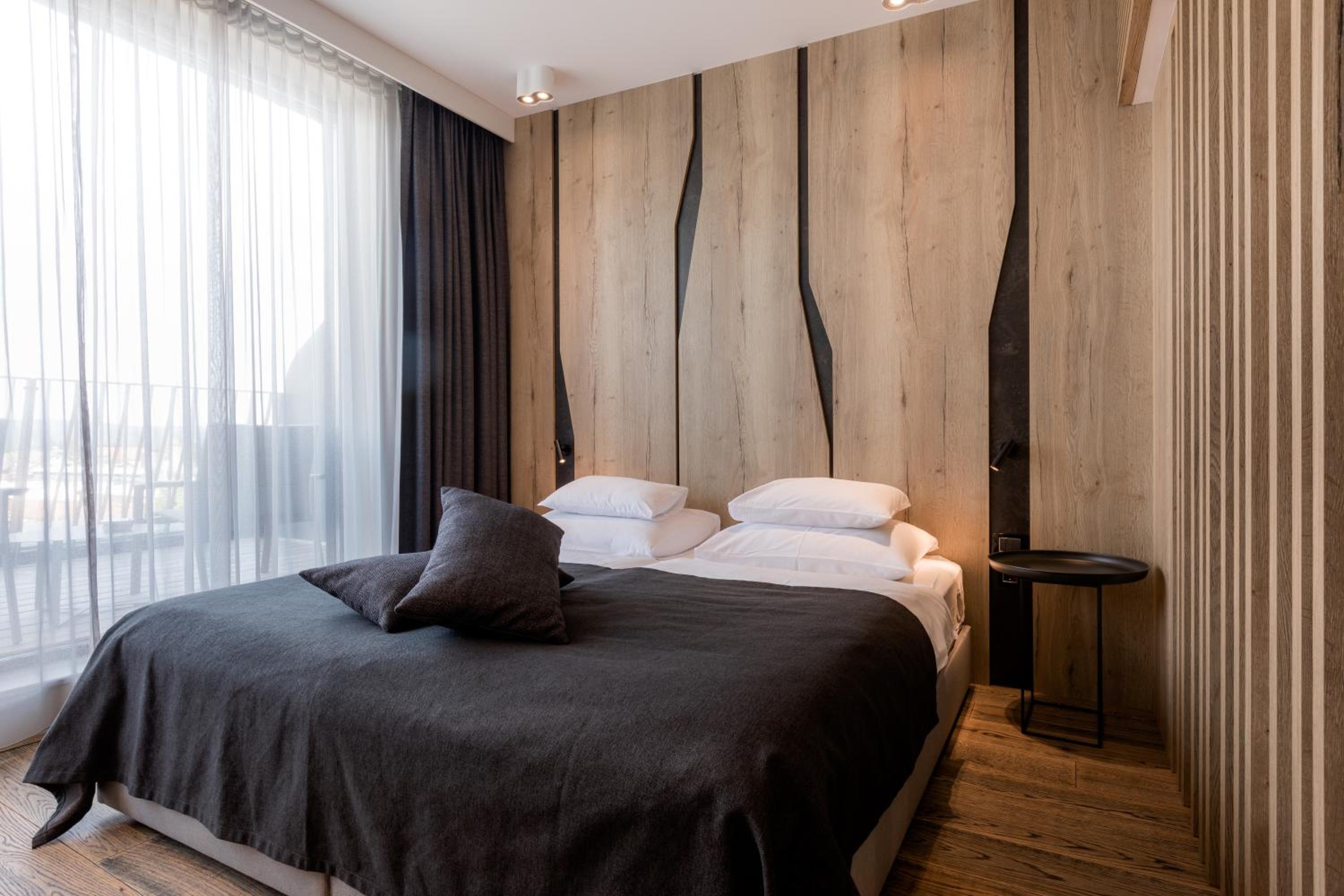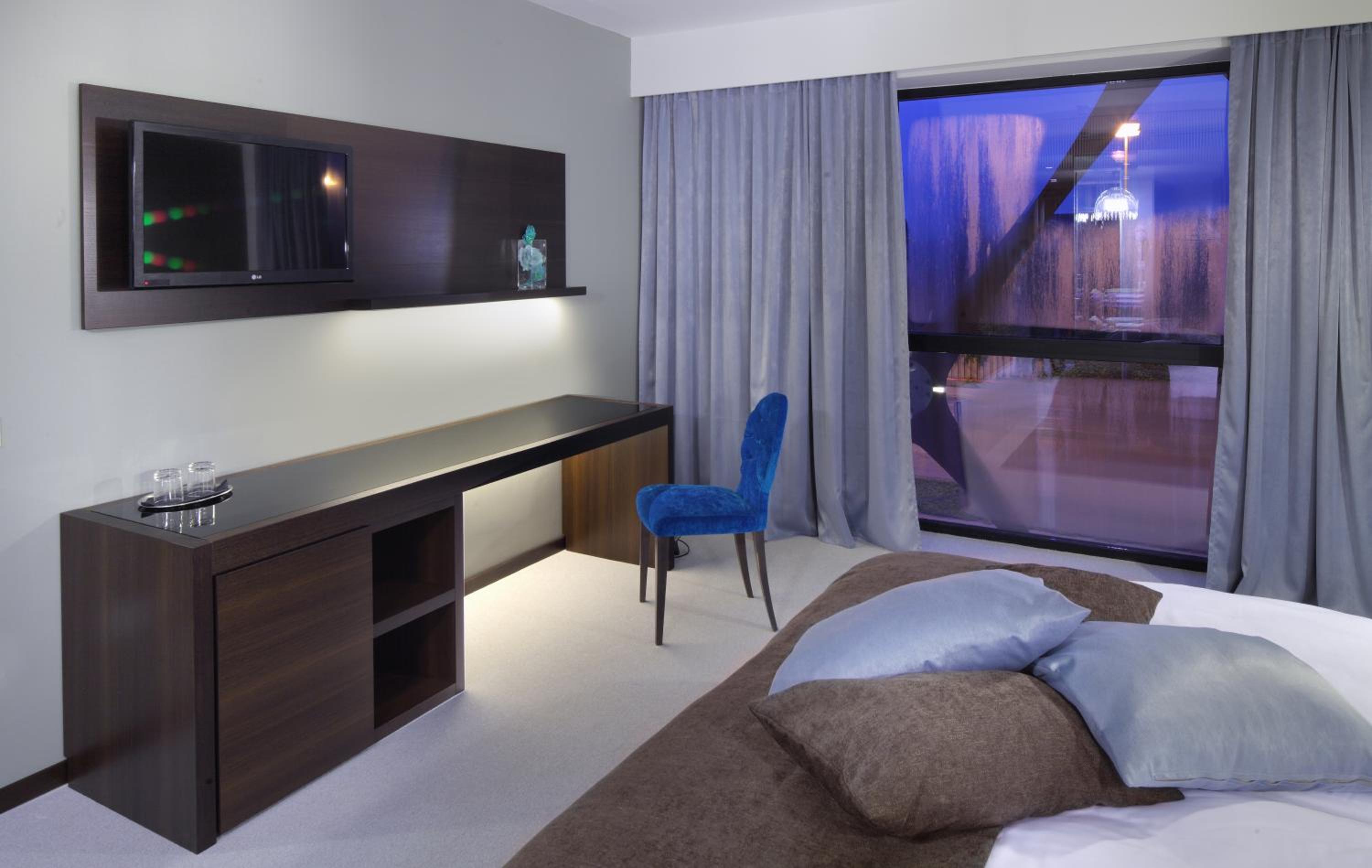 Hotel Nox in Šentvid, Ljubljana offers air-conditioned rooms with unique designs and stunning city views through large windows. Each room features modern decor and amenities like a flat-screen TV, minibar, and laptop safe.