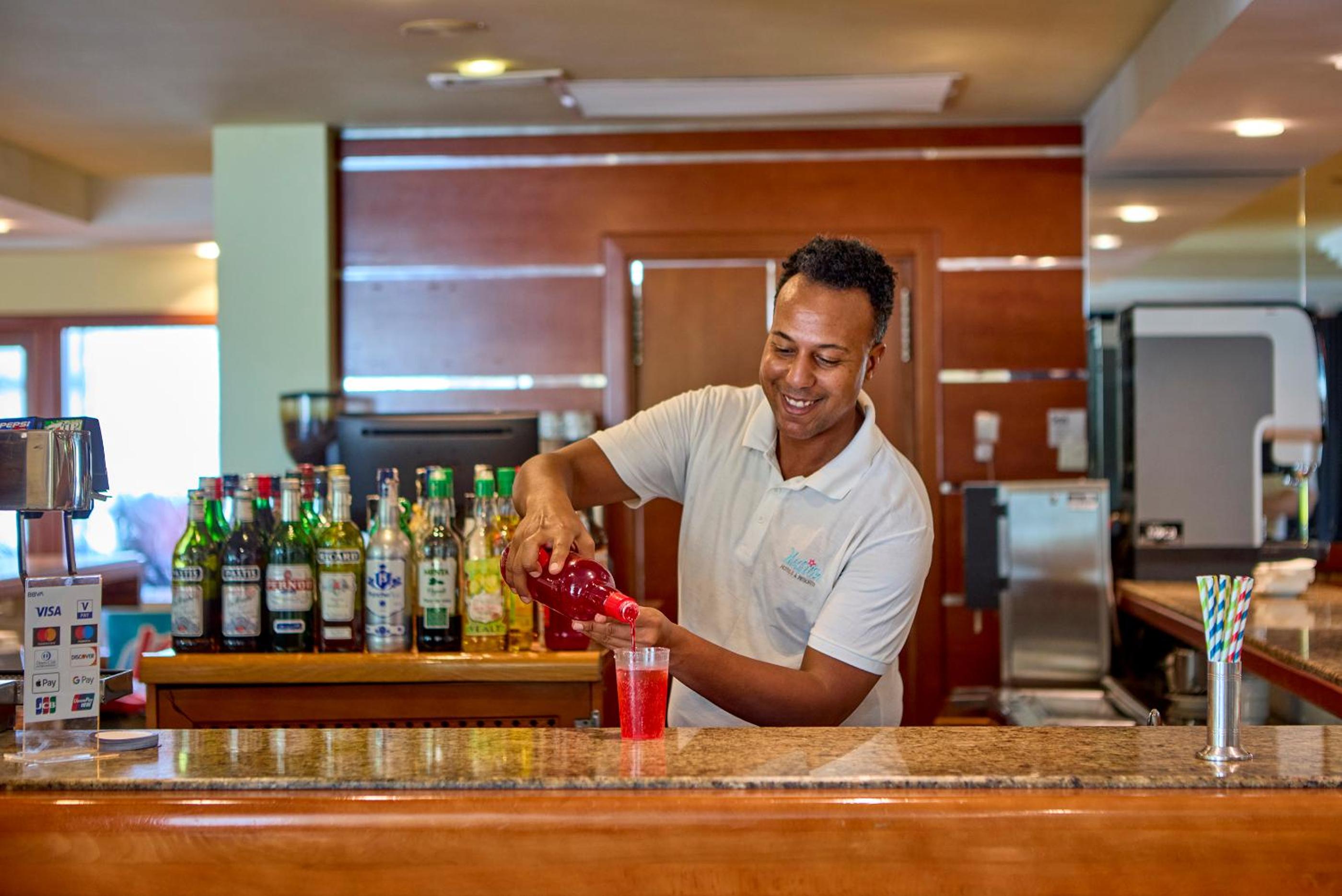 - Open bar service from 10:00 to 00:00, including beer, wine, spirits, fruit juices, soft drinks, coffee, tea and water.