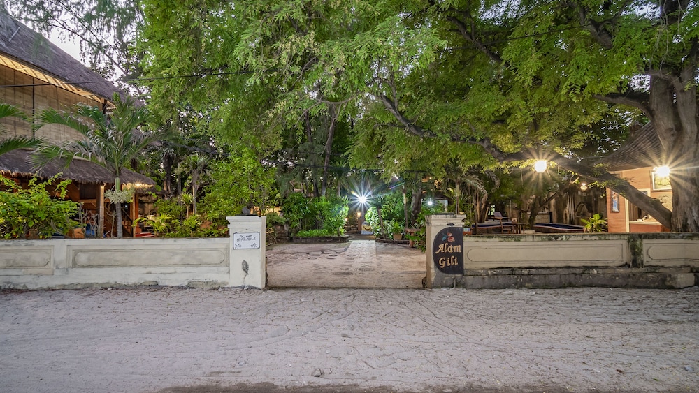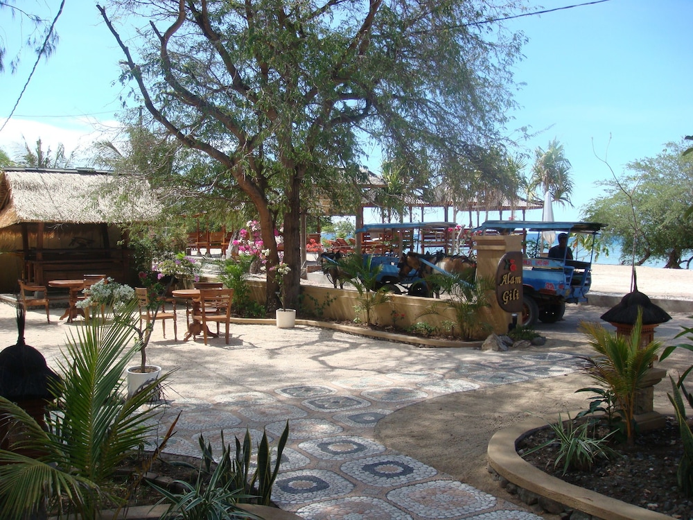 A lovely, shady property with established trees and lots of bird life and a clean freshwater pool (desalinated water). Excellent breakfast under the trees on the private beach and sun loungers, beanbags and hammocks to relax in. All the staff were wonderful and very helpful. No annoying reggae/hiphop/techno music from bars - only the sound of the birds, the sea swishing up the coral and sand beach and the clip-clop jungle of the horse taxis passing by! Boats don't beach here (the reef is very shallow at low tide) so there is no noise and fumes. We arranged for the hotel to pick us up from Lombok airport and our driver was very pleasant, drove very well and stopped happily for us to take photo's - be aware that a lot of drivers in Lombok are not licensed and their cars are not air-conditioned!!!! He saw us onto the speed boat which dropped us off directly in front of the hotel (it was high tide). It was well worth it and hassle free. Snorkelling directly in front of Alam Gili was stunning and we saw lots of turtles and fishes - you don't have to go to "turtle point". It's a short walk to restaurants on the shorefront and a bicycle ride away to the hectic harbour area. Bring a head torch if you walk or cycle inland after dark! Bikes are for hire - standard rate everywhere Rp 50,000 a day. There is no fridge or kettle in the rooms but water bottle refills are free and they serve delicious free cake and afternoon tea. The bungalows are clean, comfortable and spacious but they are in need of some t.l.c. and updating as they are looking tired and worn. There is a lot of development on the NW coastline and Alam Gili needs a facelift in order to compete with these other properties but I hope it retains it's original charm and character as it is a delightfully relaxing place to stay. Loved our stay and the peace and tranquility here.