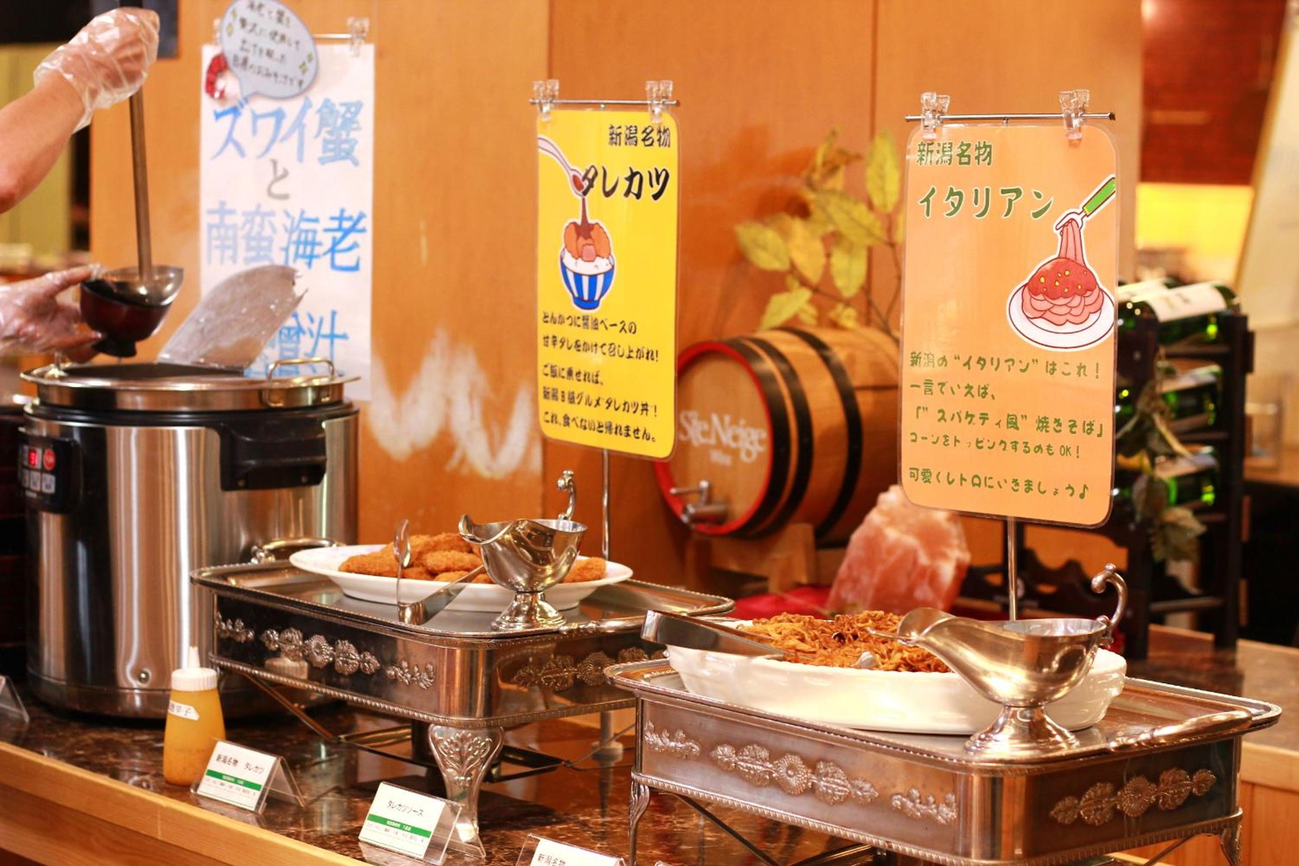 食事は、バイキング方式でした。内容は、ほぼ子連れファミリー向けの内容で、カニ好きのファミリーには最高と思われます。が、その他の客層には不向きです。アルコールも高いです。布団はセルフで敷くとのこと。食堂の案内の女性もマンパワー不足なのか、汗かきながら奮闘していました。これらを加味しても、値段をもう少し安くしてもよいのではないでしょうか。ファミリー向け、スキー客の若者グループ向けの宿です。