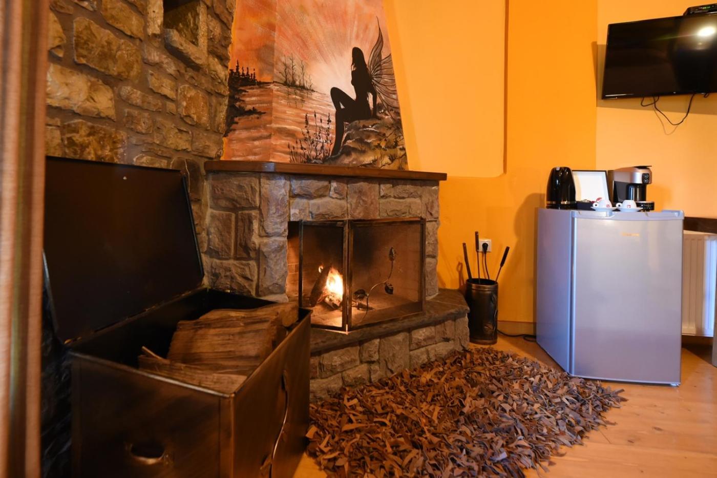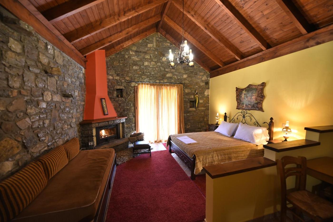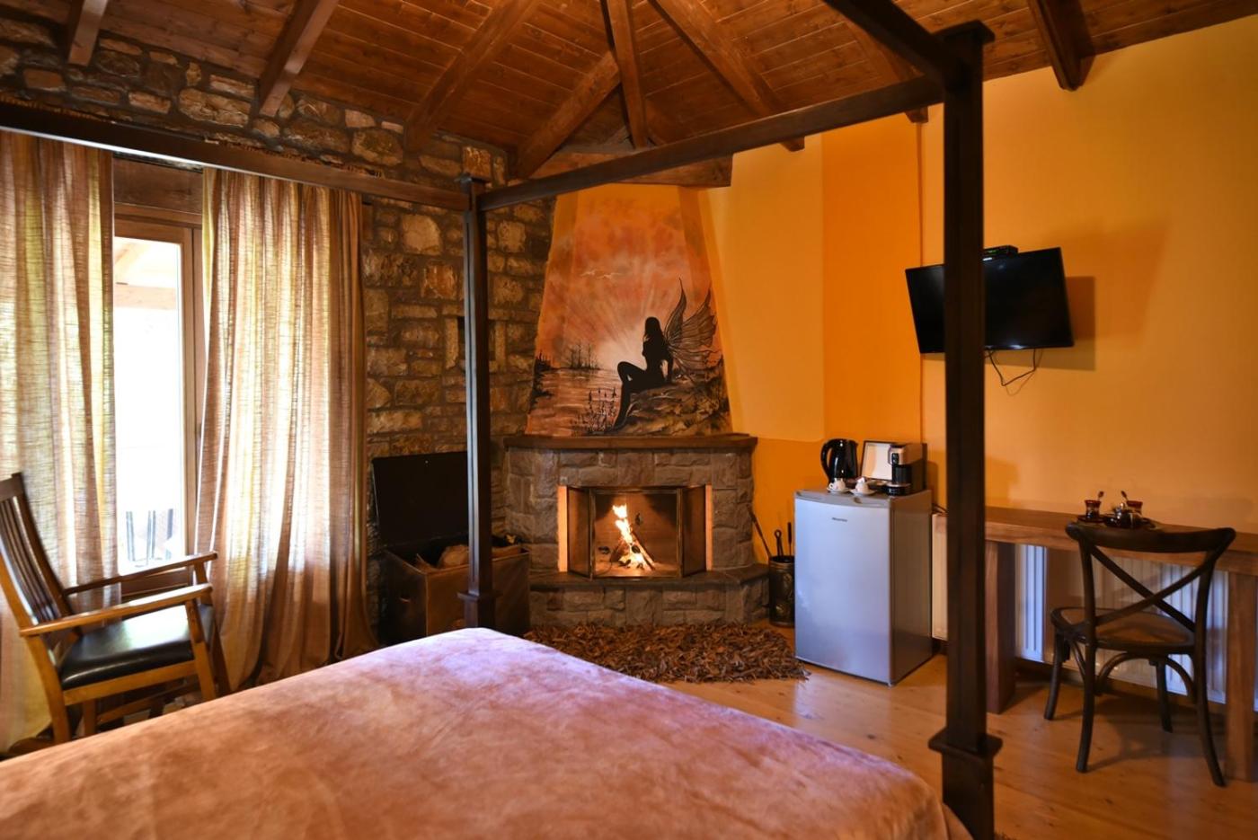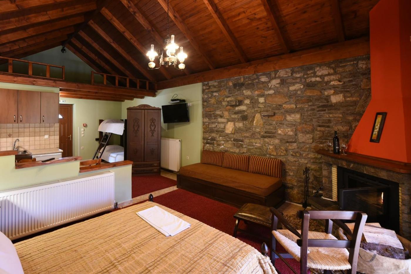 Traditionally Decorated Accommodation: Experience warm colors, stone walls, and wooden ceilings in our rooms, each equipped with an LCD TV and fridge. Select units feature a kitchenette and fireplace for added comfort.