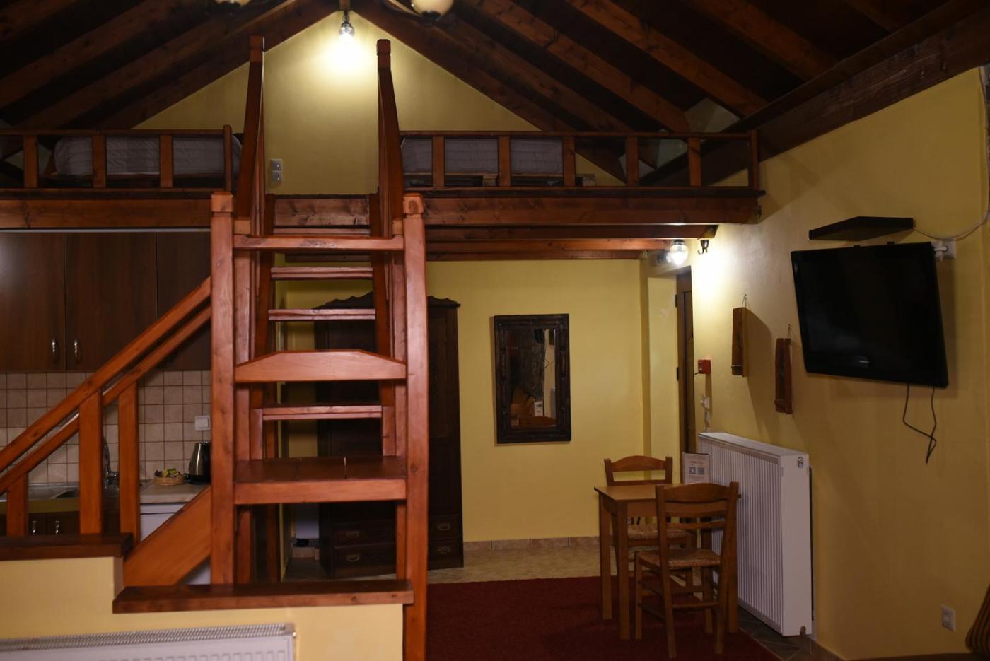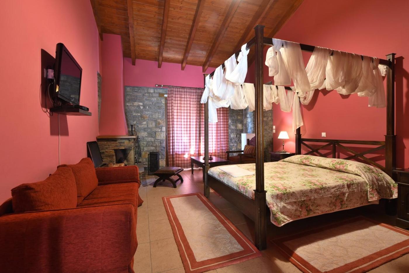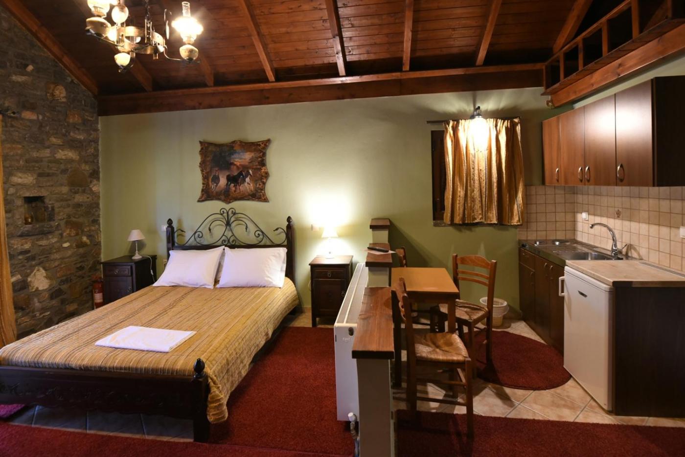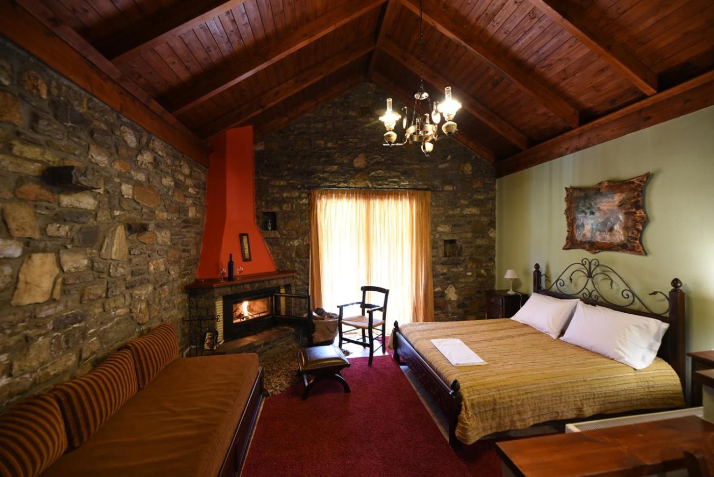 Traditionally Decorated Accommodation: Experience warm colors, stone walls, and wooden ceilings in our rooms, each equipped with an LCD TV and fridge. Select units feature a kitchenette and fireplace for added comfort.
