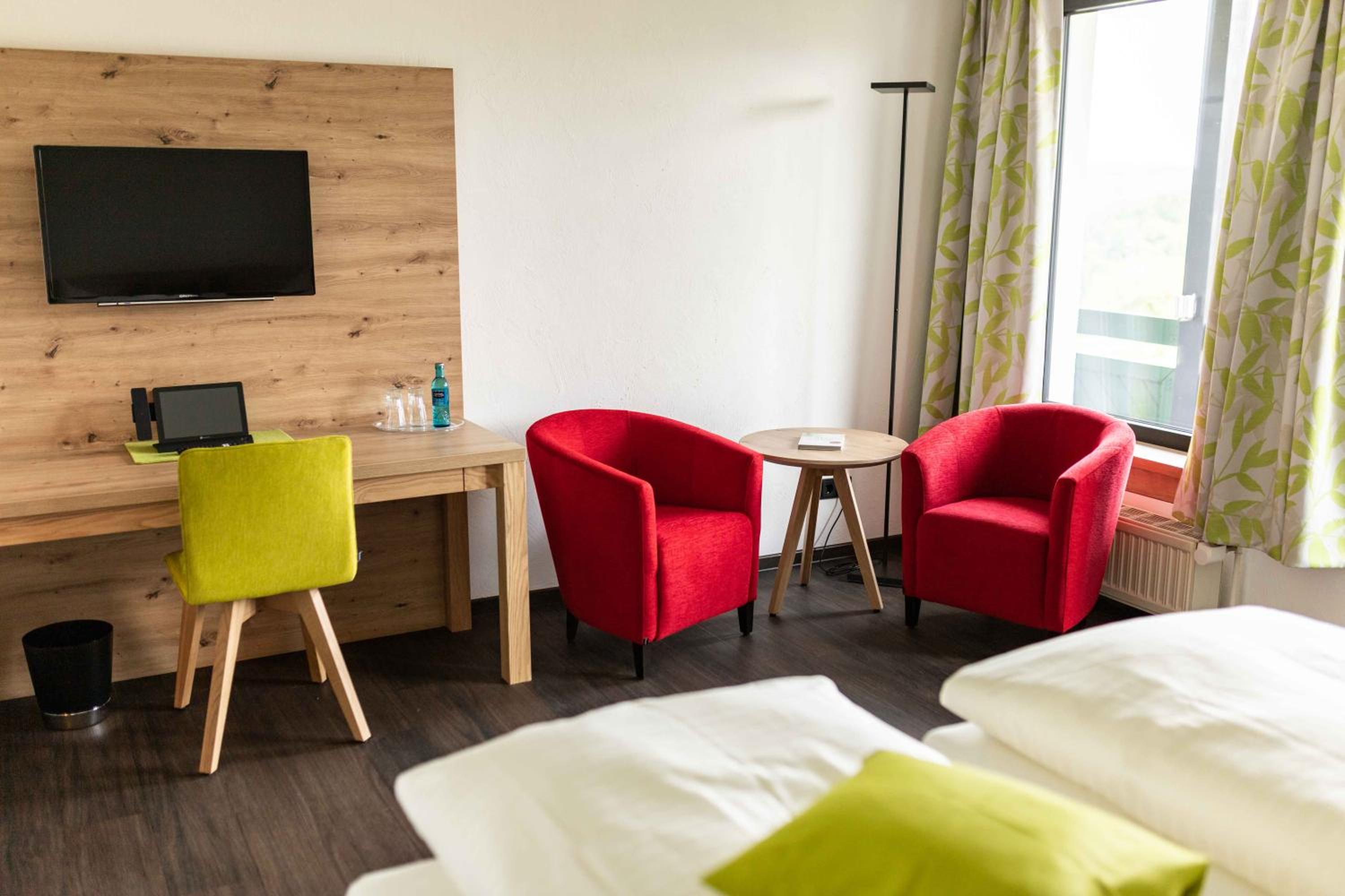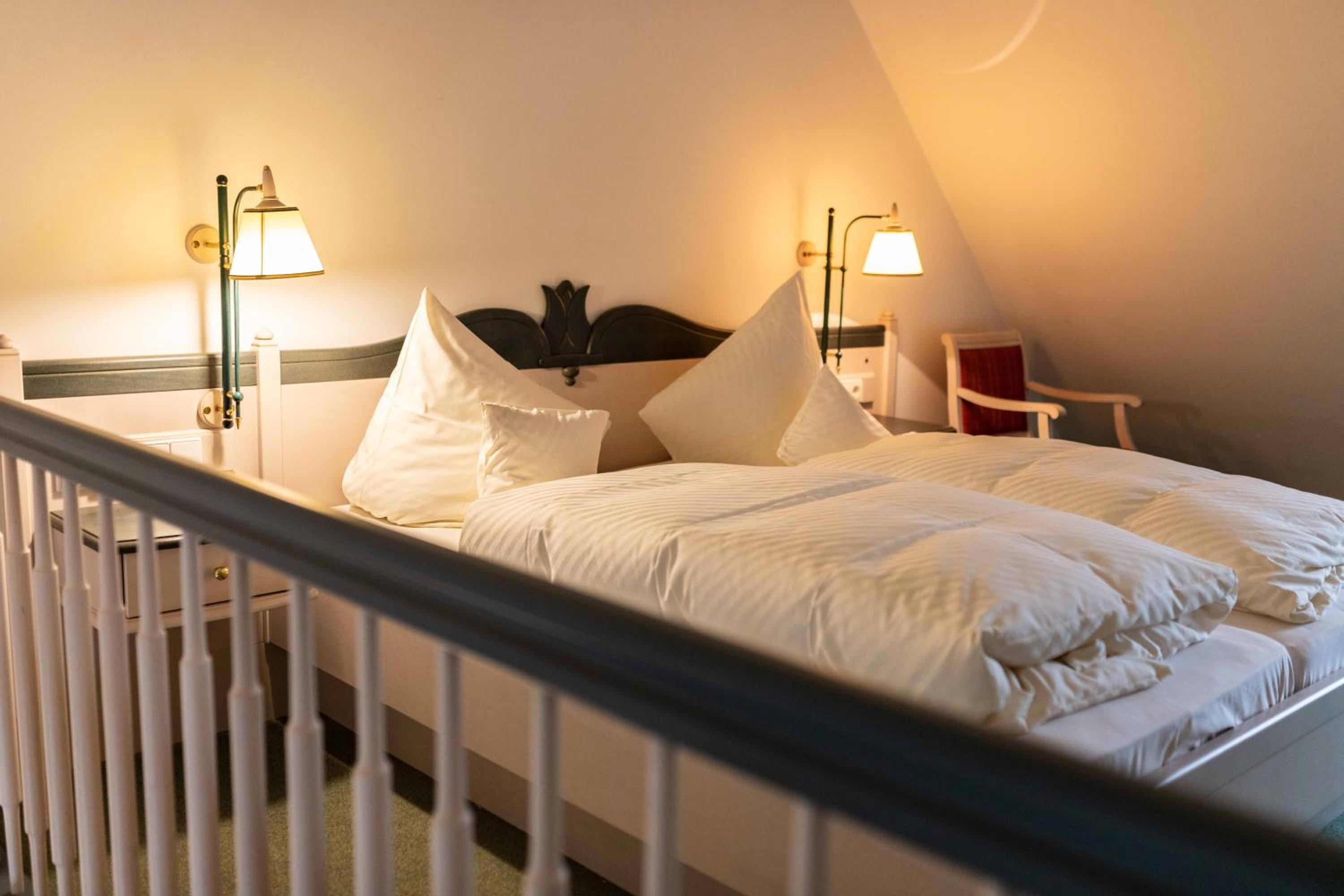 Very nice room, comfortable beds, comfortable chairs and a desk. Plenty of space. We had a room with access to the garden. Hens in the garden, horses, sheeps and lambs nearby. Really cozy. Nice view. No kettle or coffee machine but got coffee and tea on a tray early morning that I picked up at the restaurant