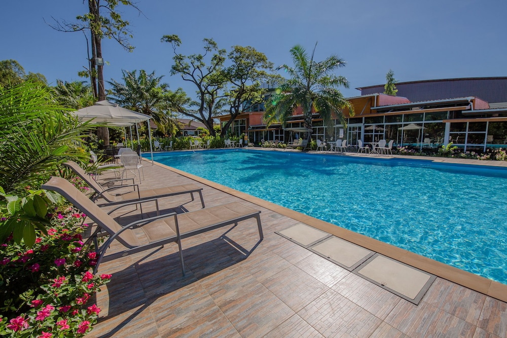 The hotel is big with pool. Room is spicy and comfortable.