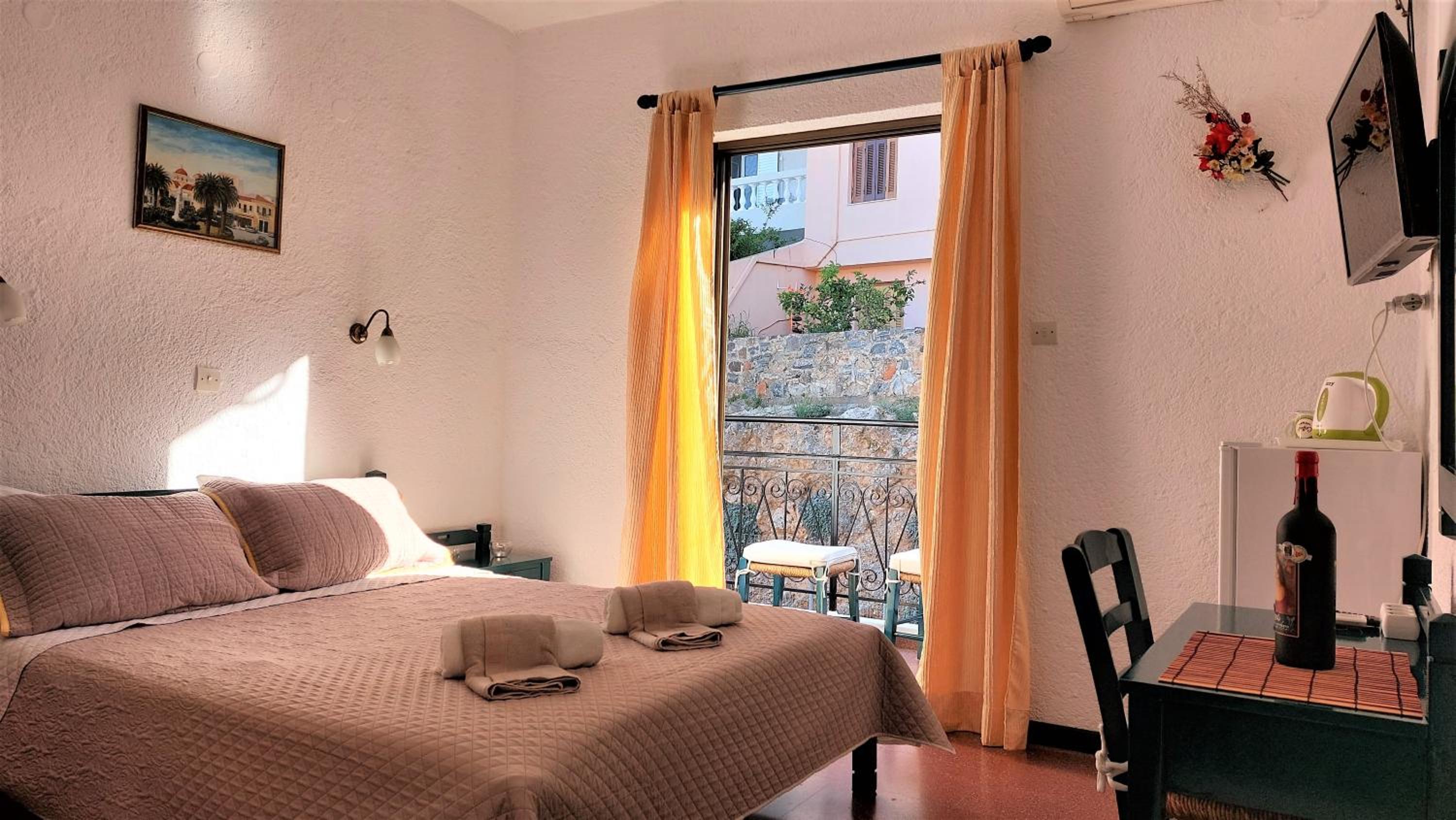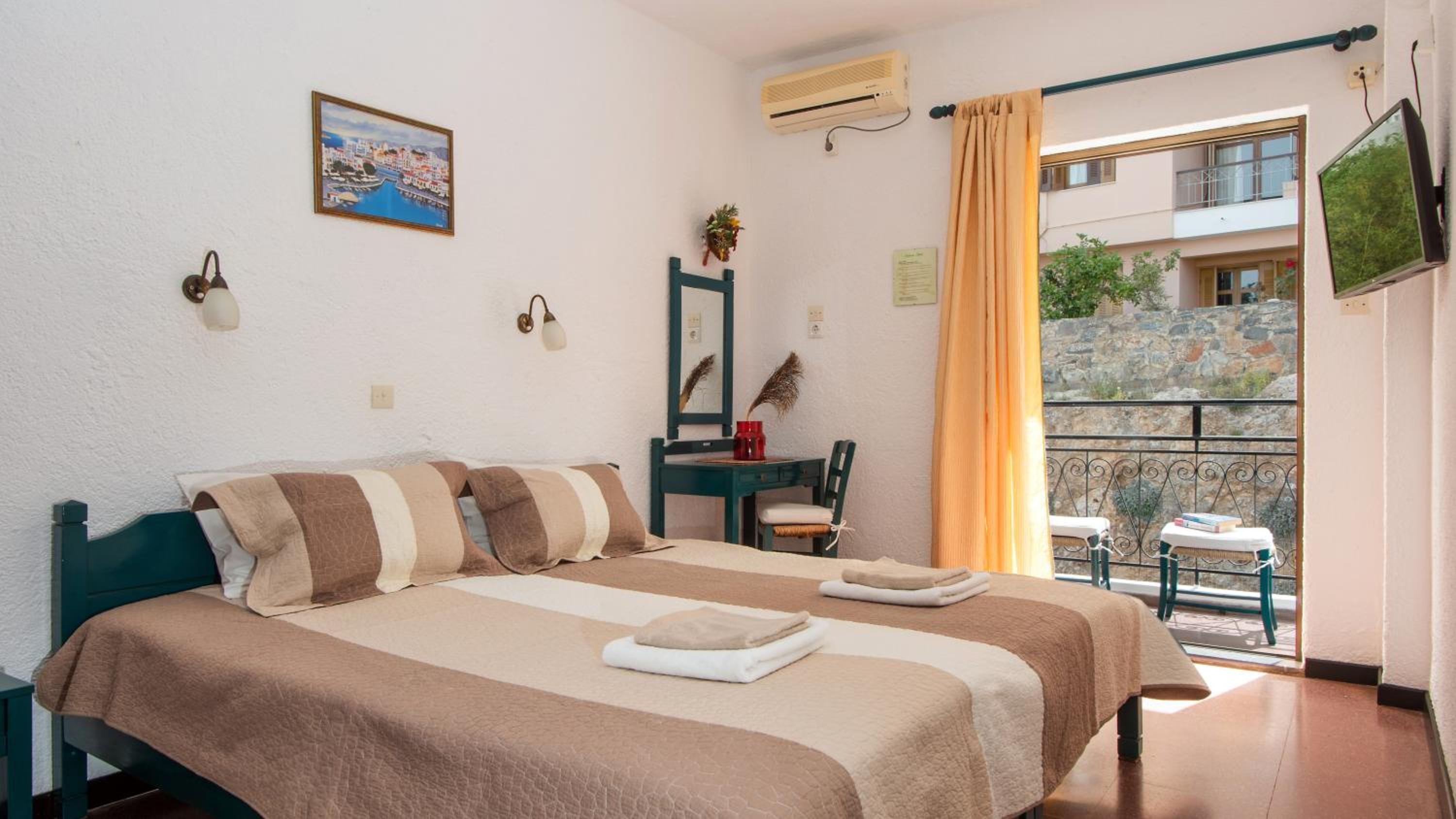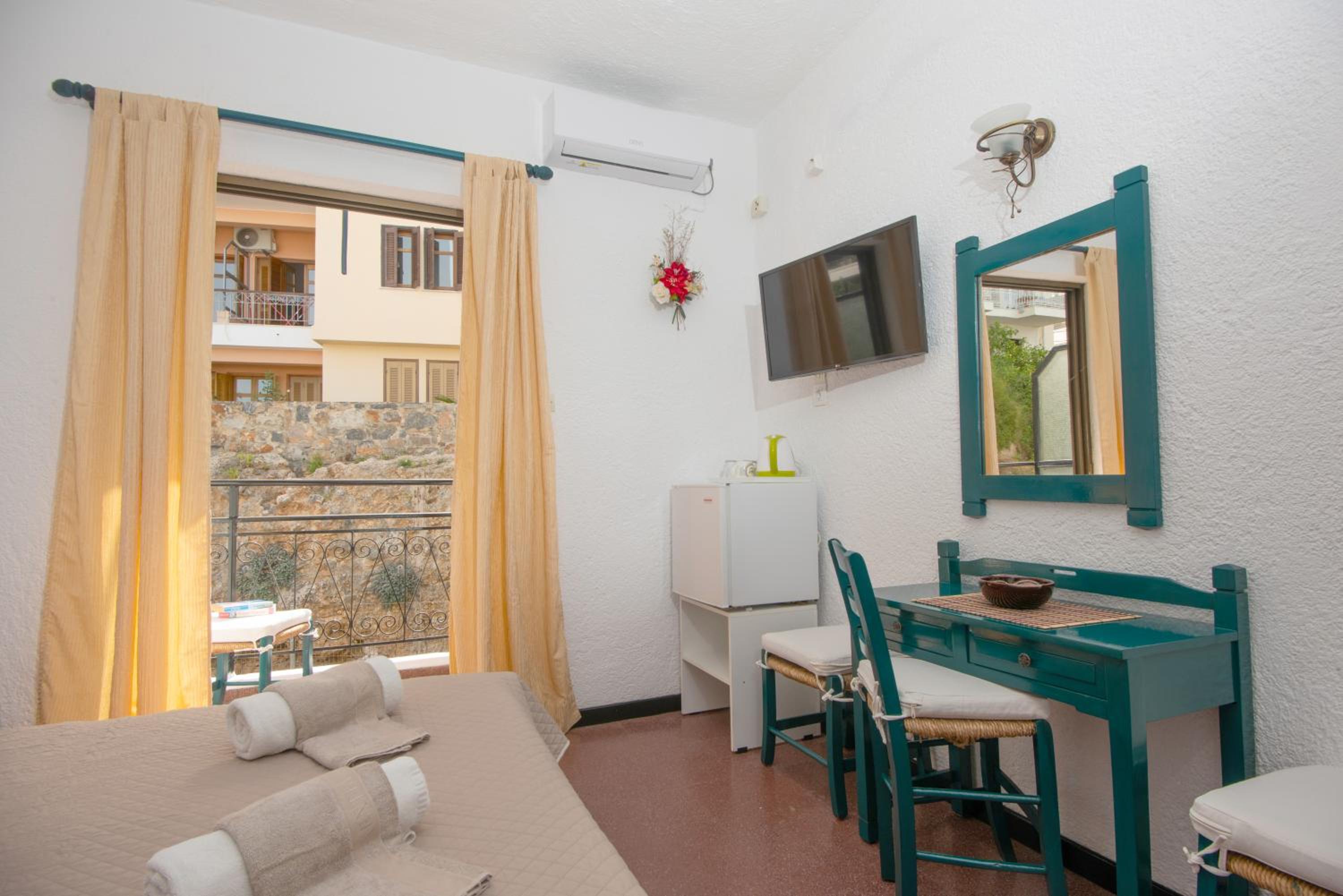 The en suite rooms at Hotel Victoria are thoughtfully furnished with amenities to ensure a pleasant stay. Each room includes a TV, a small fridge, and air conditioning. Some rooms even feature a balcony with stunning views of Agios Nikolaos Bay.