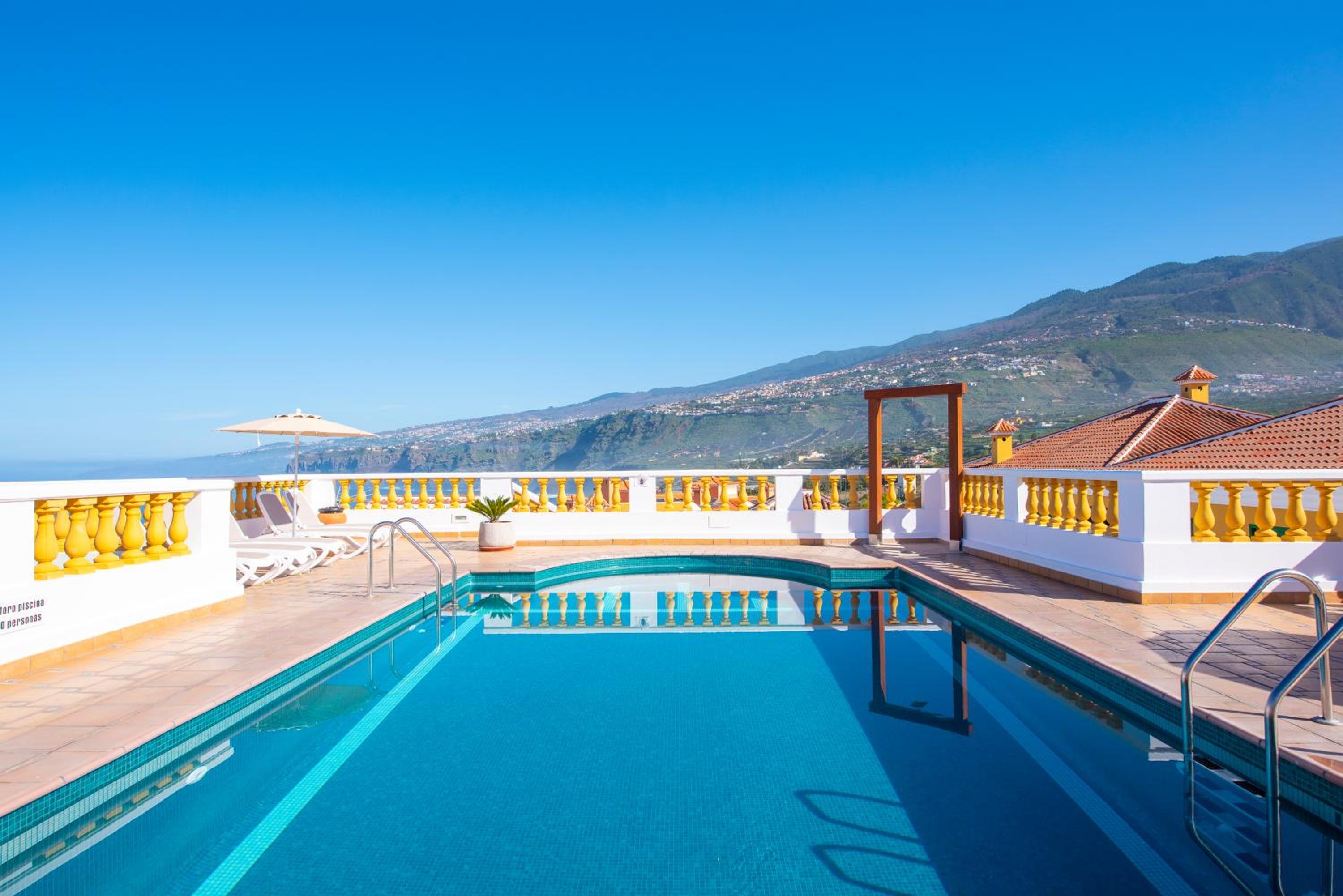 Piscine rafraichissante et calme tout autour équipée de transats avec vue panoramique sur Le Teide, la ville et l'océan.