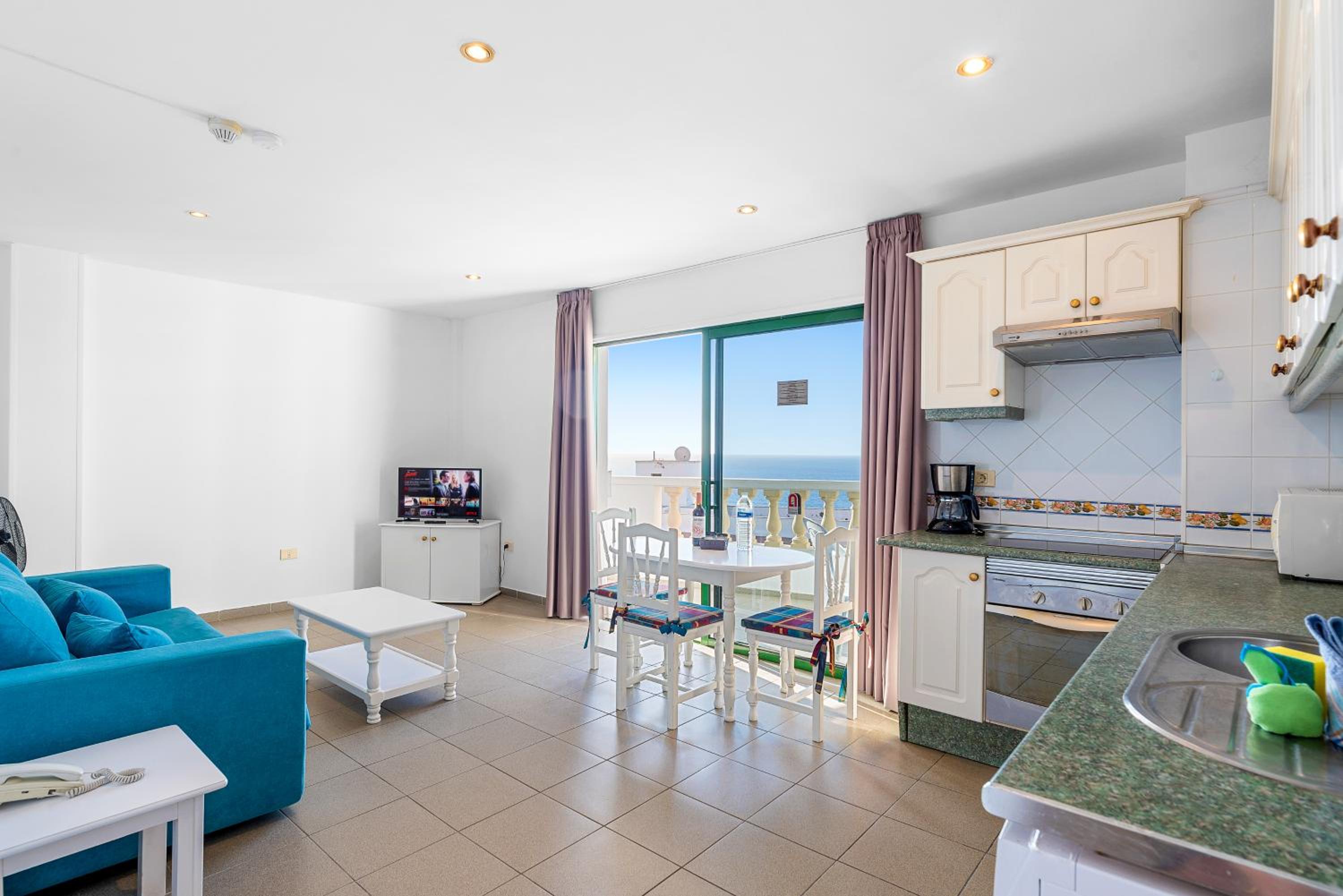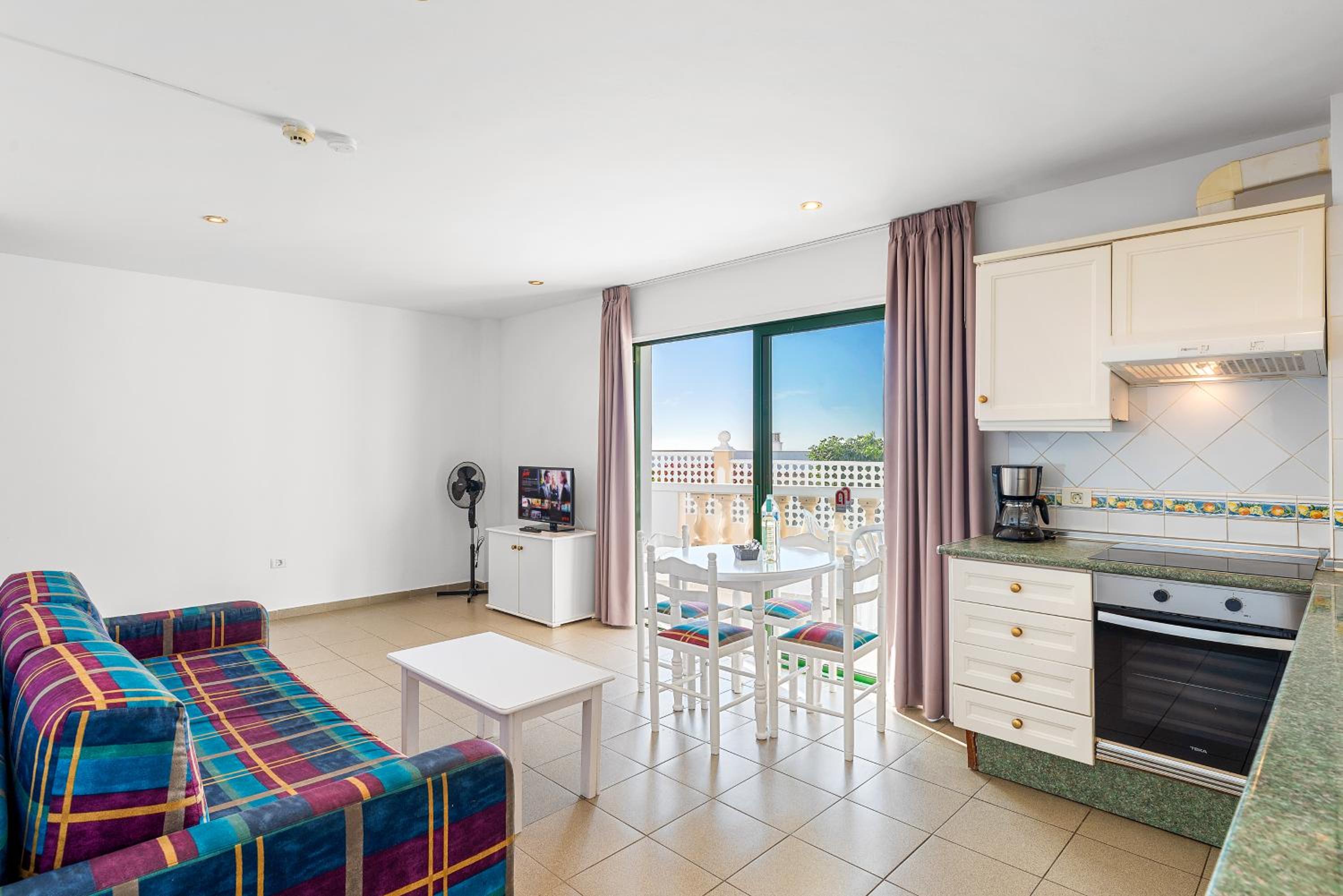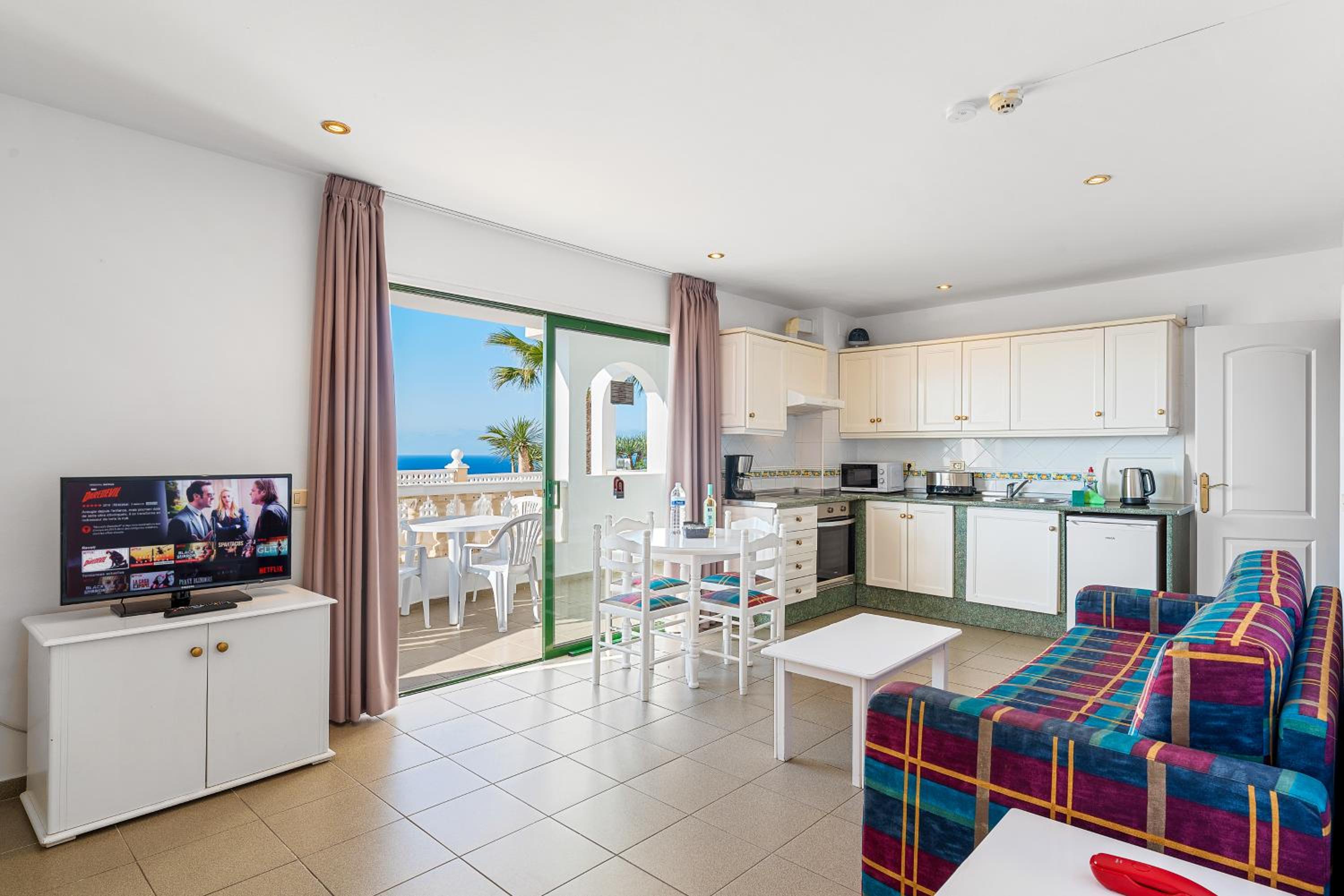 The apartments at Club Tarahal offer a comfortable stay with a range of amenities including a kitchen with essential appliances, TV with multiple channels, and private terraces or balconies with scenic views.