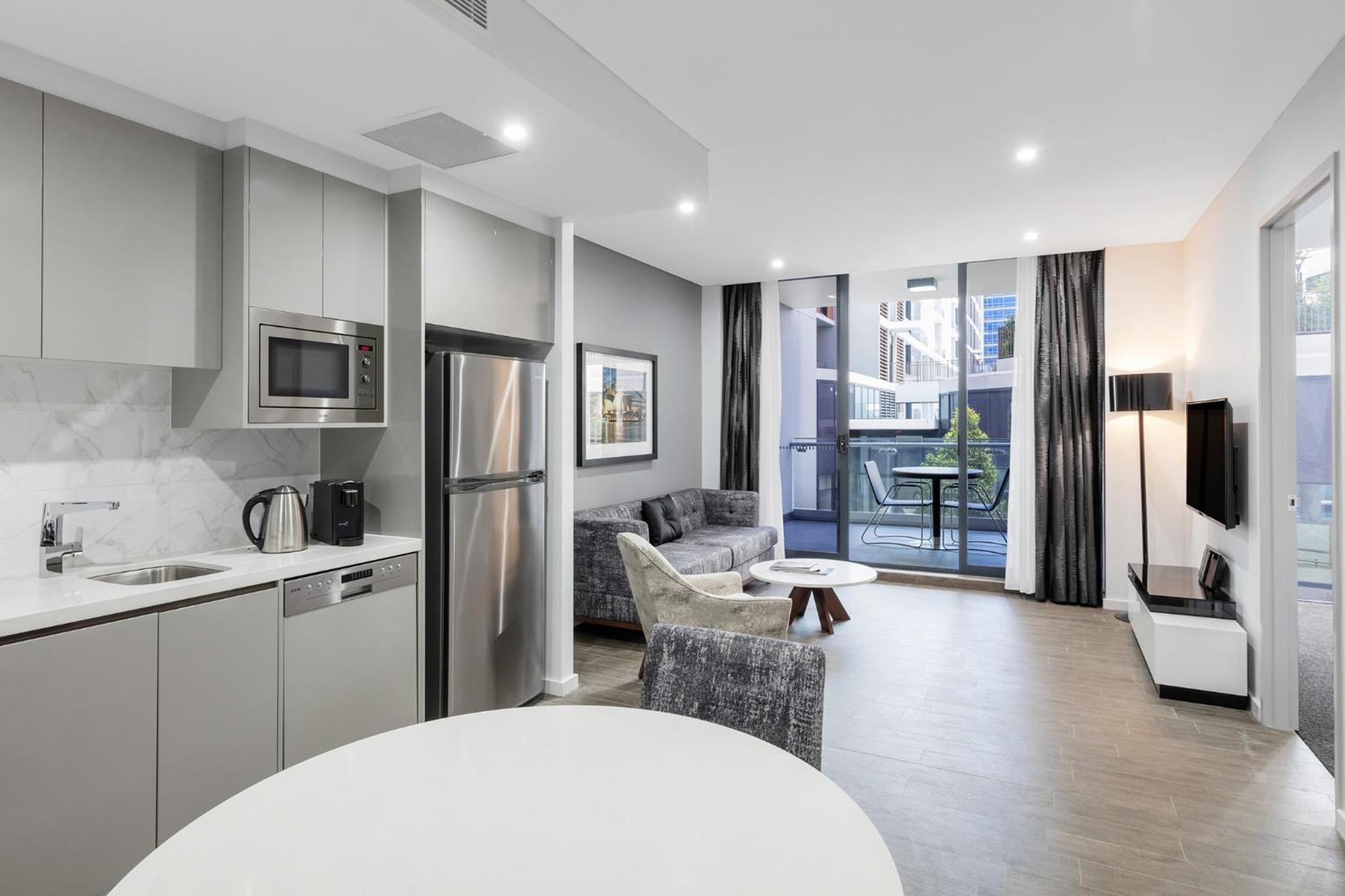 Meriton Suites Mascot Central offers spacious suites with fully equipped kitchens, laundry facilities, and balconies in most rooms. Enjoy the comfort of a home away from home during your stay.
