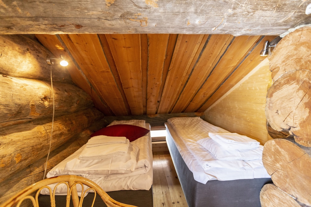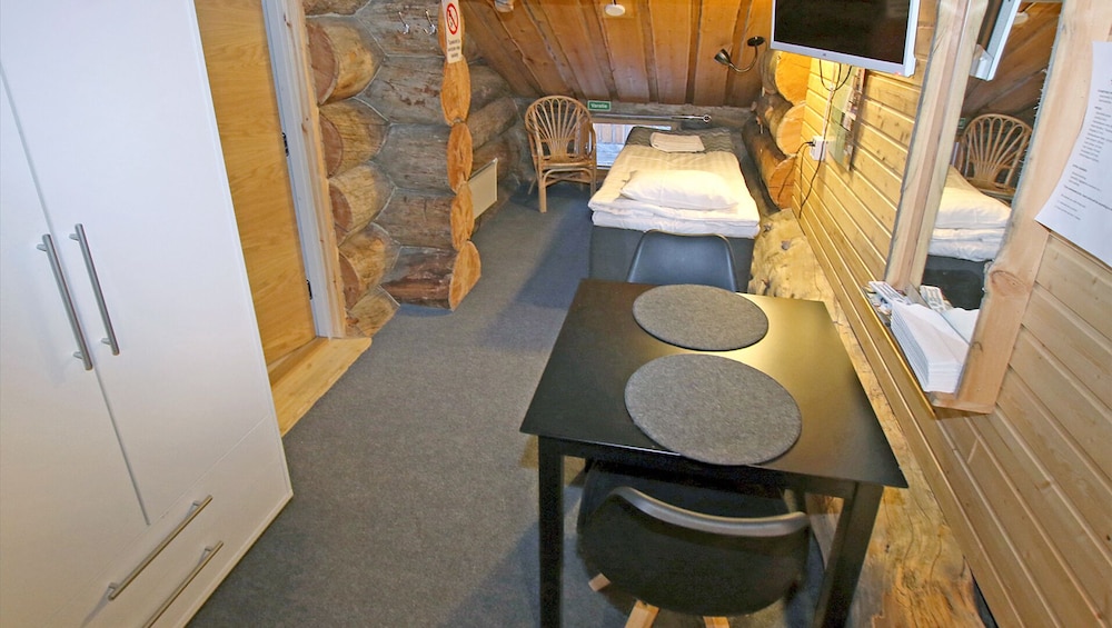 Siisti, hyvin varusteltu mökki. Sängyt oli pedattava itse. Pimennysverho ei estä keskiyön aurinkoa paistamasta yhteen sängyistä.