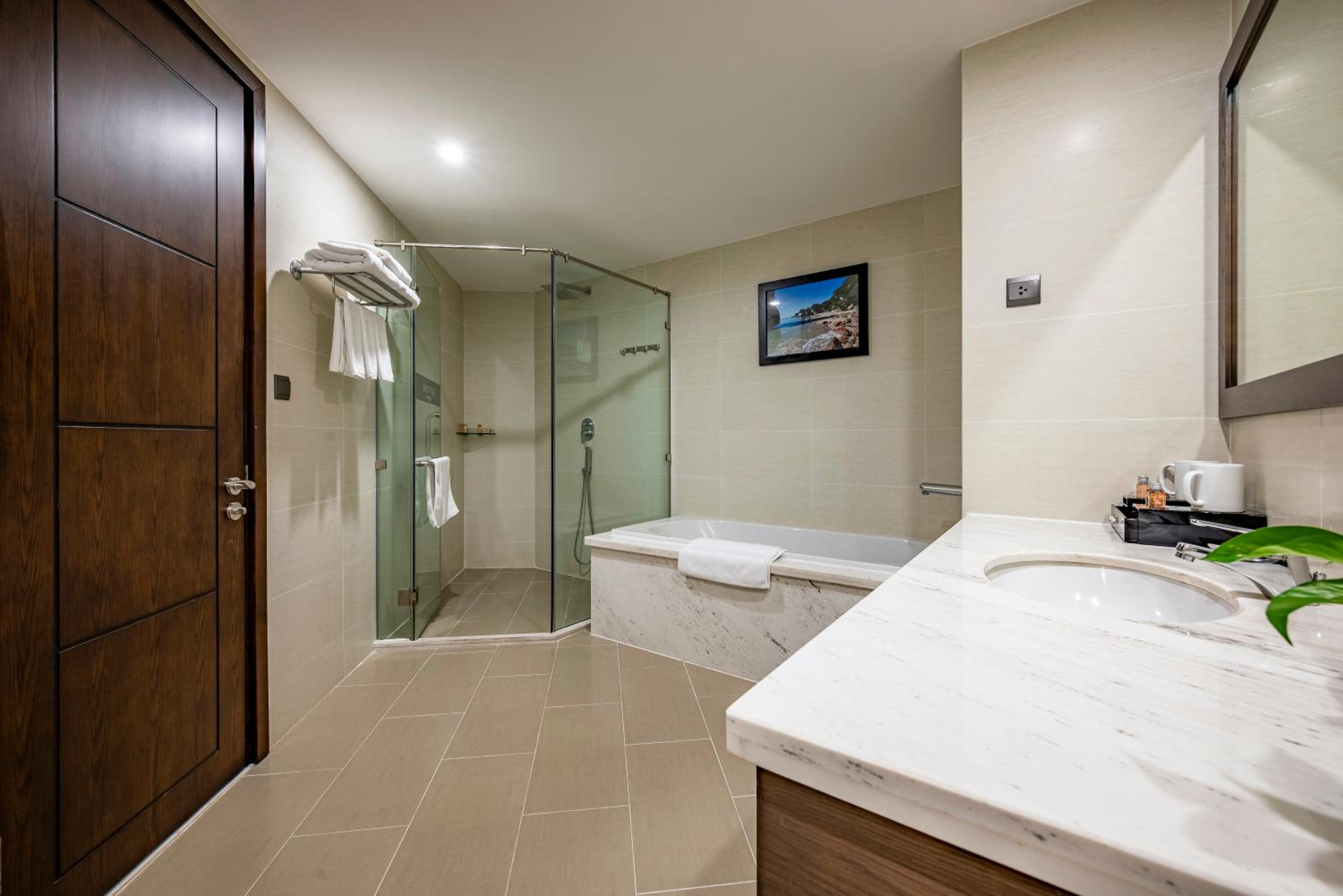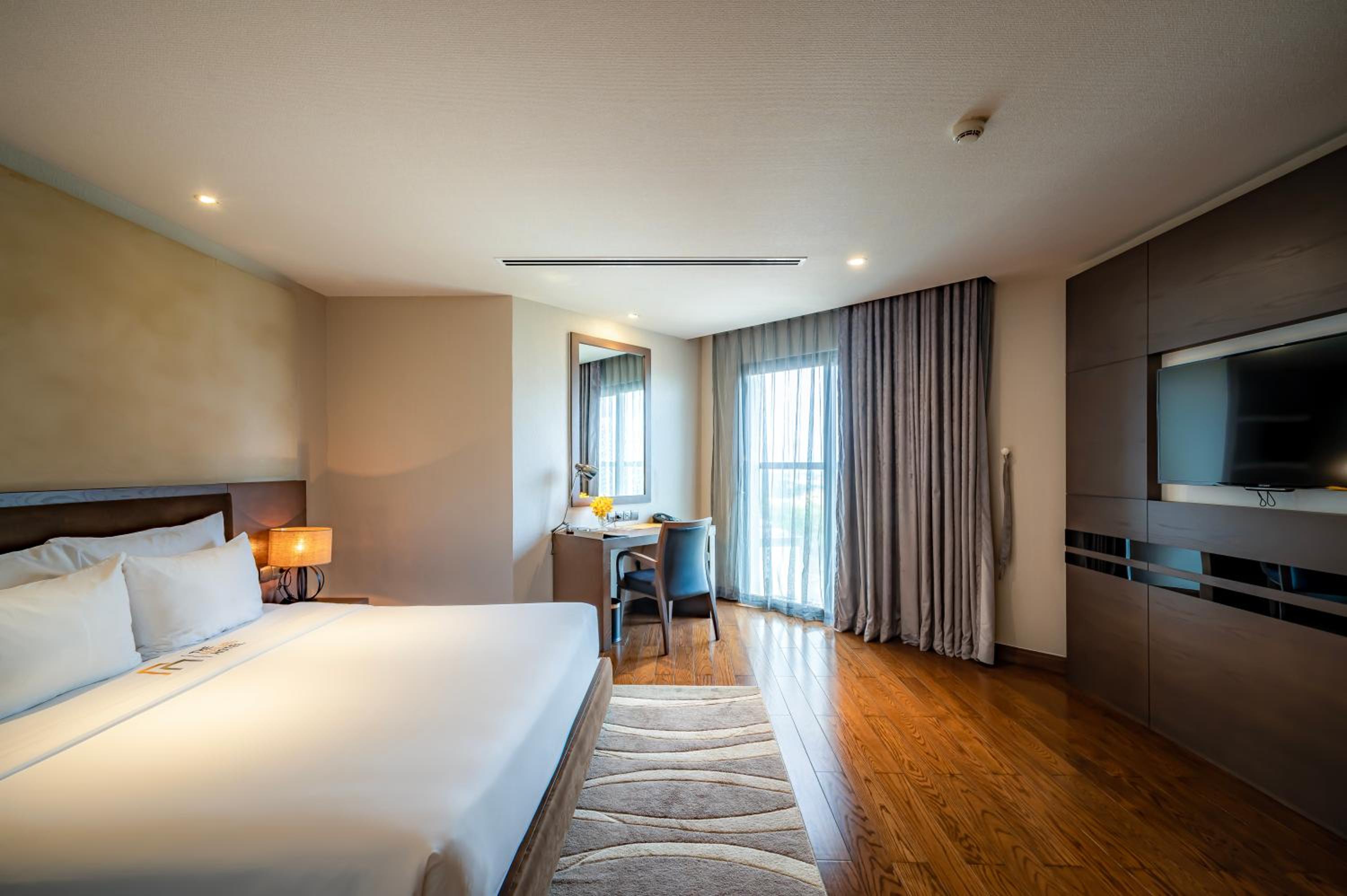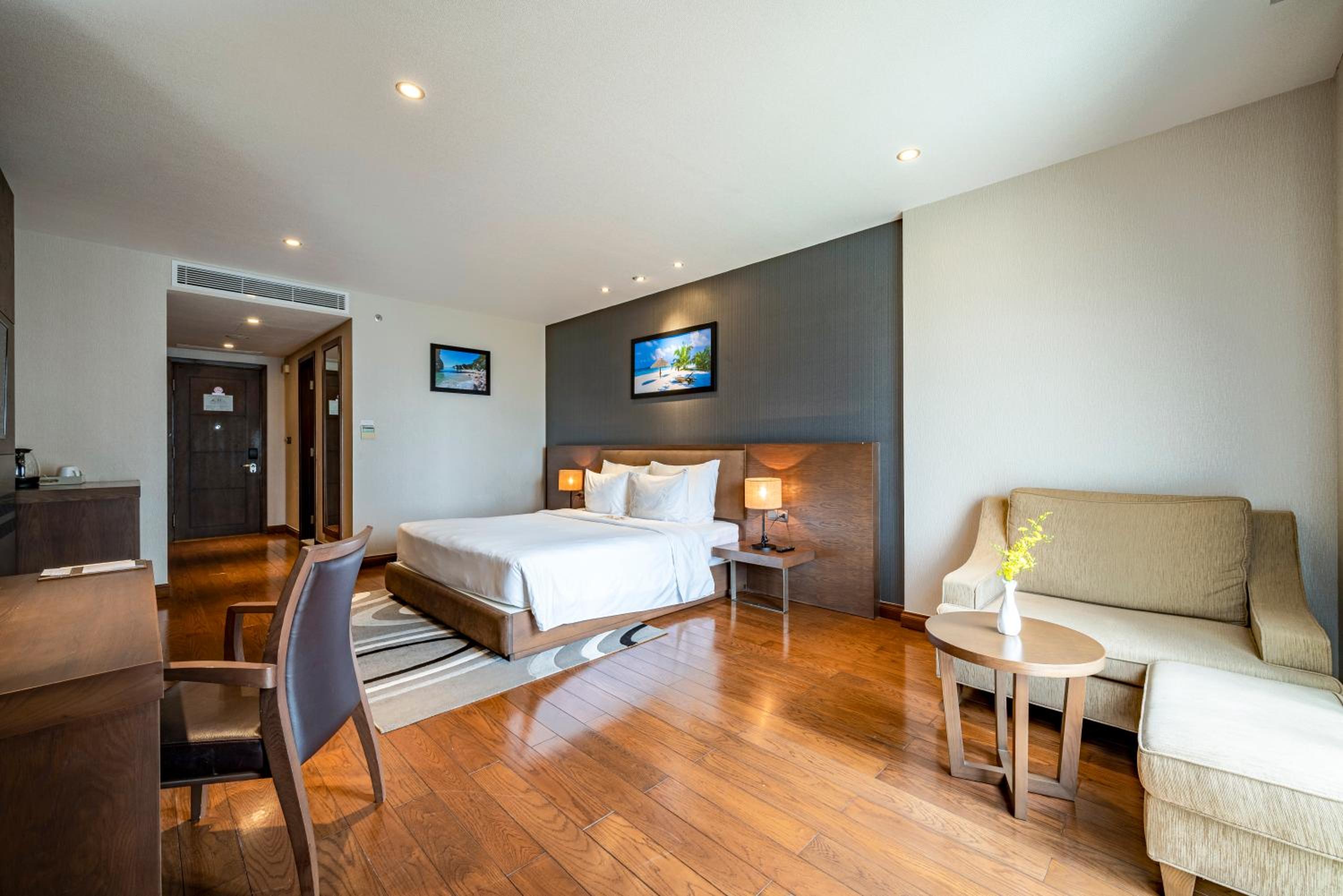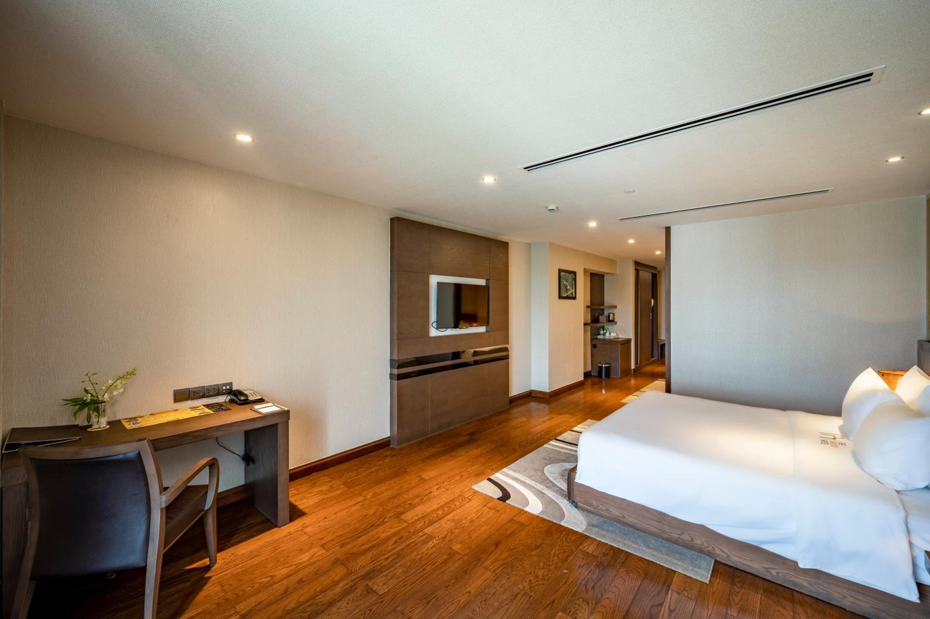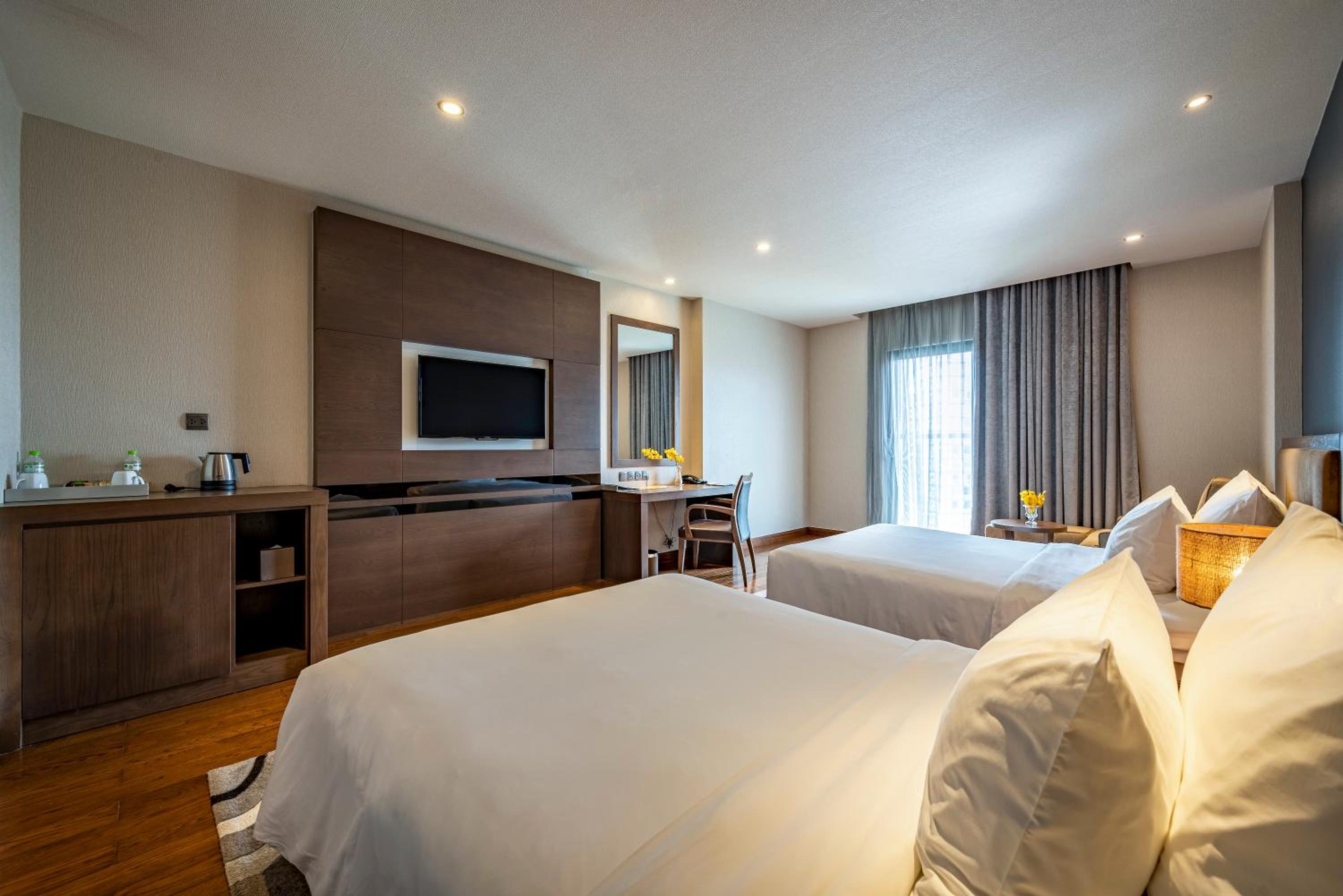 Experience luxury in every detail with well-appointed rooms featuring chic décor in woody and neutral tones. Enjoy modern amenities such as a flat-screen TV, private balcony with scenic views, and a stylish en suite bathroom with a deep bathtub. Complimentary beverages in the minibar add an extra touch of hospitality.