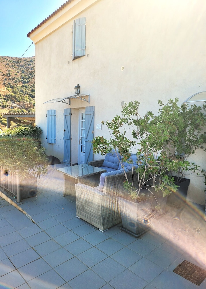 Ligger i en trevlig liten bergsby med utsikt över havet, bergen och landskapet.
