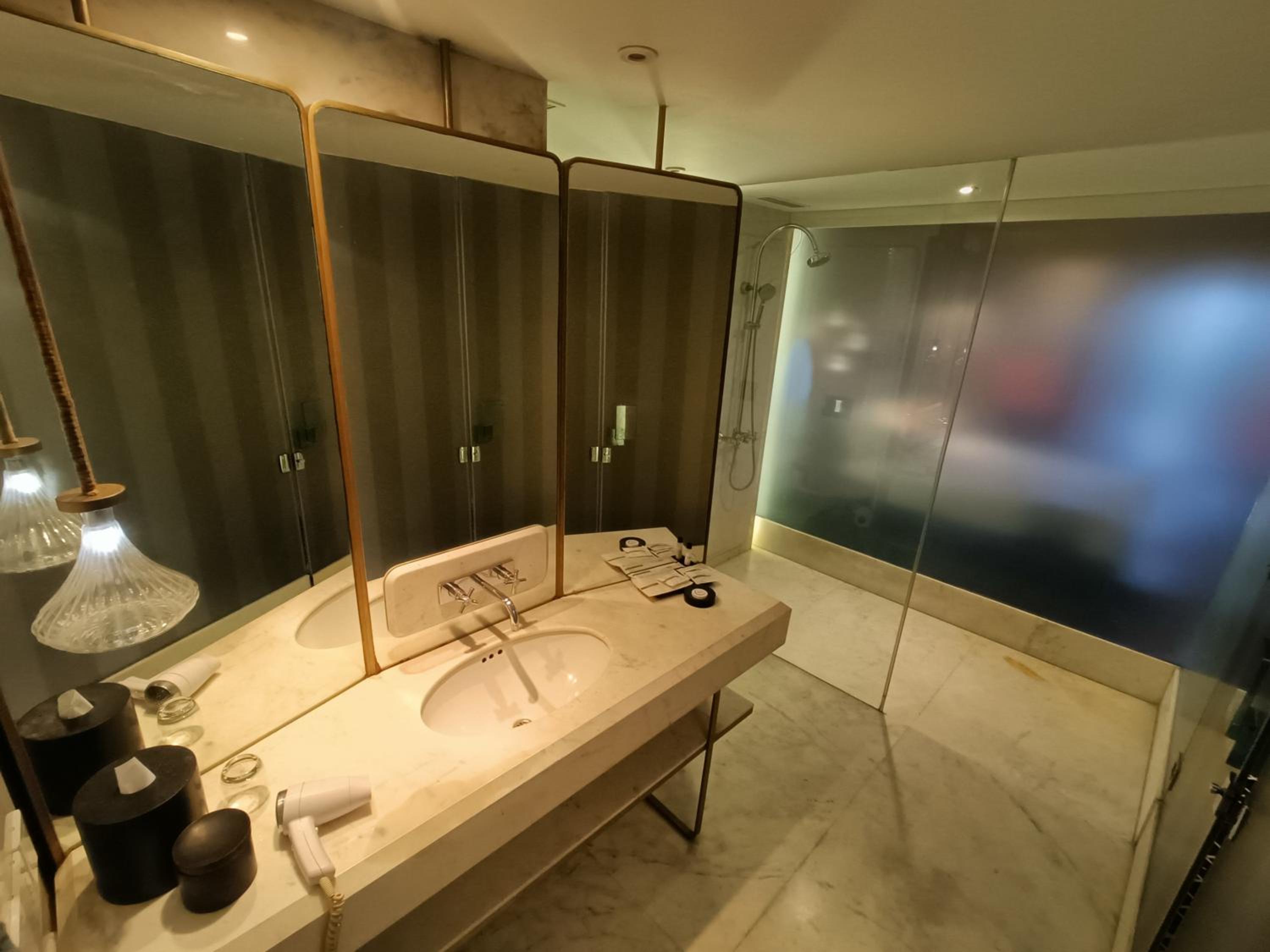 Shower is clogged due to salt, shower cubicle glass is full of salt and replenishment of coffee and creamer is not done.