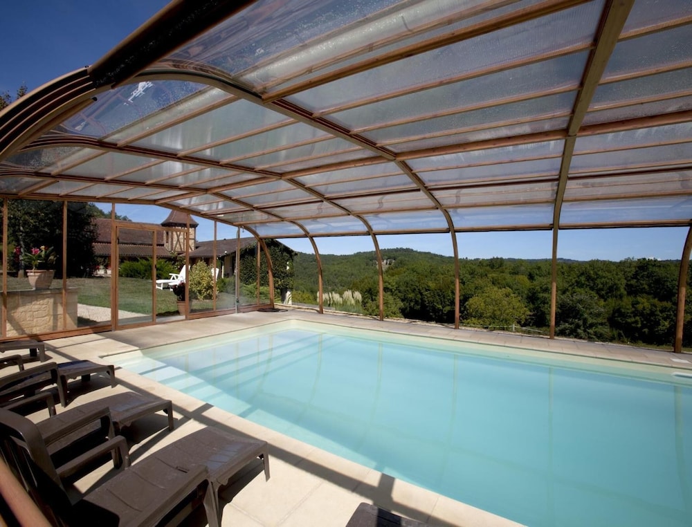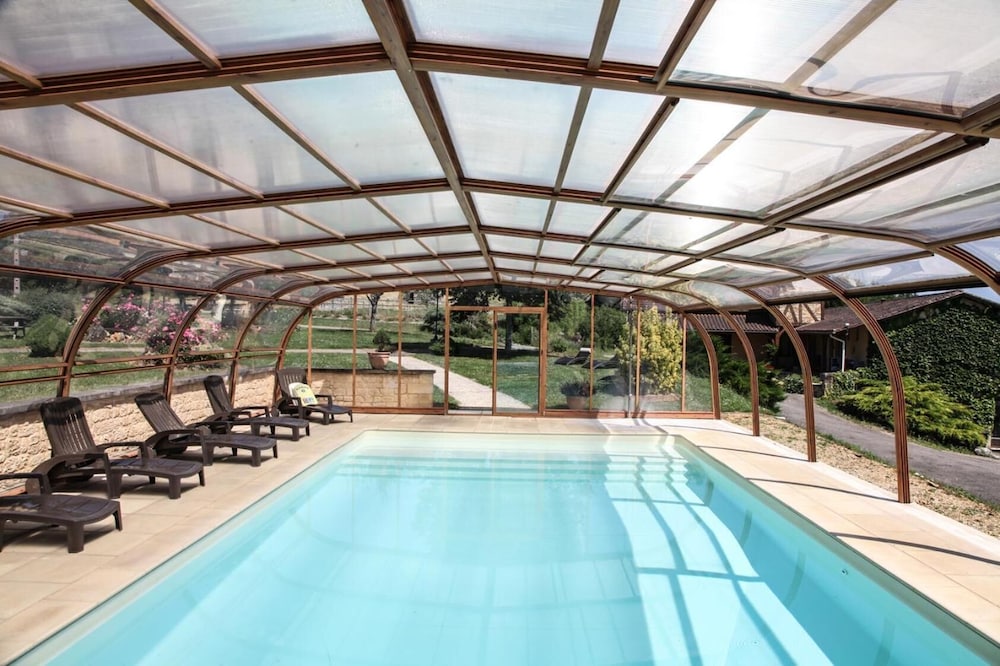 Unwind in our indoor pool and take in the serene garden views at Domaine de la Rhonie.
