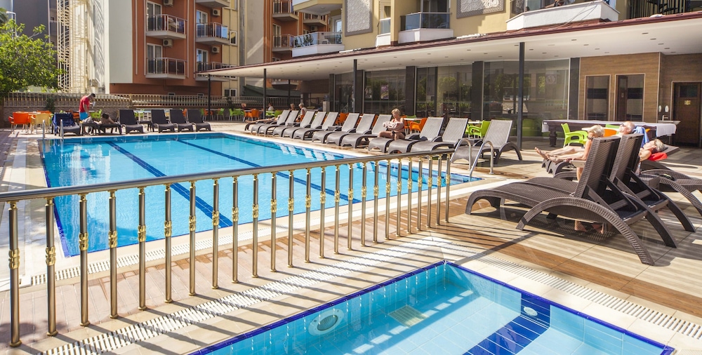Enjoy the outdoor pool and sauna at Kleopatra Ada Beach Hotel for a relaxing stay.