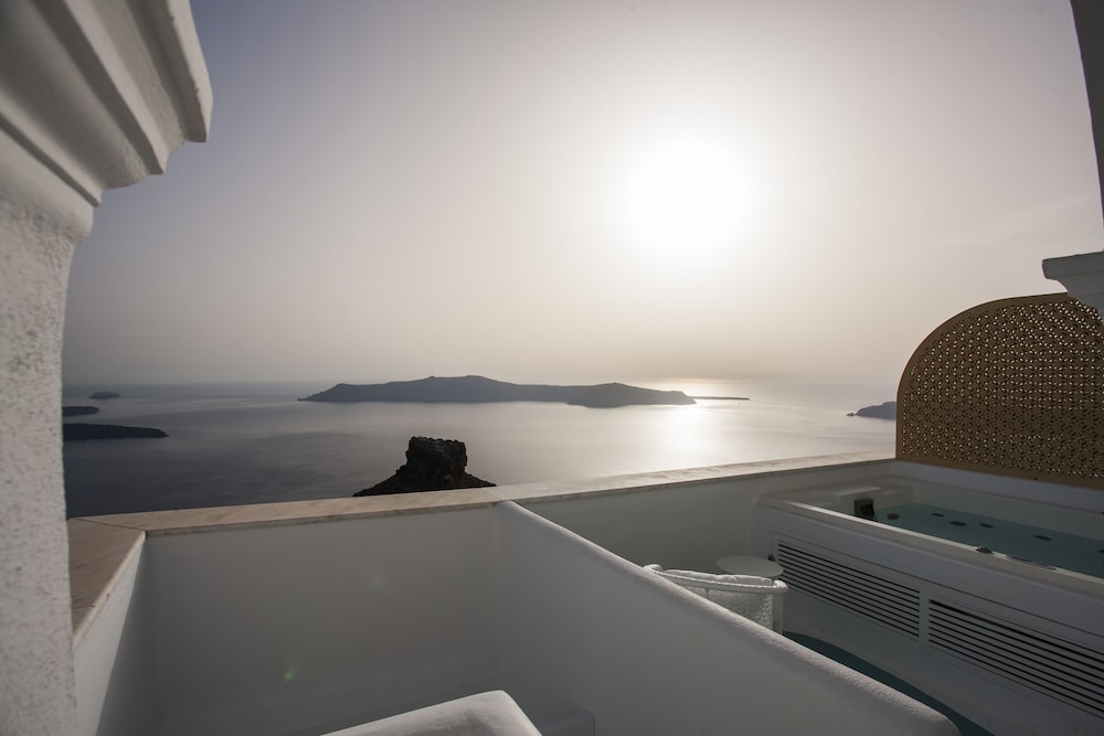 This hotel is perfectly located with the best view in Imerovigli. It is worth the stay for that feature alone. It is a small boutique hotel (6 rooms). The staff are very friendly and attentive. We had an upper room with balcony (no hot tub) and it was great. The lower rooms have hot tubs. I recommend Imerovigli over Oia. The view is just as good (better if you stay in this hotel) and you avoid the heavy commercialized atmosphere and over crowding of Oia. 5 Stars well deserved in my opinion!